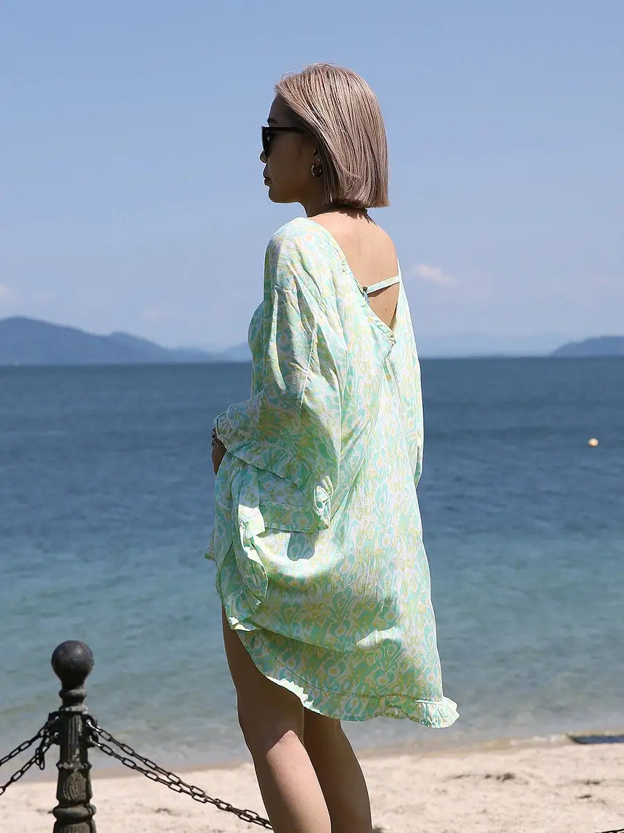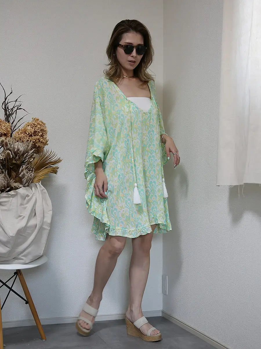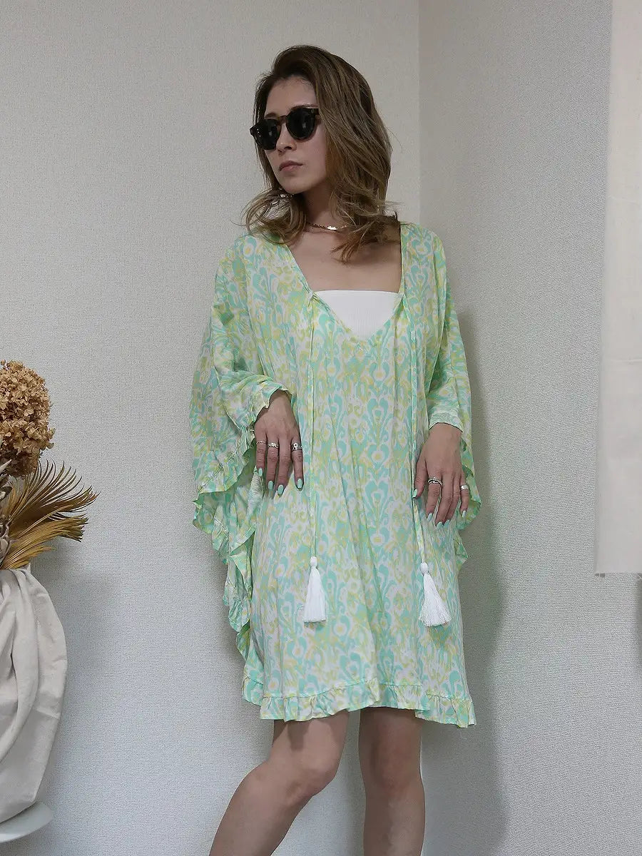 ビーチ・リゾートシーンで映えるオリエンタル柄のチュニックワンピースです。