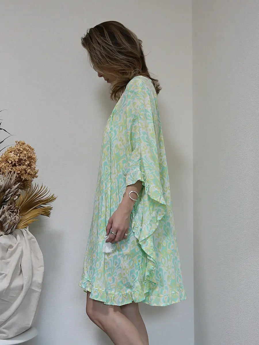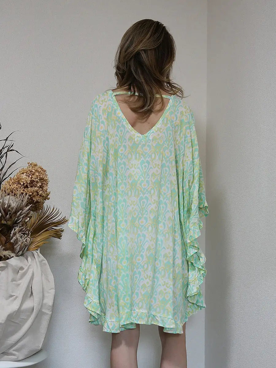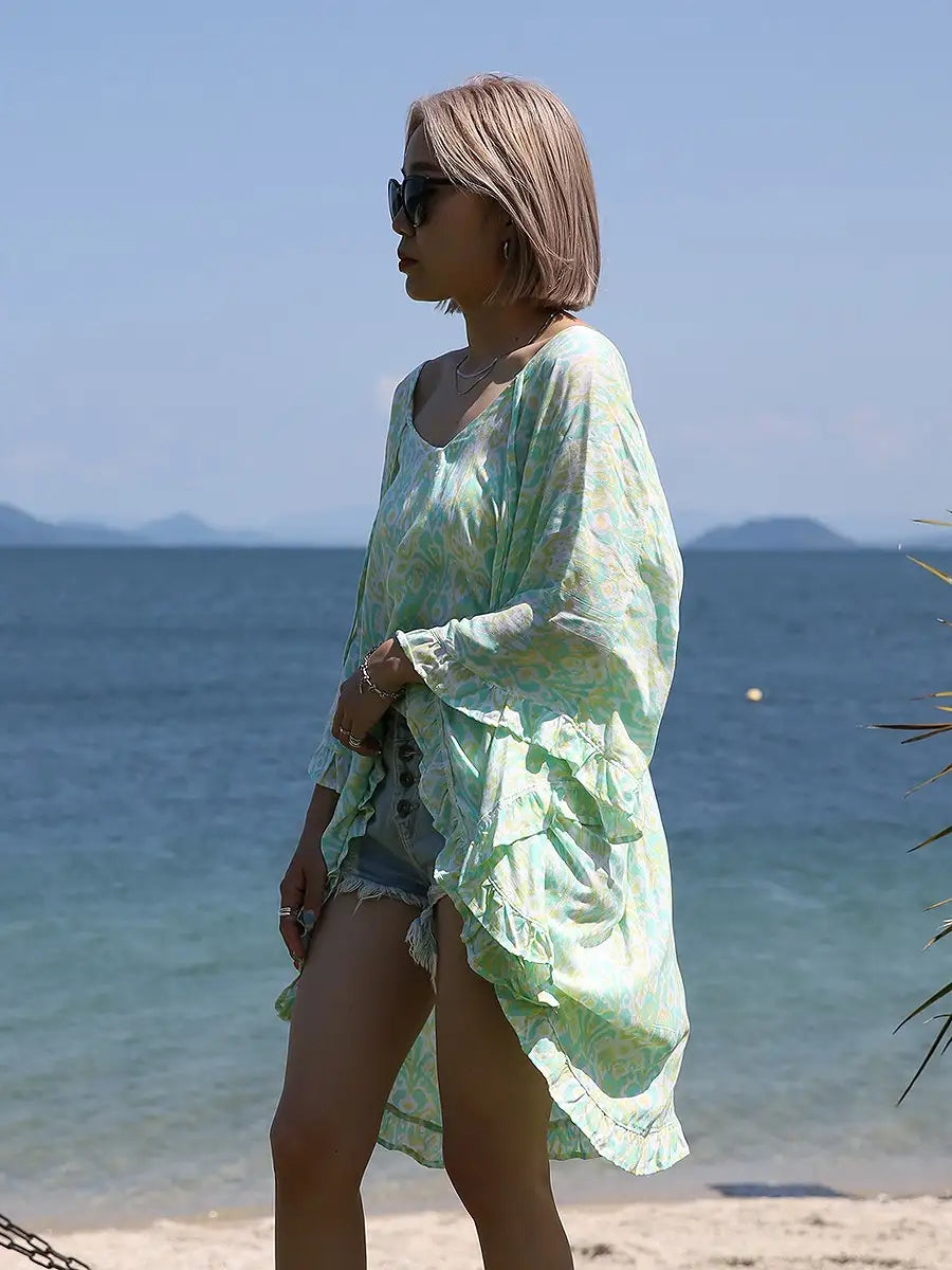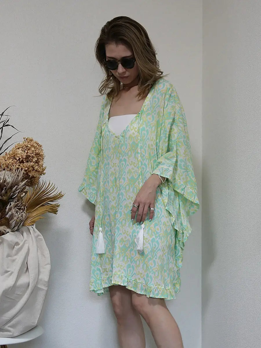 ビーチ・リゾートシーンで映えるオリエンタル柄のチュニックワンピースです。