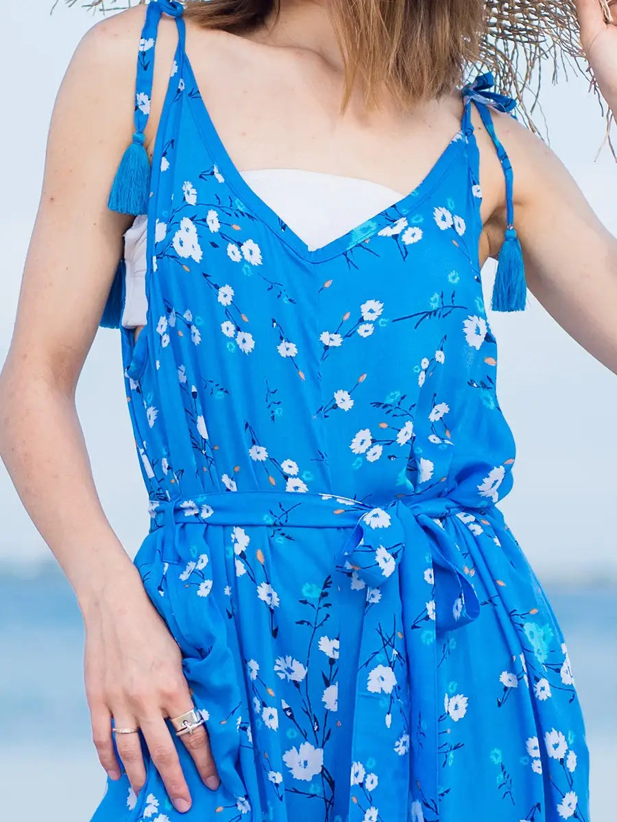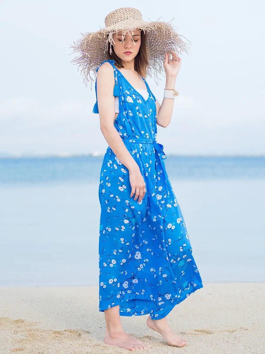 サラッと1枚でお洒落なリゾートスタイルが楽しめる花柄オールインワンです。