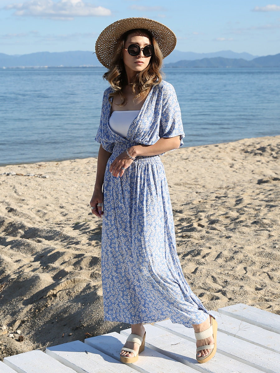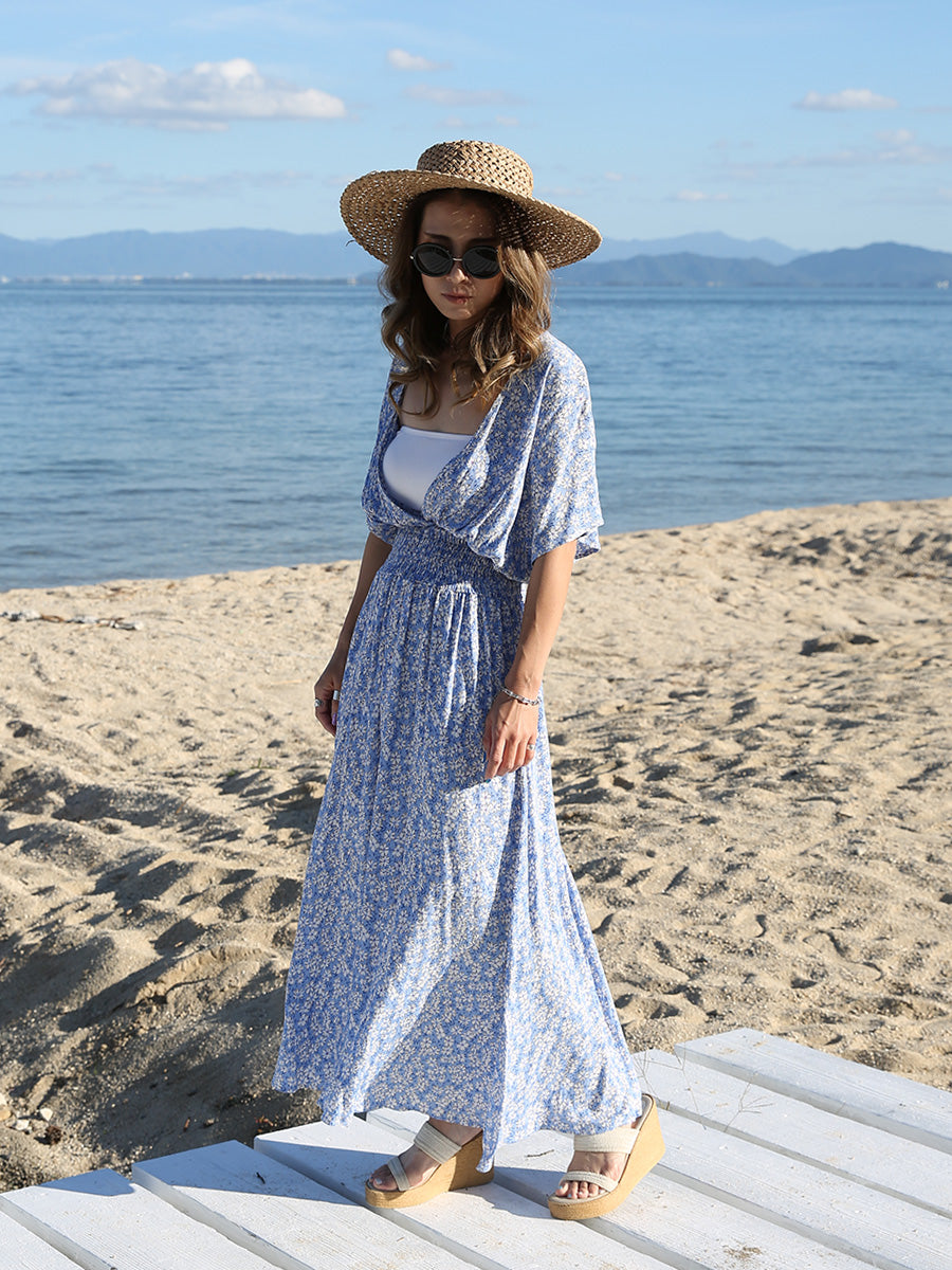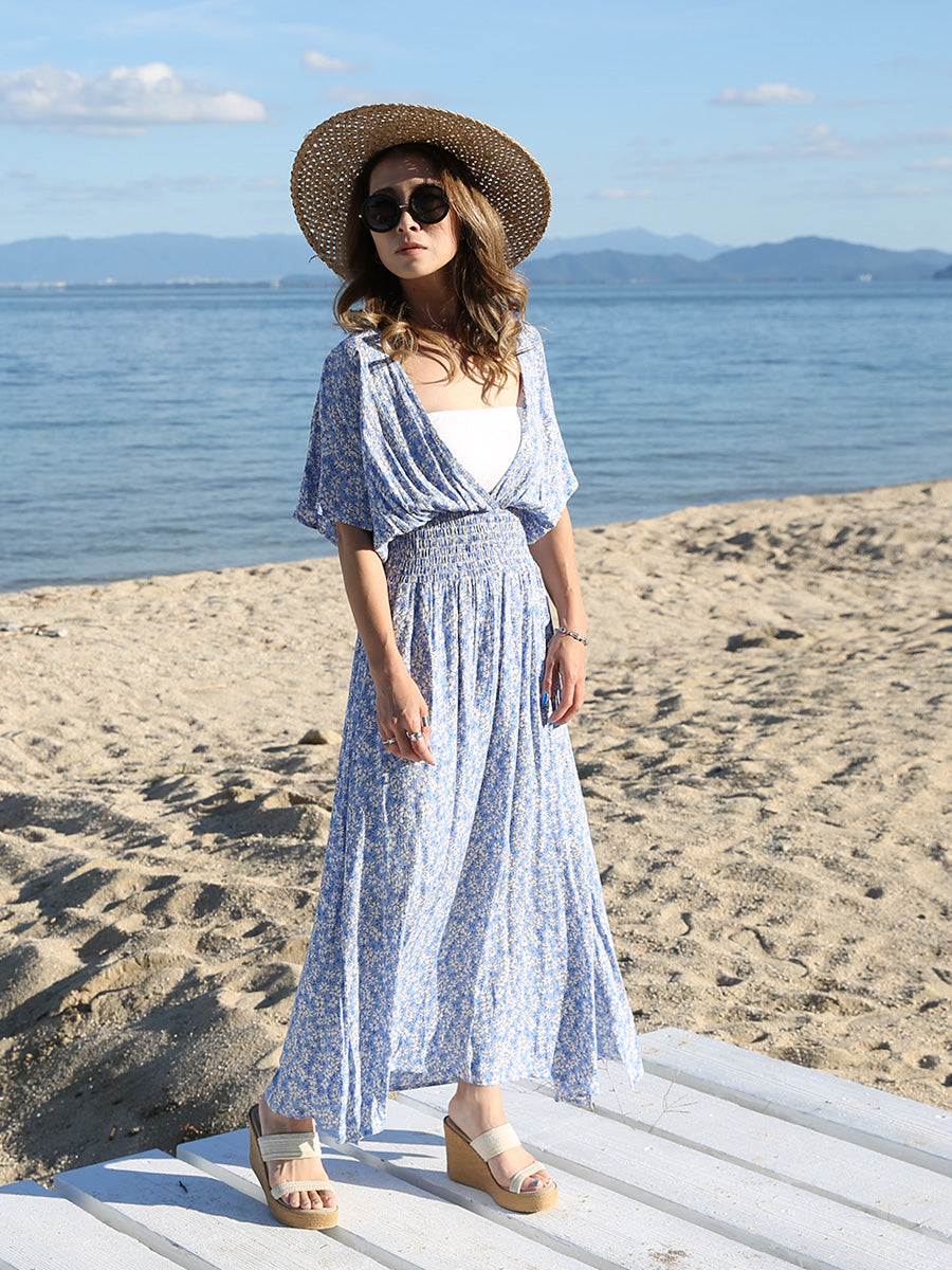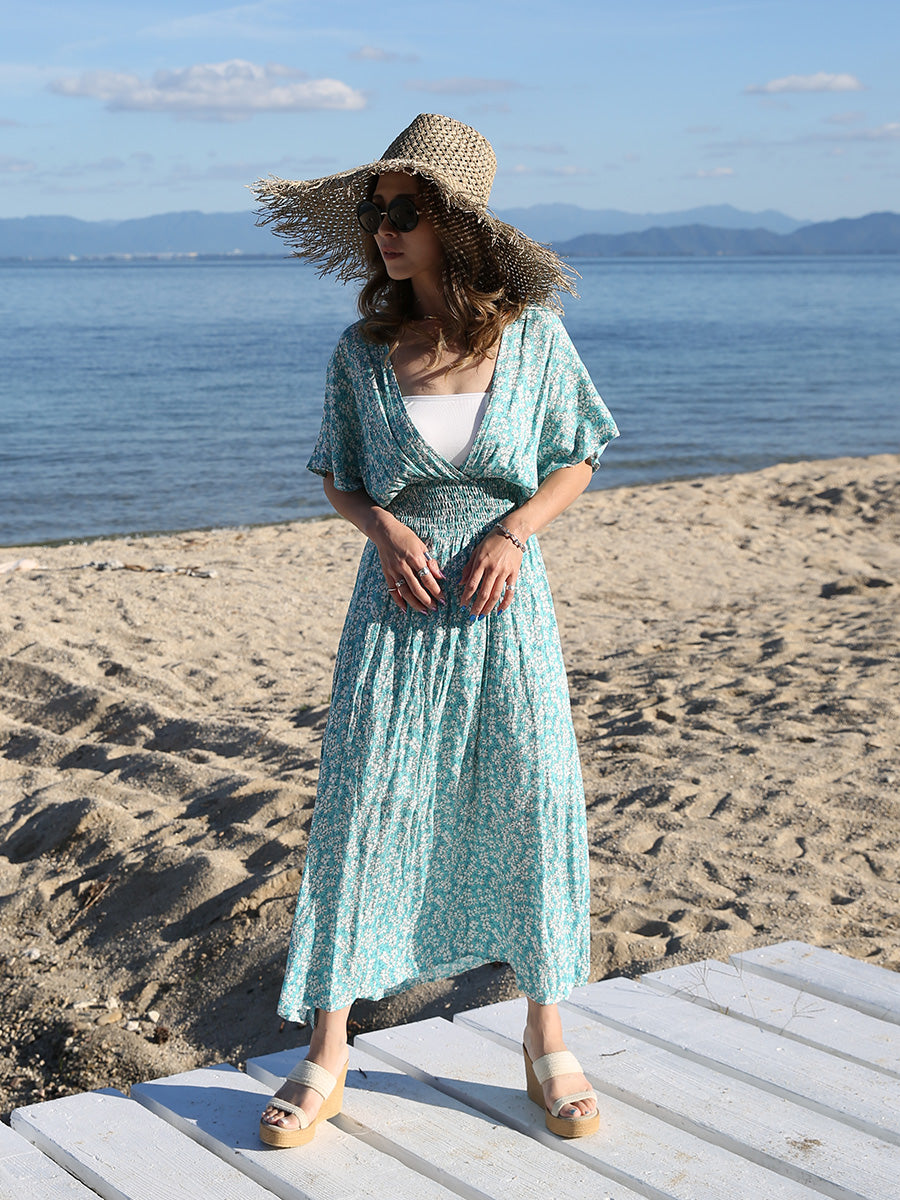 ハワイ旅行や沖縄旅行で大活躍してくれる大人のリゾートワンピース。 小花柄プリントの可愛いロングワンピースは大人可愛いリゾートファッションを楽しみたい方におすすめのです。 裾に向かって広がるAラインシルエットでサラッと1枚でスタイルアップが叶います。 胸元のVネックは上品でシャープな印象を与えてくれるデザインです。首回りをスッキリ見せてくれ、小顔効果があります。 ハイウェストシャーリングデザインで脚長効果、着丈調整が可能です。 両サイドにはスリットが入っており、動きやすいデザインになっています。 胸元の開きが気になる方はインナーにブラトップやキャミソール、水着を合わせるのがおすすめです! |