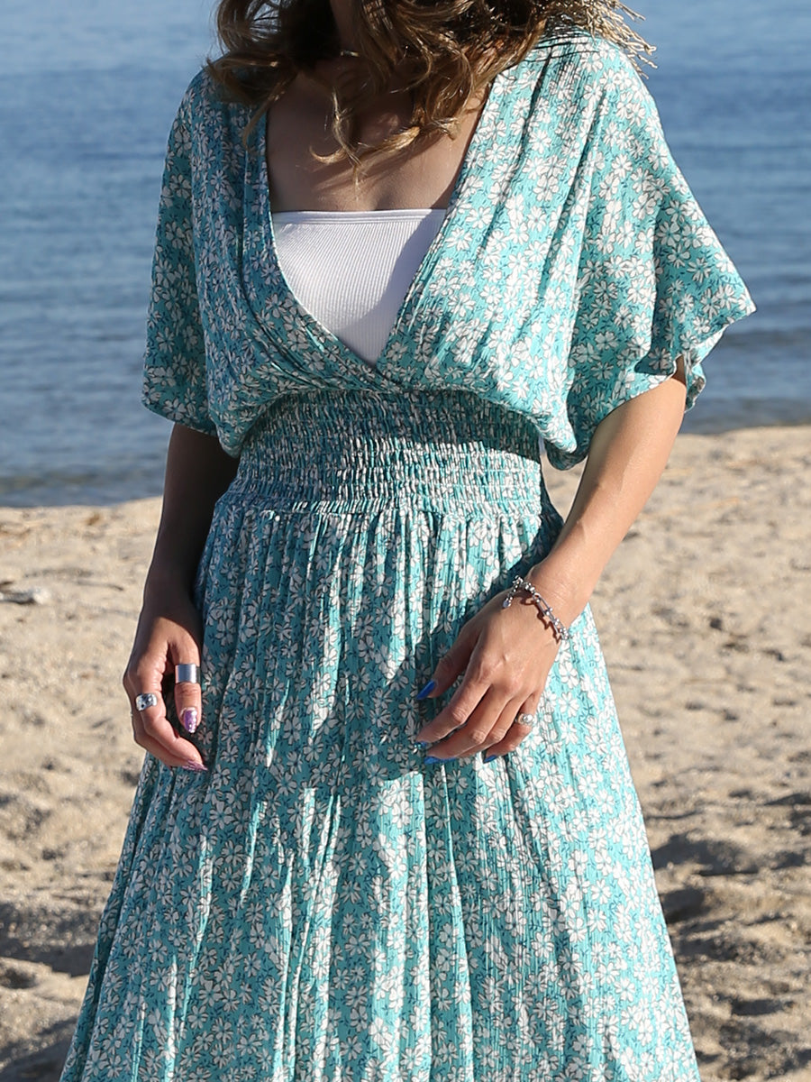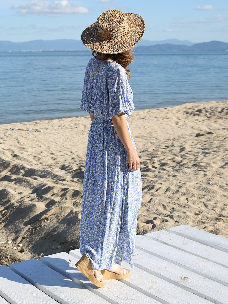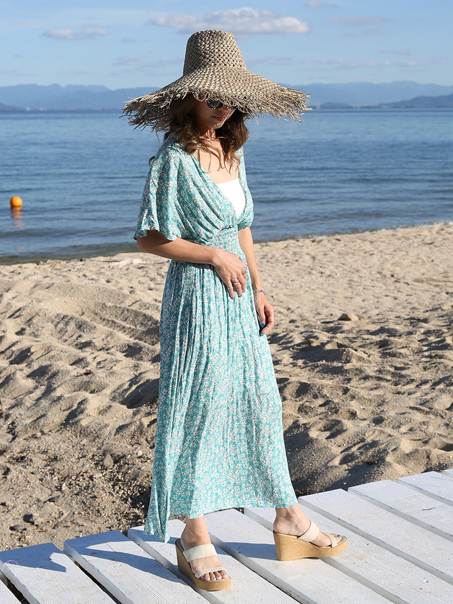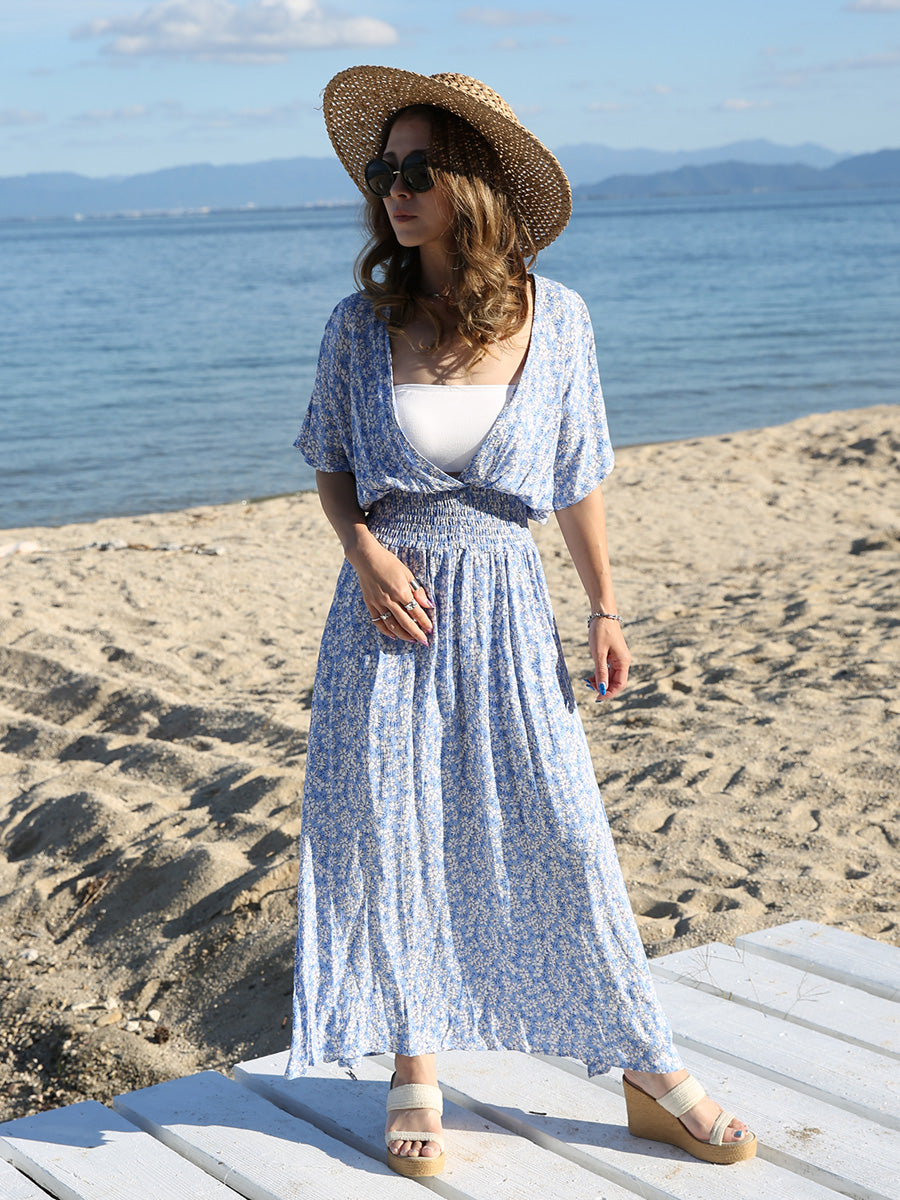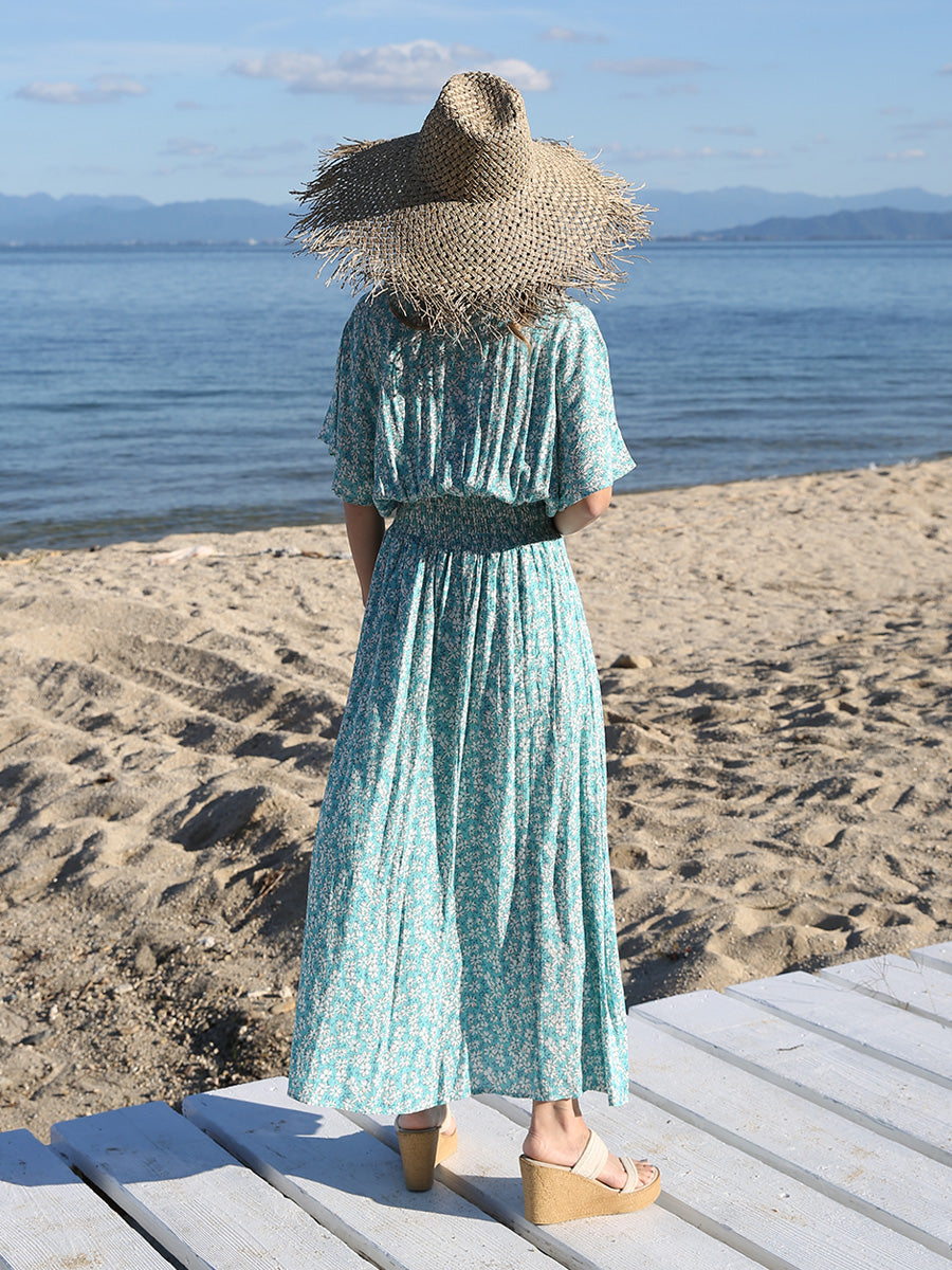 ハワイ旅行や沖縄旅行で大活躍してくれる大人のリゾートワンピース。 小花柄プリントの可愛いロングワンピースは大人可愛いリゾートファッションを楽しみたい方におすすめのです。 裾に向かって広がるAラインシルエットでサラッと1枚でスタイルアップが叶います。 胸元のVネックは上品でシャープな印象を与えてくれるデザインです。首回りをスッキリ見せてくれ、小顔効果があります。 ハイウェストシャーリングデザインで脚長効果、着丈調整が可能です。 両サイドにはスリットが入っており、動きやすいデザインになっています。 胸元の開きが気になる方はインナーにブラトップやキャミソール、水着を合わせるのがおすすめです! |