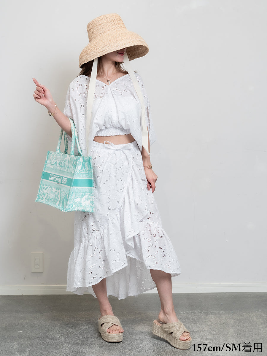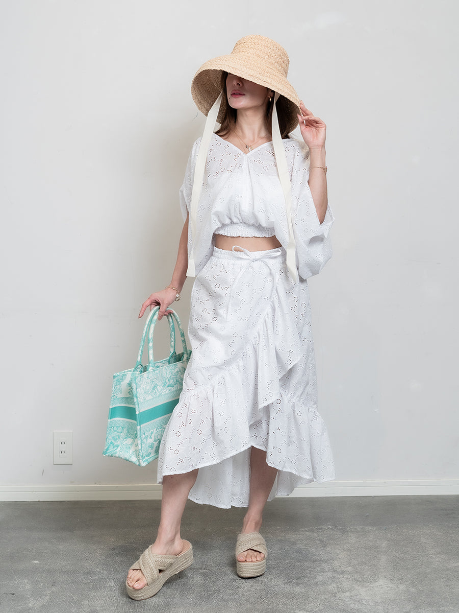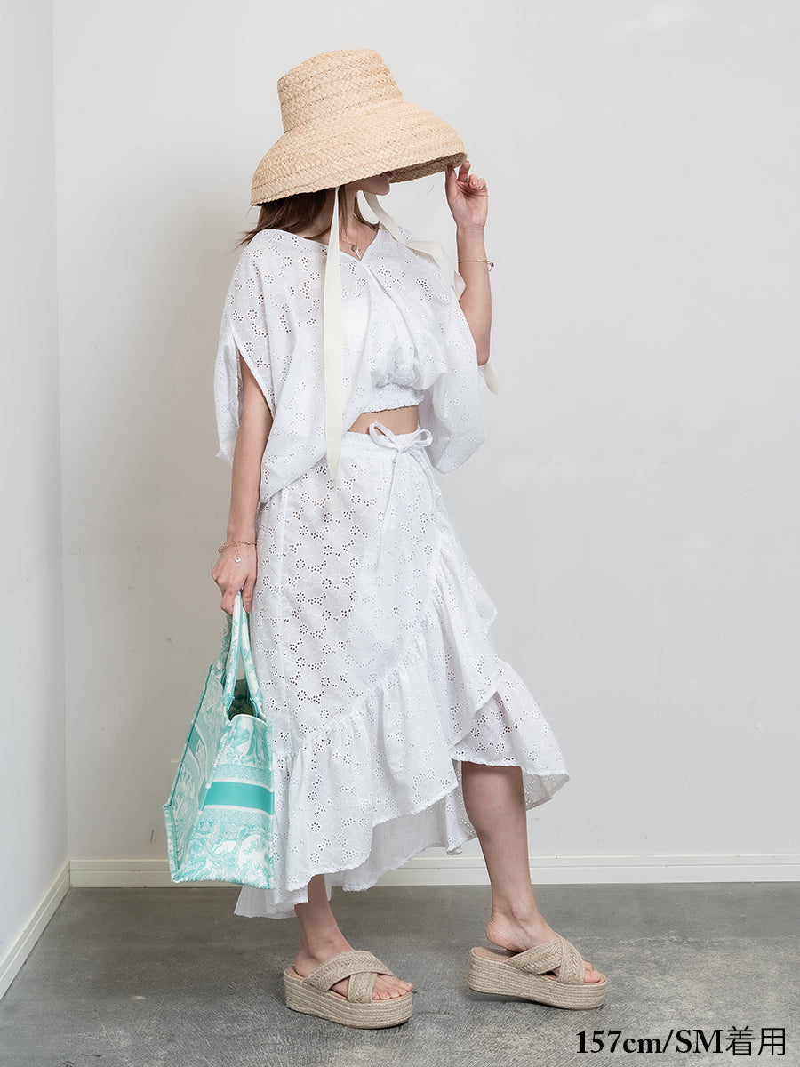 レース素材のドルマンスリーブトップスとラップマキシスカートのセットアップ。