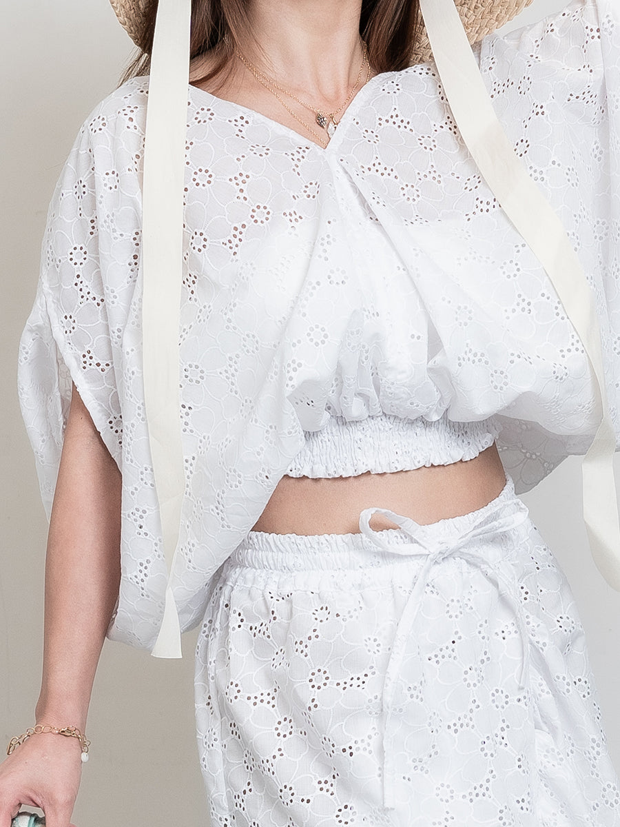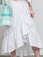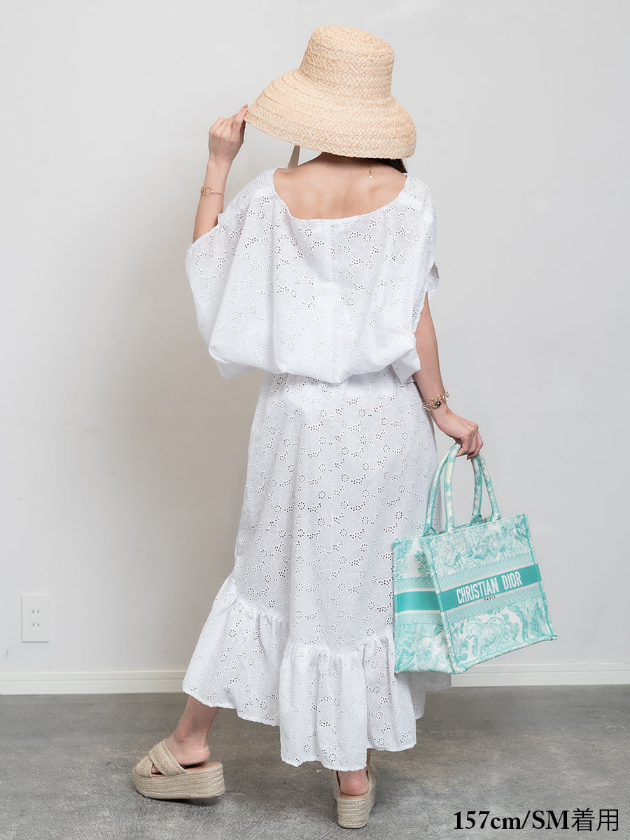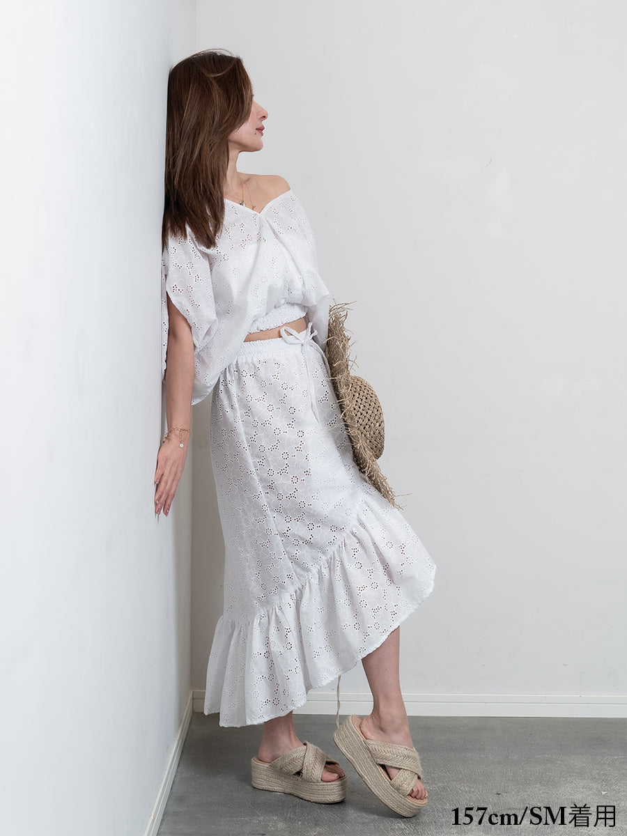 レース素材のドルマンスリーブトップスとラップマキシスカートのセットアップ。