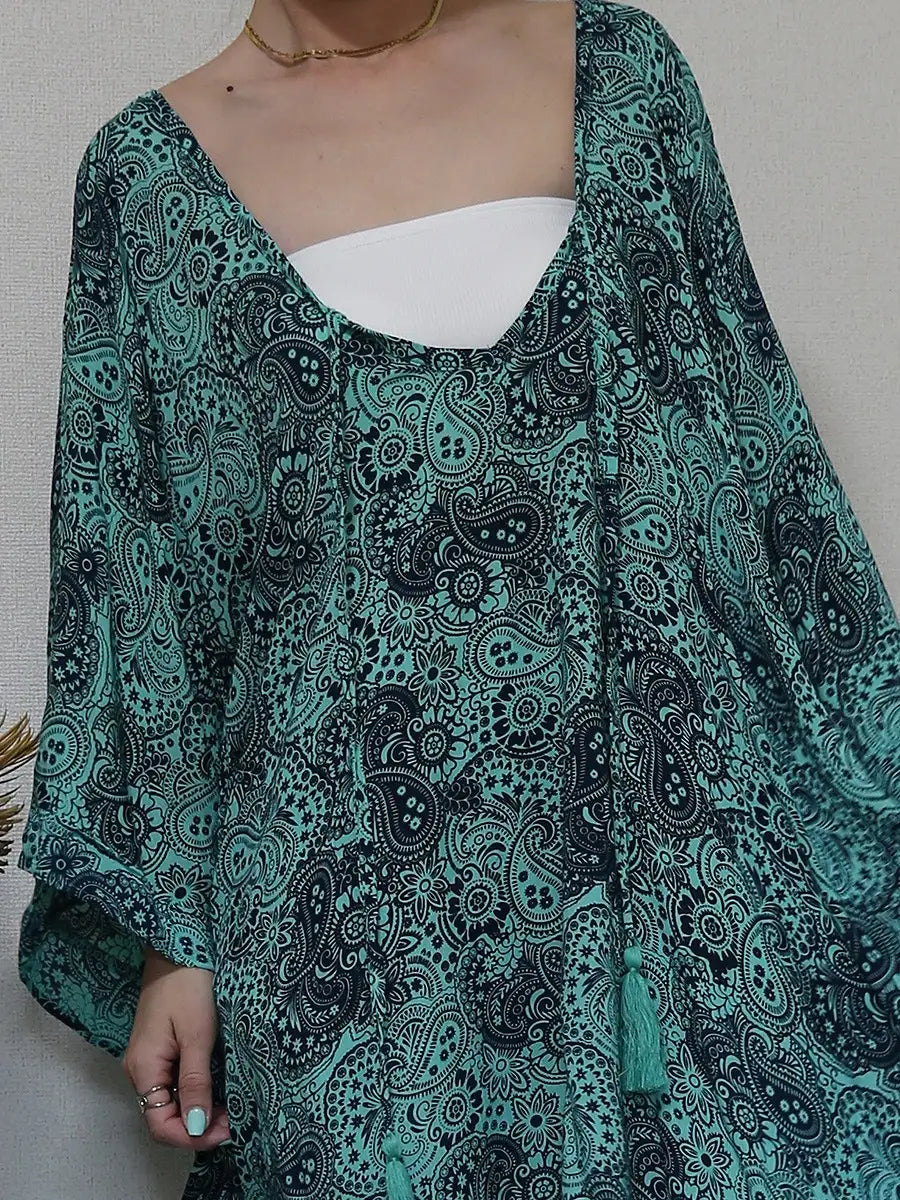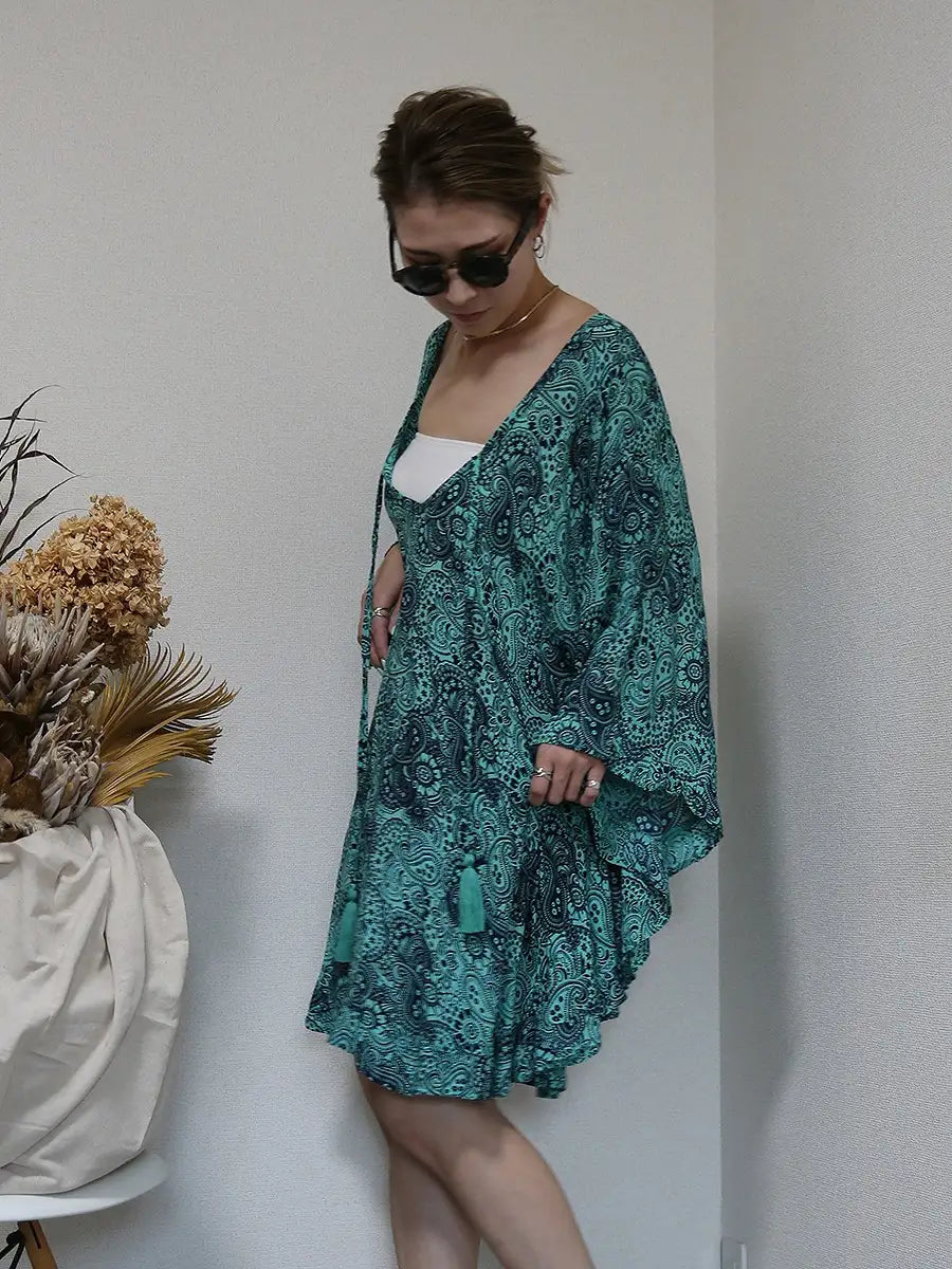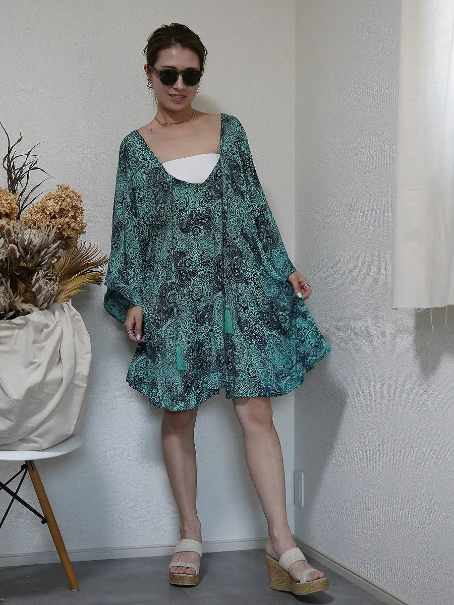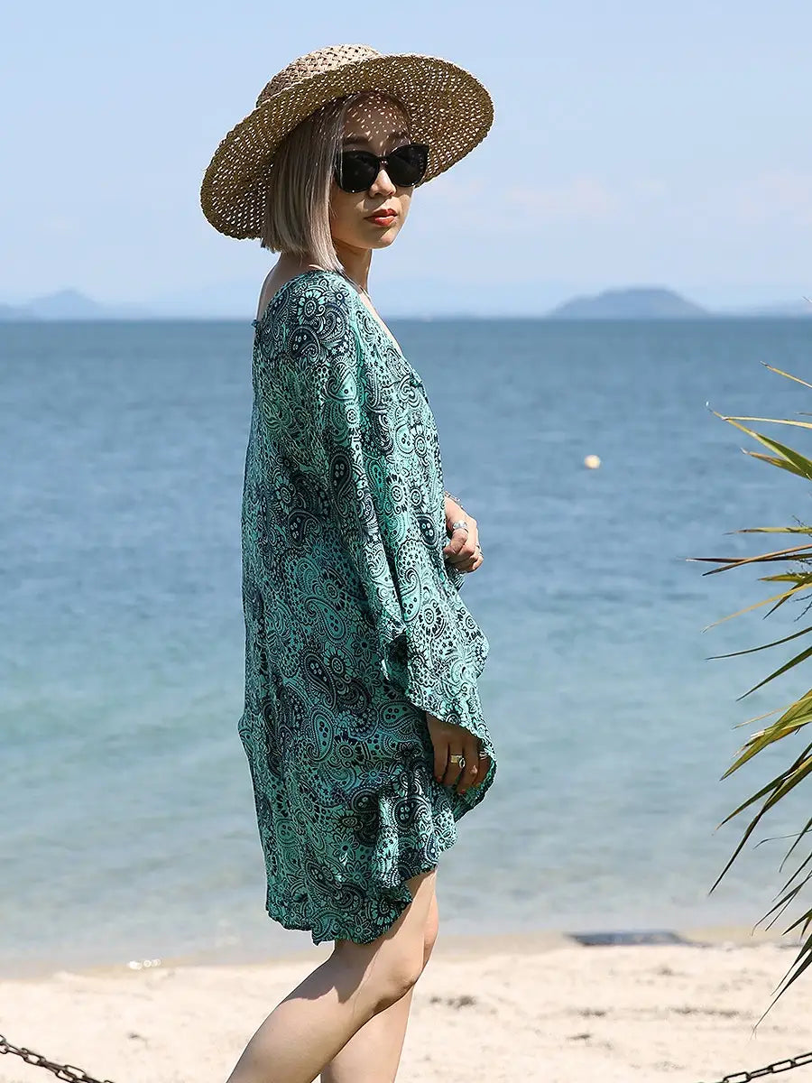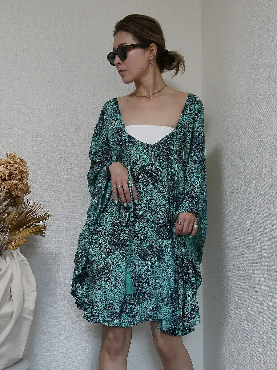 ビーチ・リゾートシーンで映えるペイズリー柄のチュニックワンピースです。