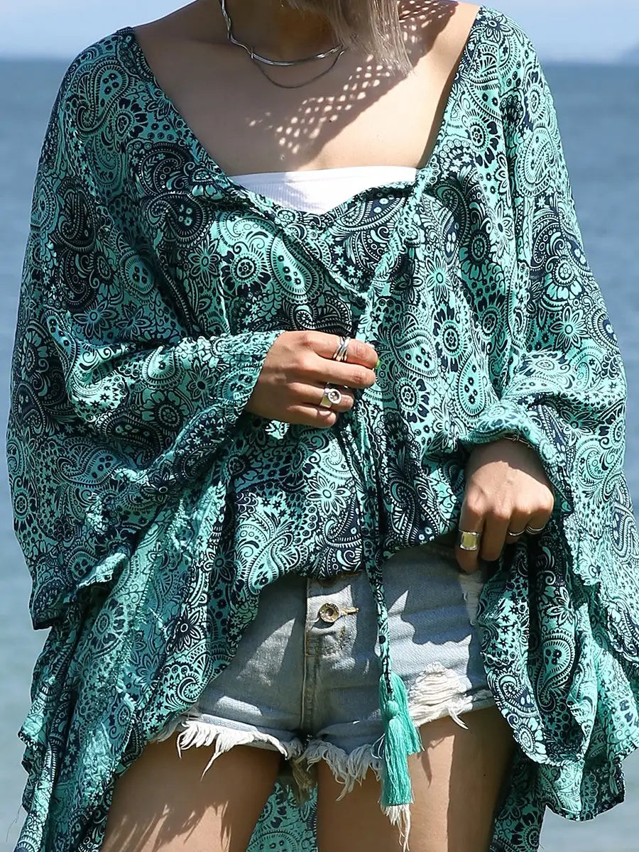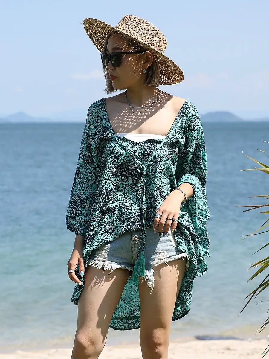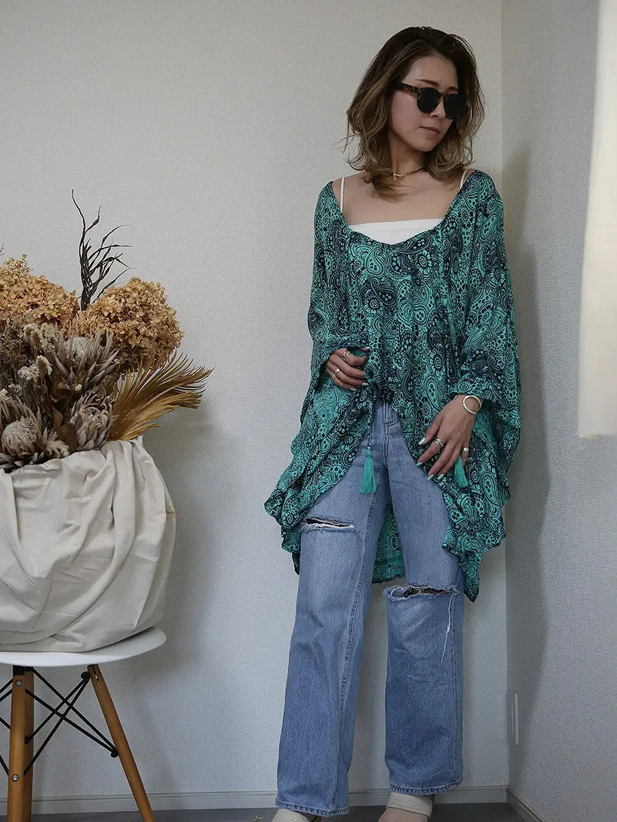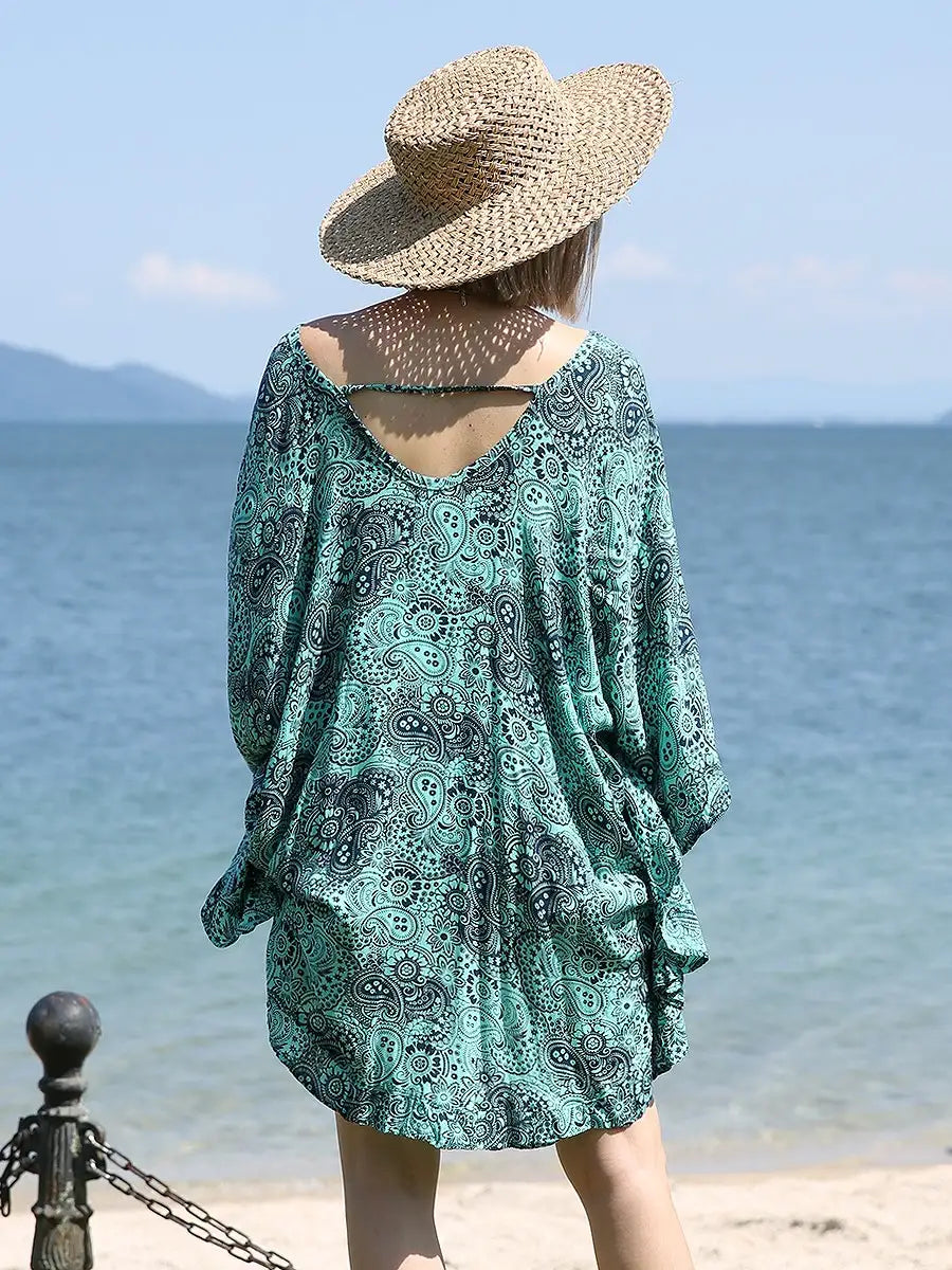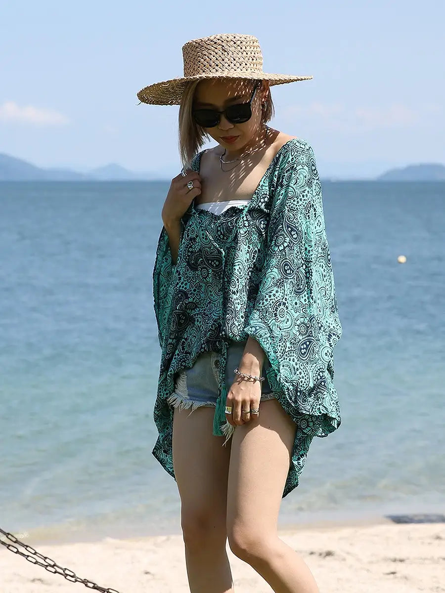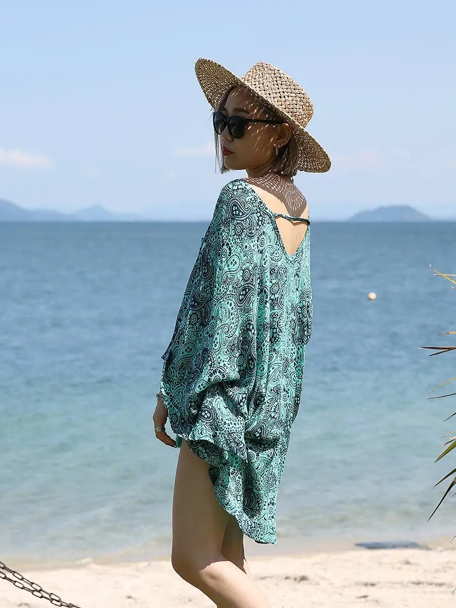 ビーチ・リゾートシーンで映えるペイズリー柄のチュニックワンピースです。