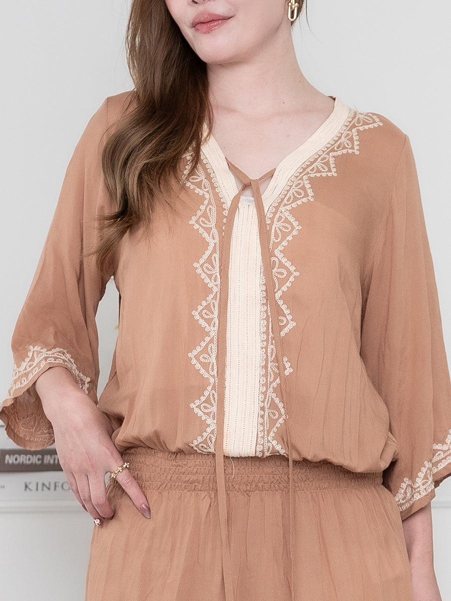 胸元には立体感のある刺繍をあしらい、さりげない華やかさをプラス。