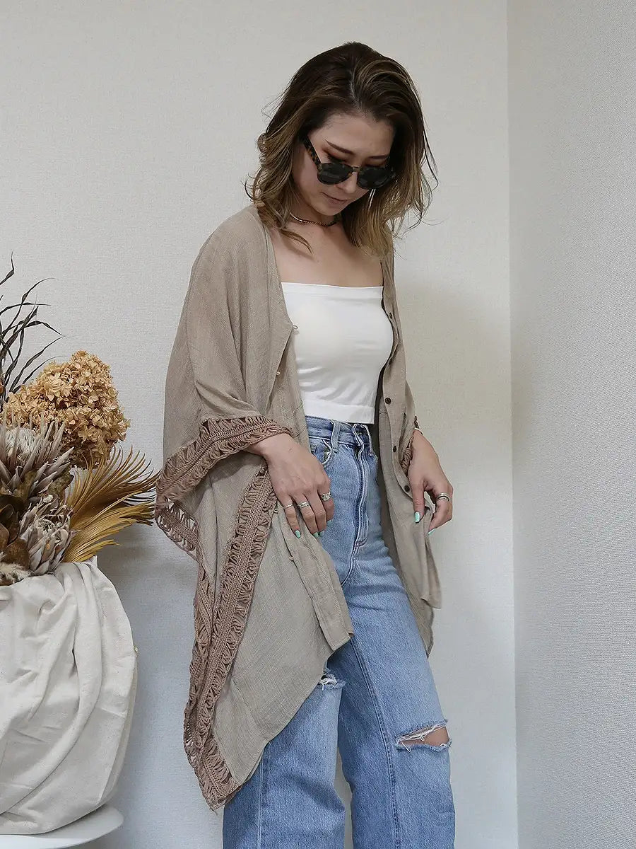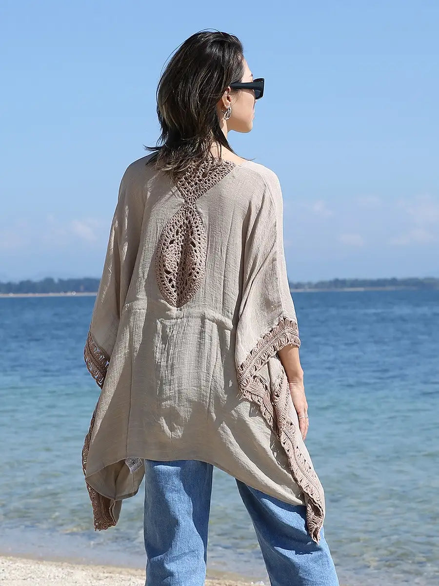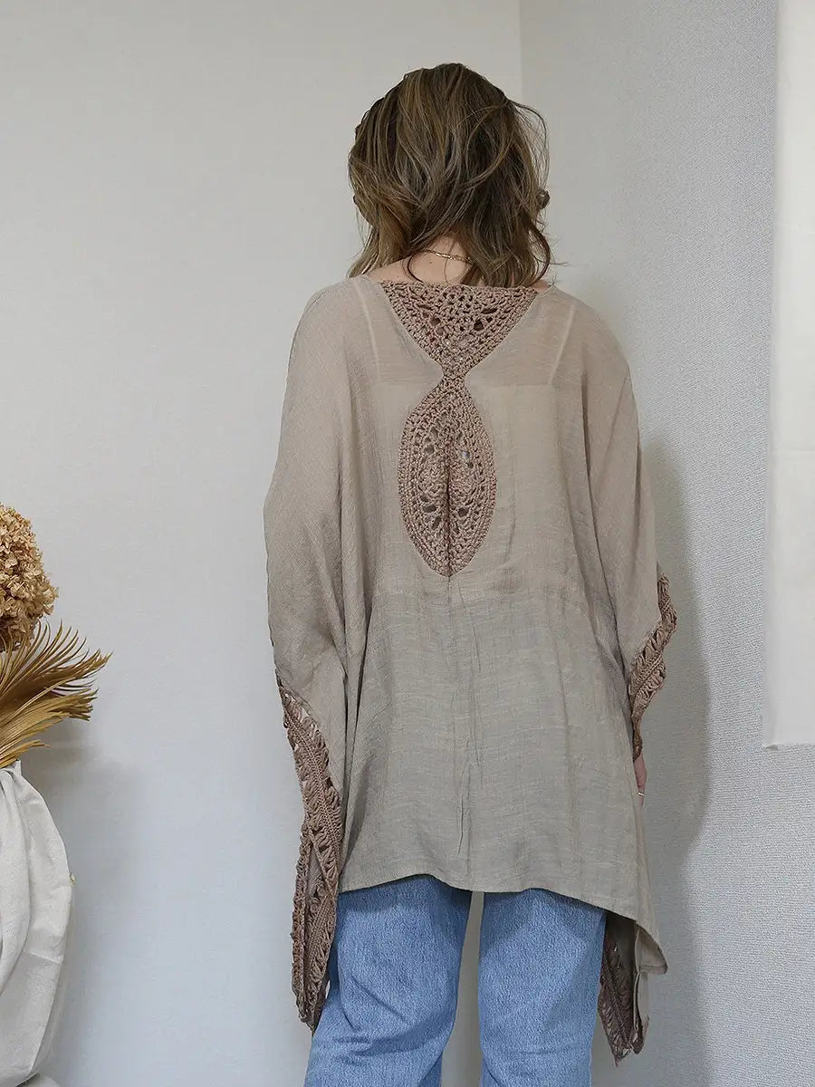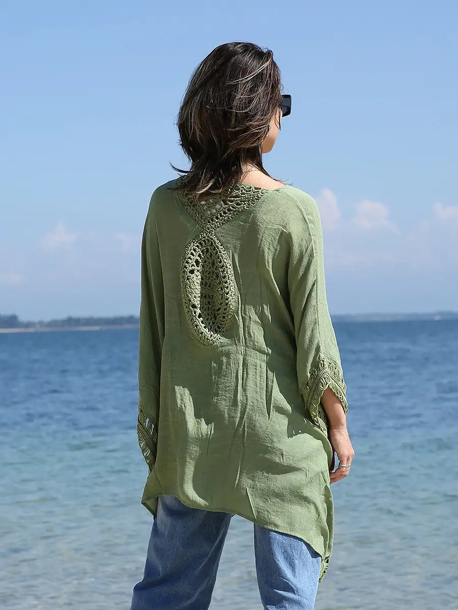背中、袖口がクロシェ編みになったお洒落なデザインです。
