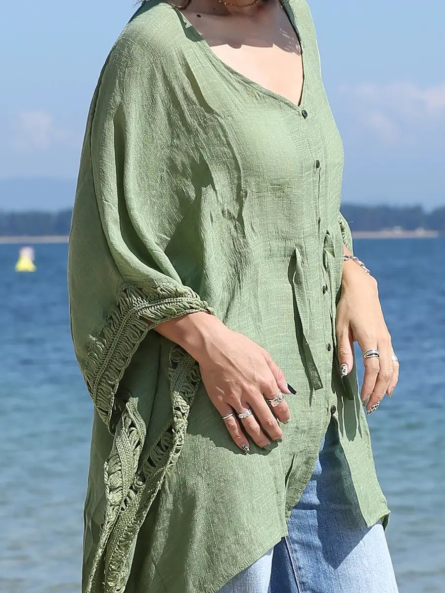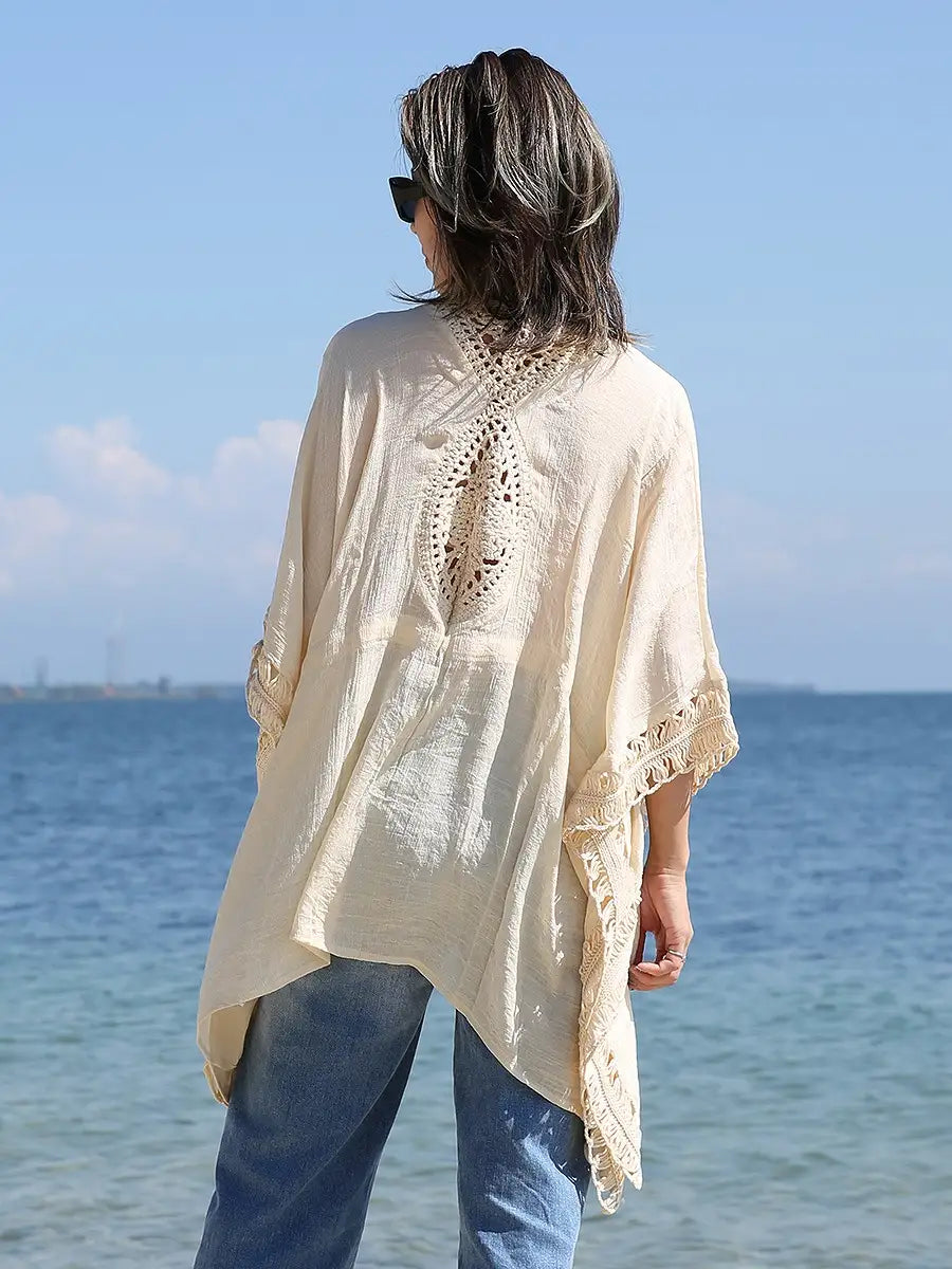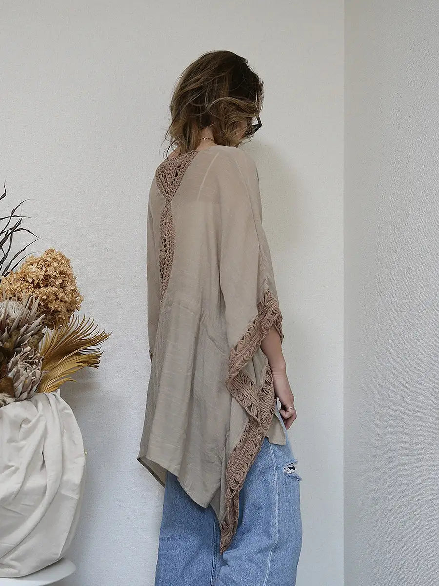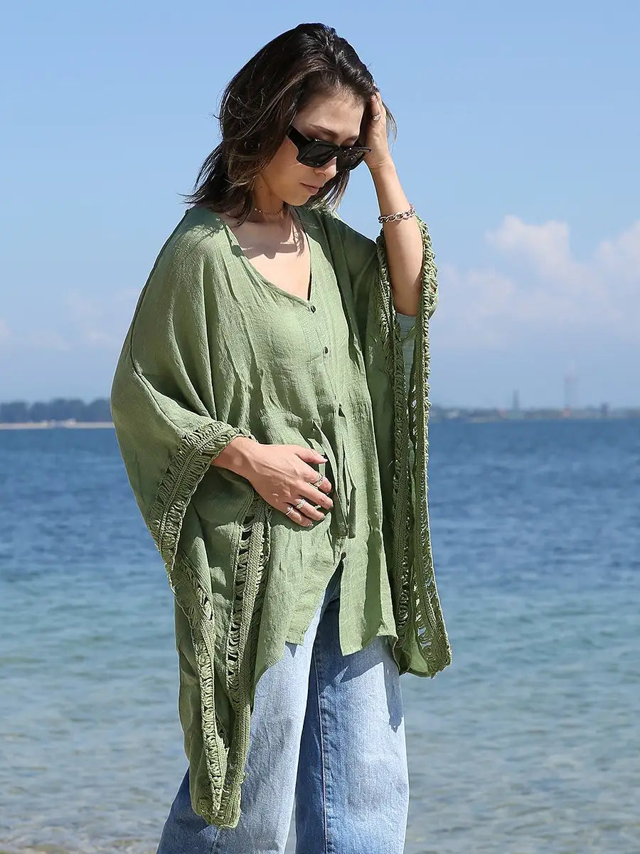 背中、袖口がクロシェ編みになったお洒落なデザインです。