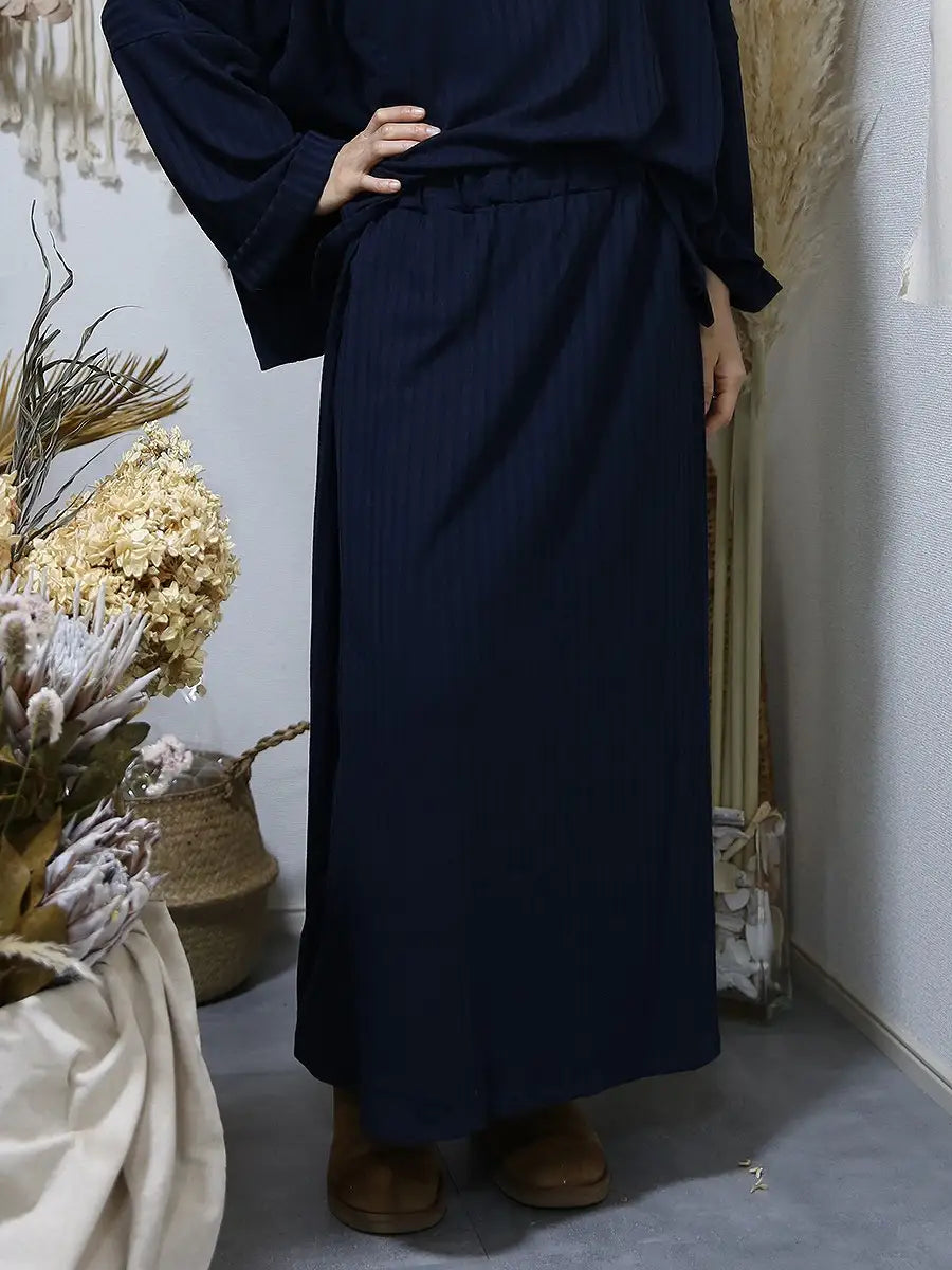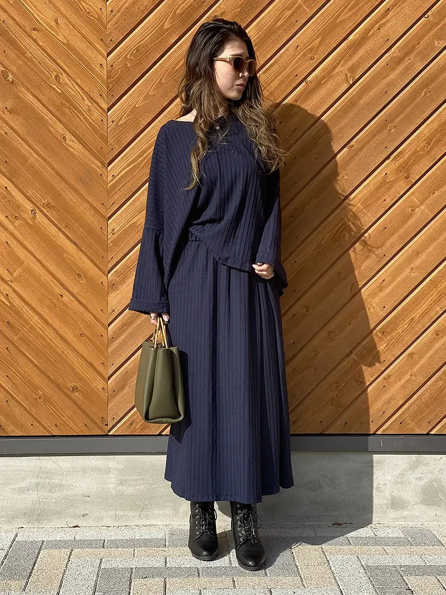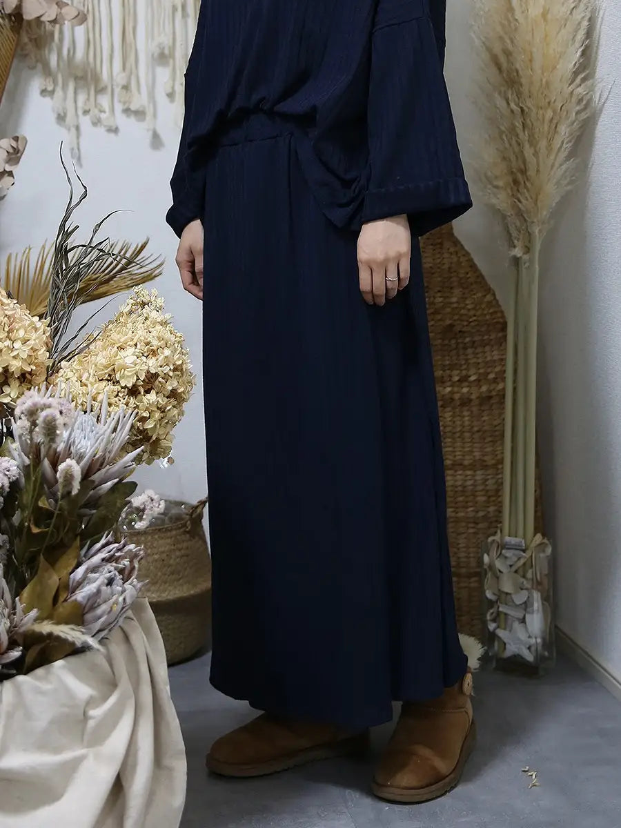 シンプルなリブニットマキシスカートはどんなコーディネートにも合わせやすくお洒落の幅が広がります。