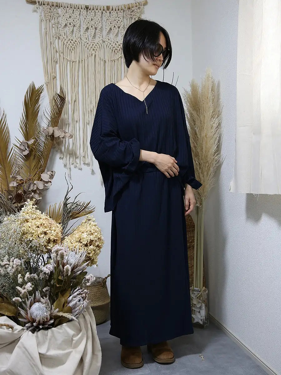 ゆるシルエットのVネック薄手リブニットと合わせてのセットアップコーデがおすすめです。