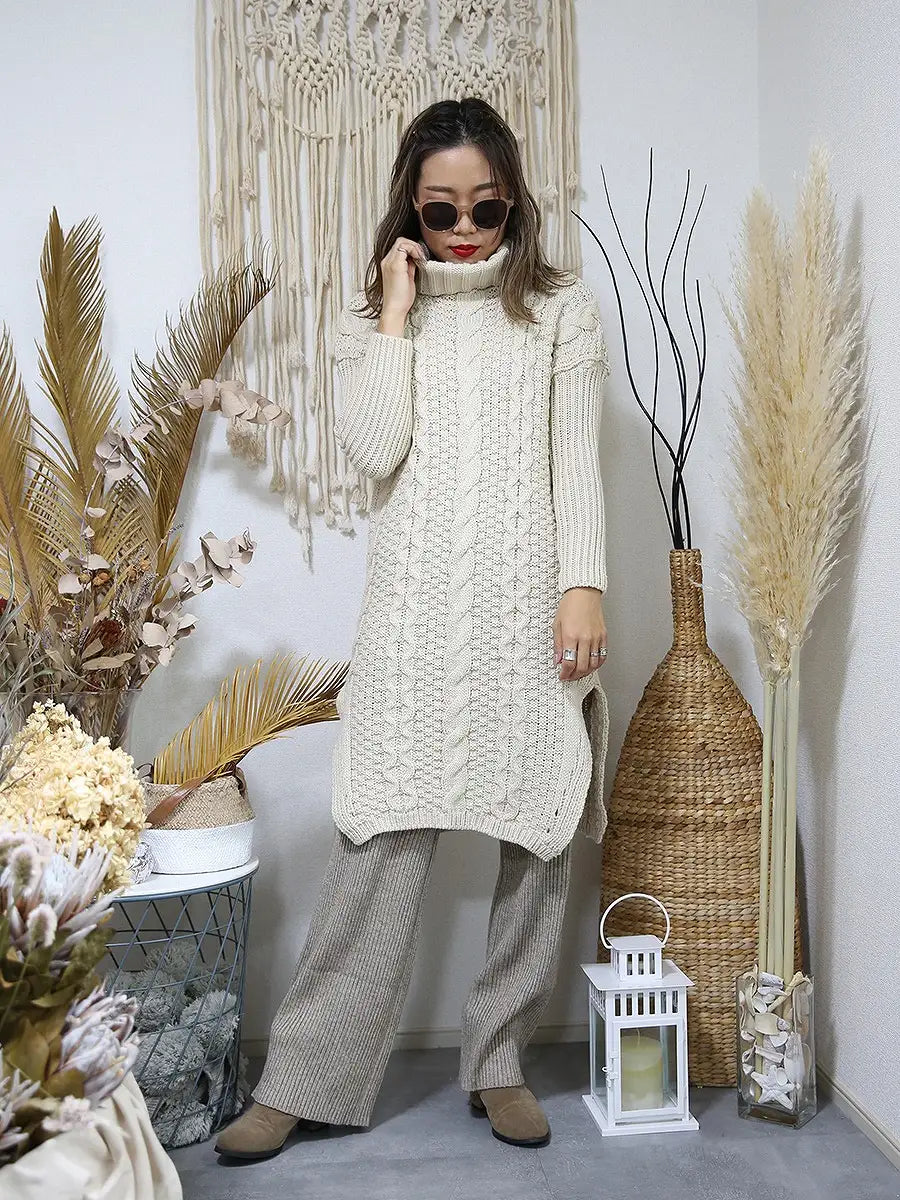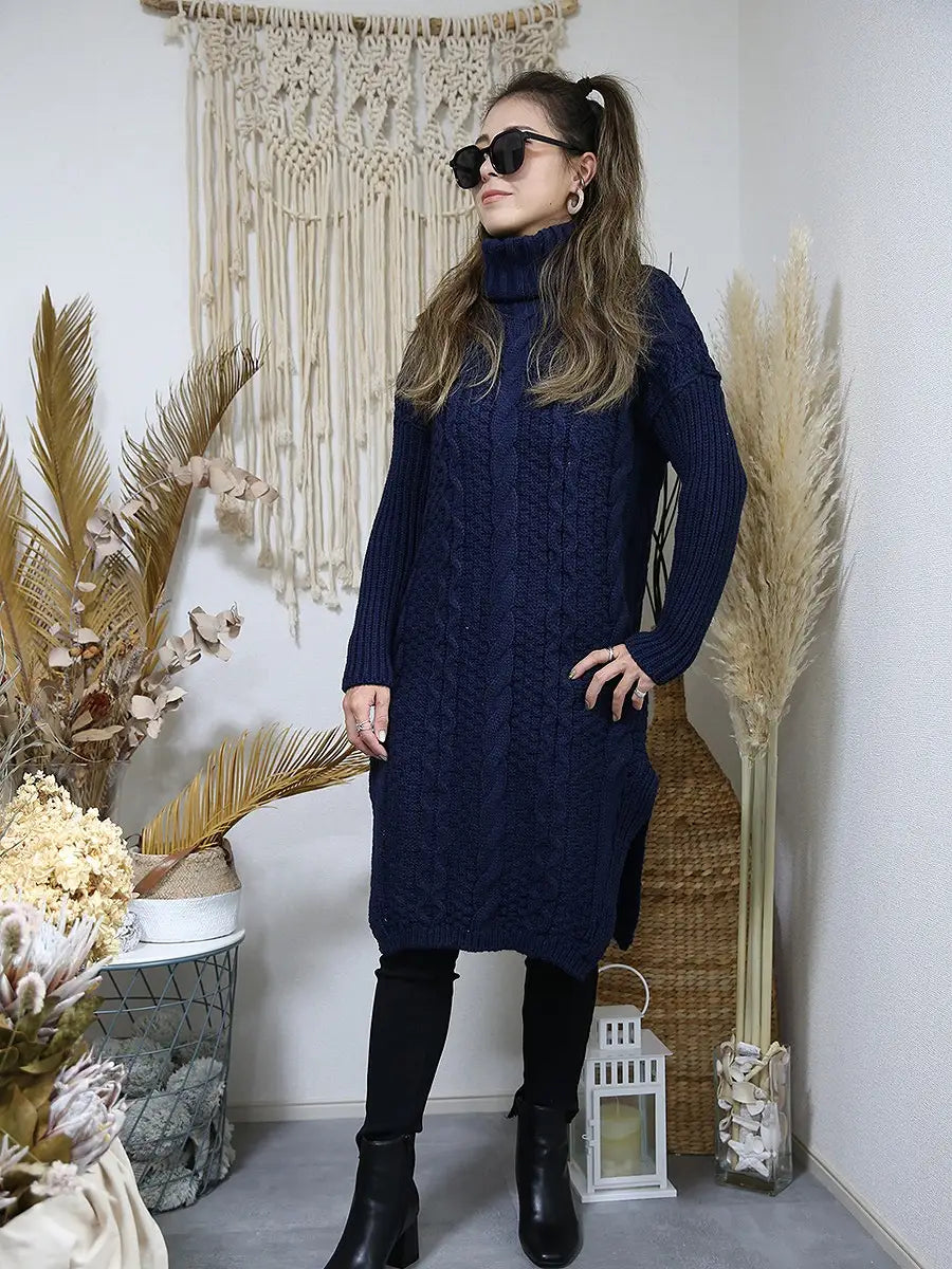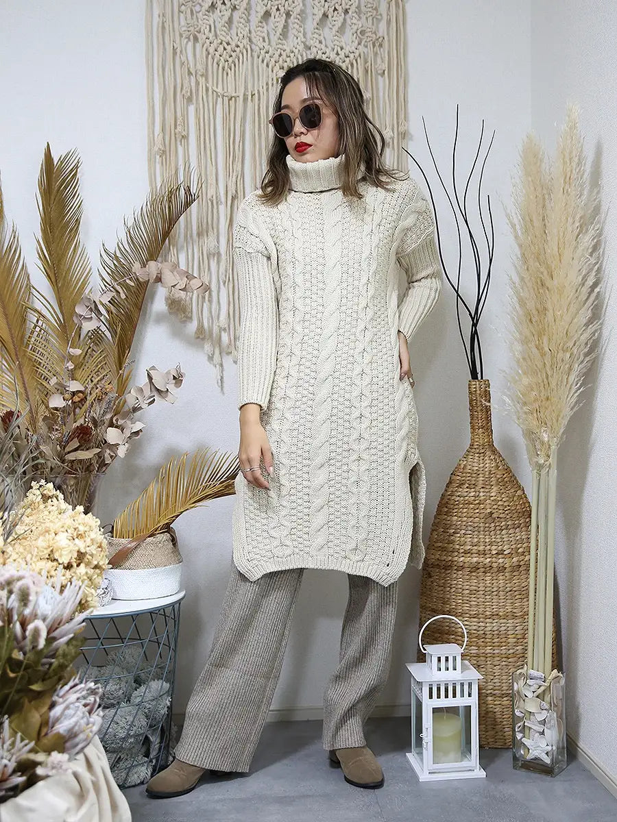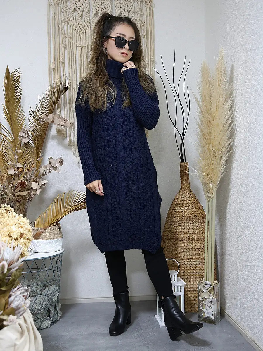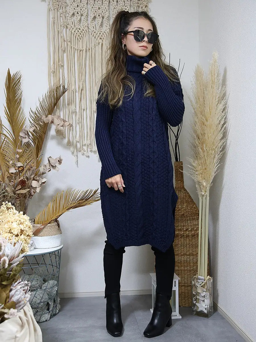 roomy by the sea(ルーミーバイザシー)タートルネックのケーブル編みニットワンピース。
