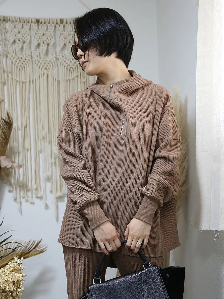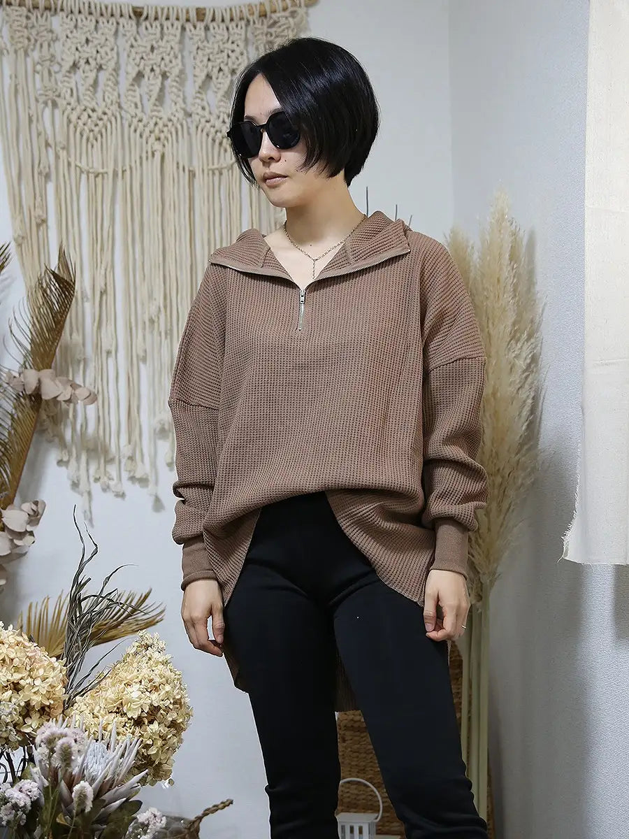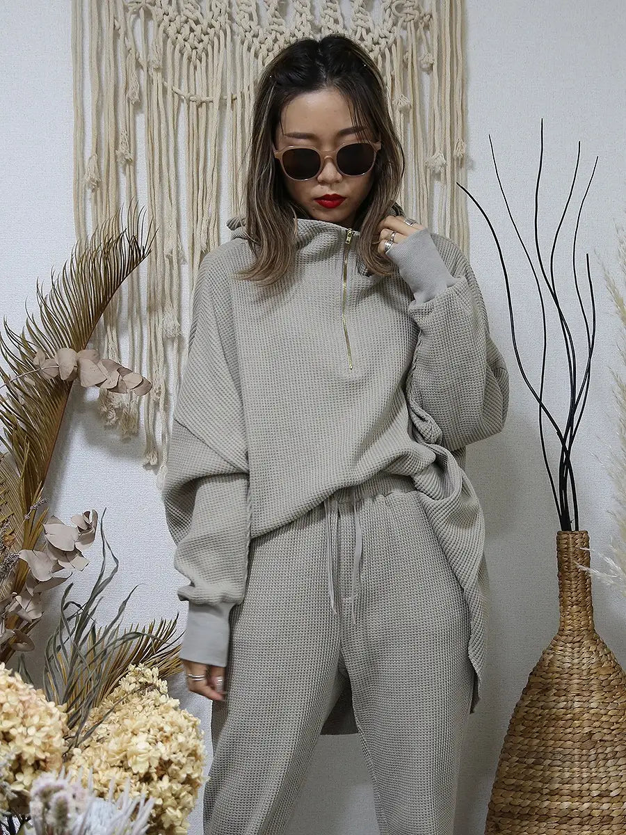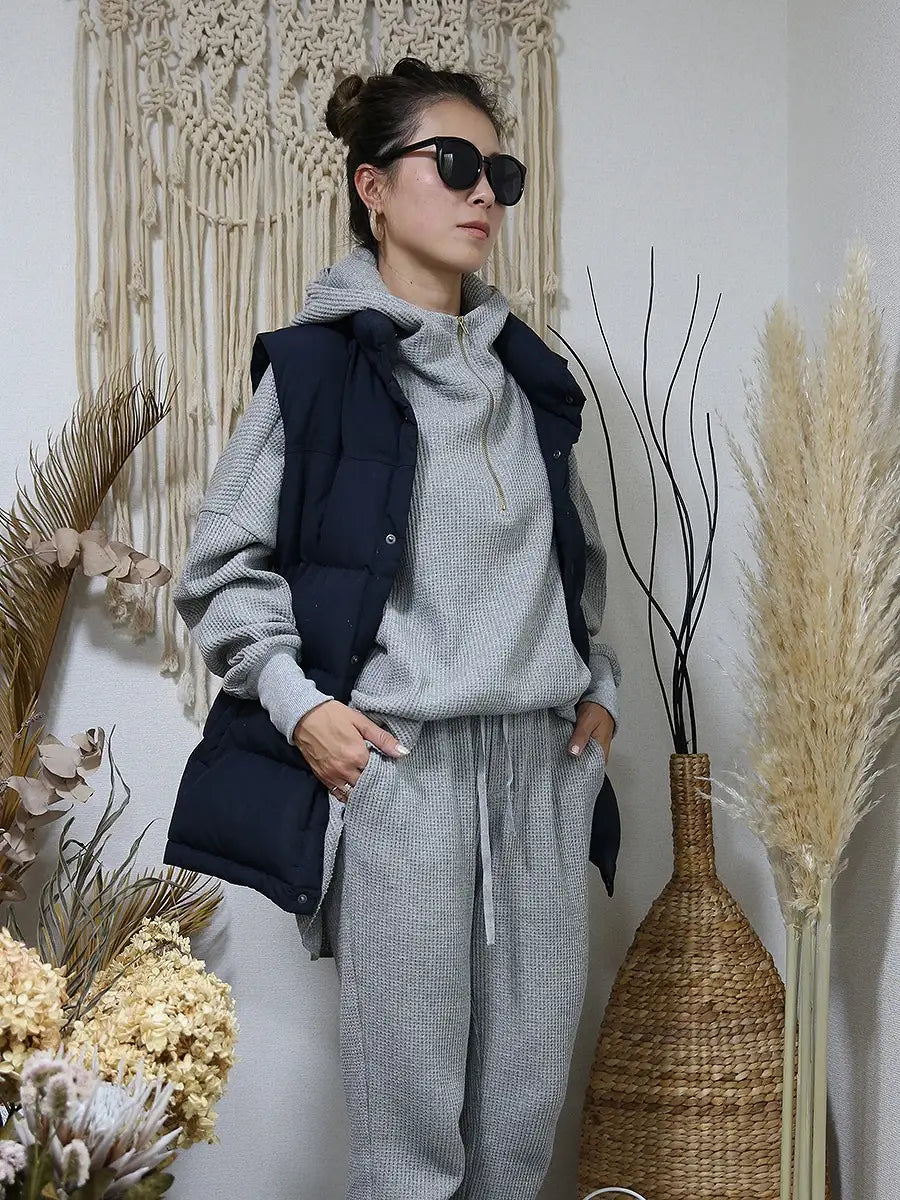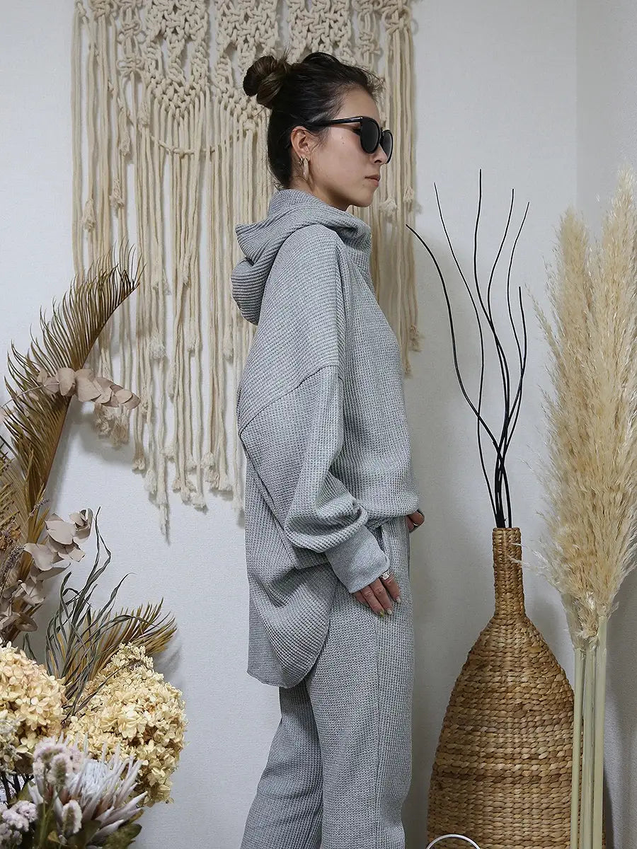 ワッフル生地のパンツやレギンス、マキシスカートと合わせて、ワンランク上の大人女子コーディネートをお楽しみください。