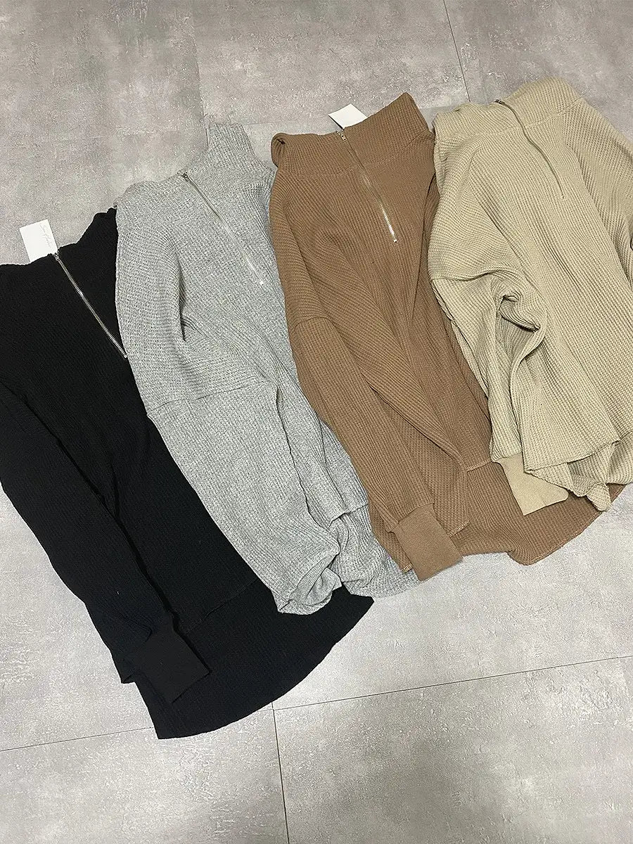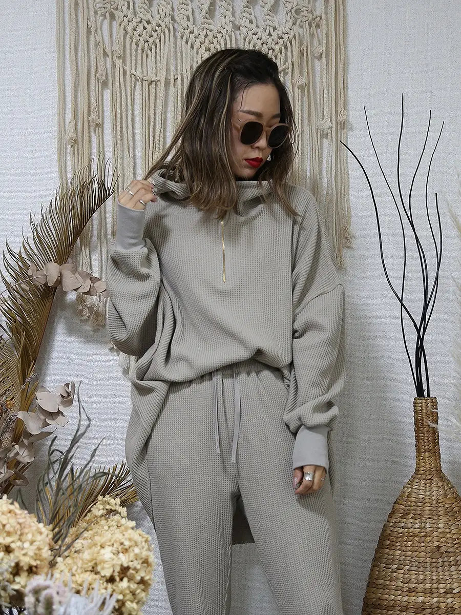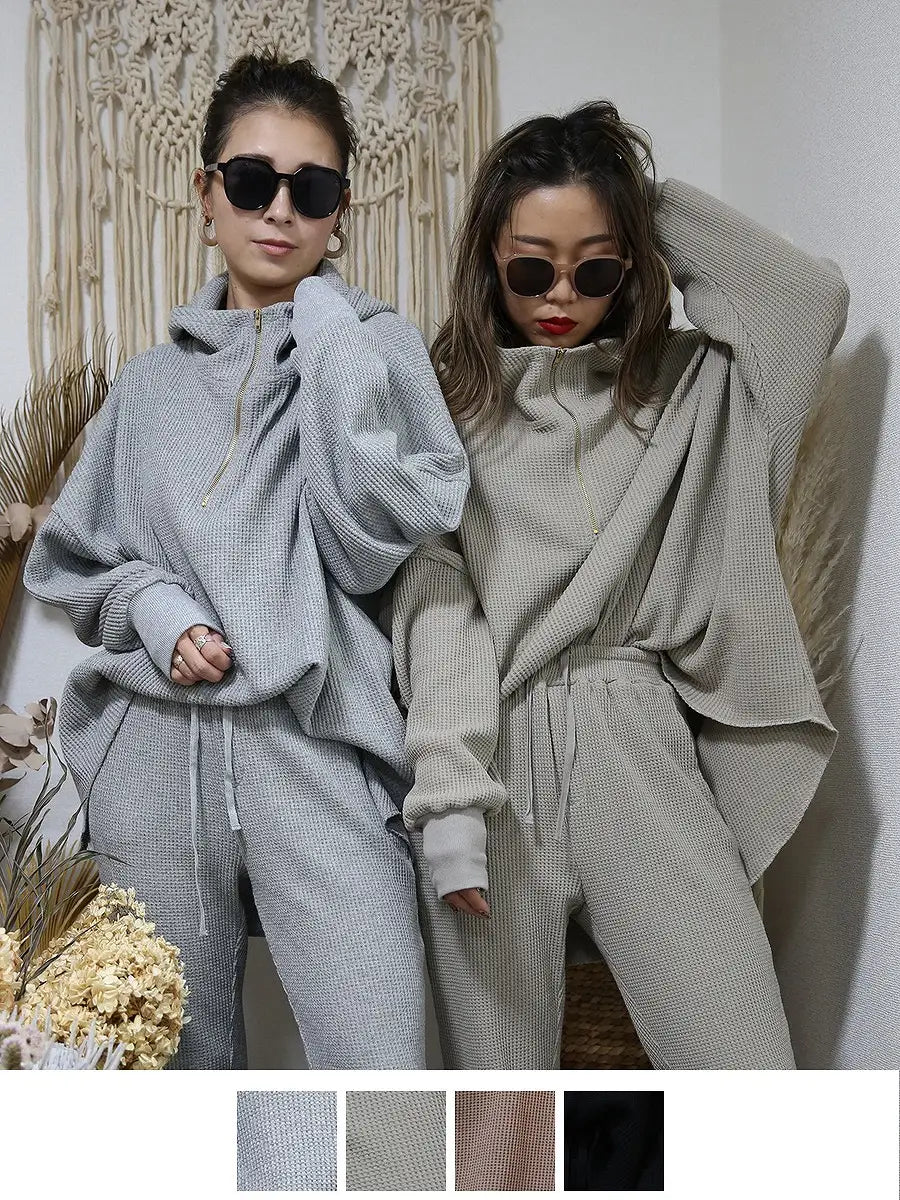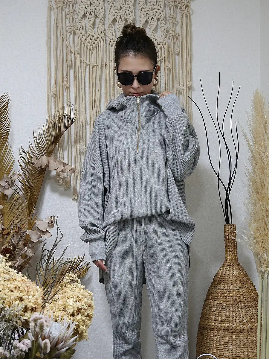 ワッフル生地のパンツやレギンス、マキシスカートと合わせて、ワンランク上の大人女子コーディネートをお楽しみください。