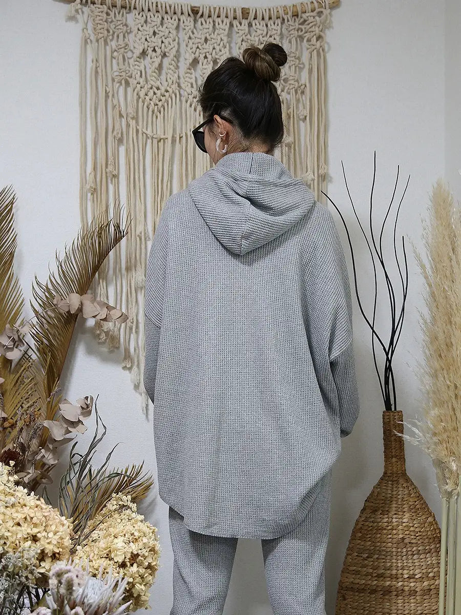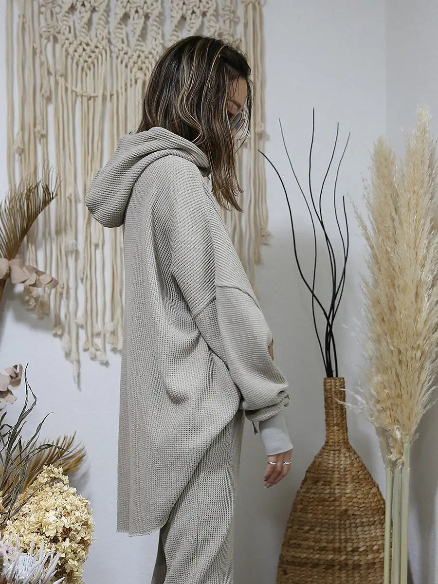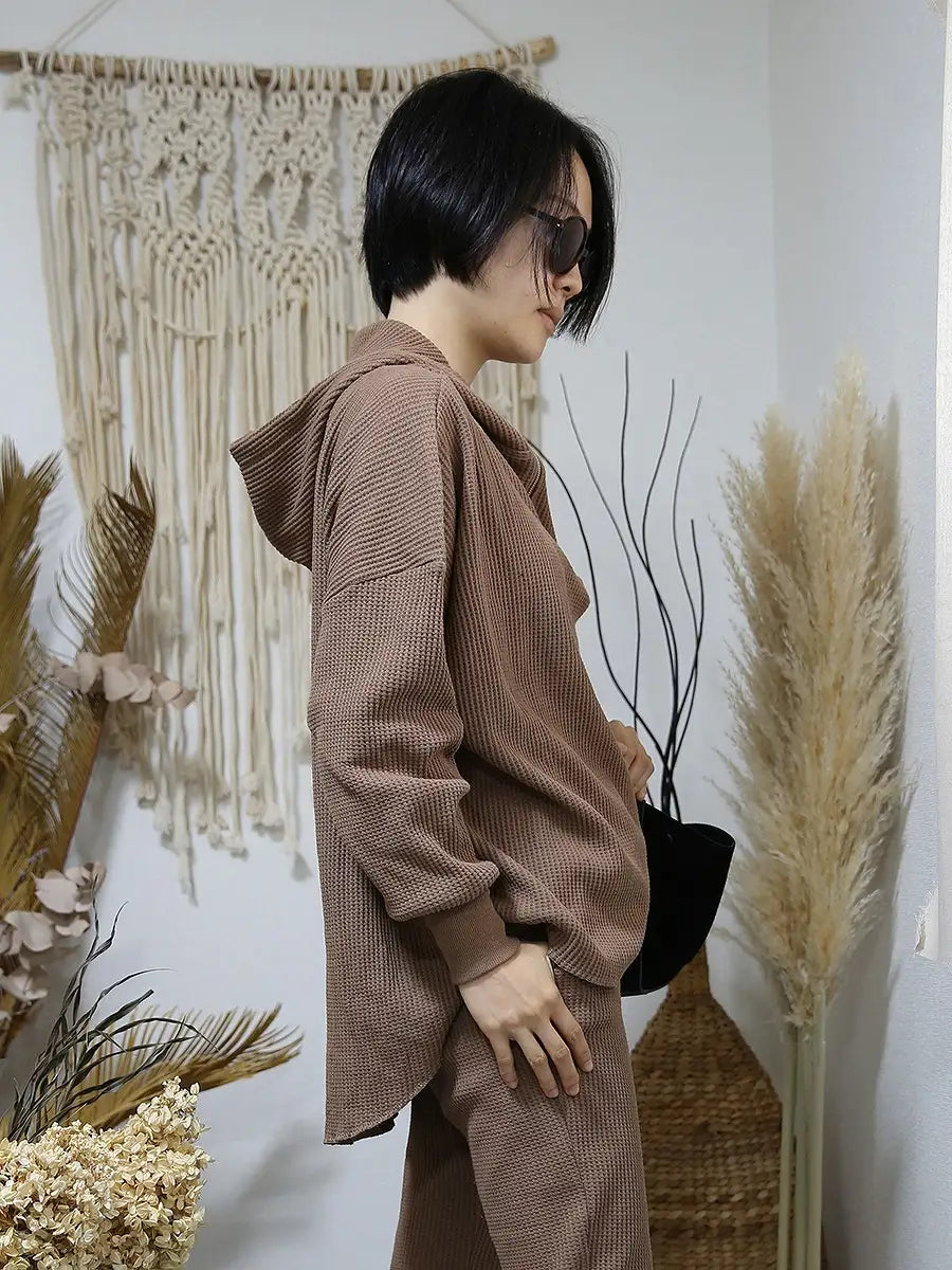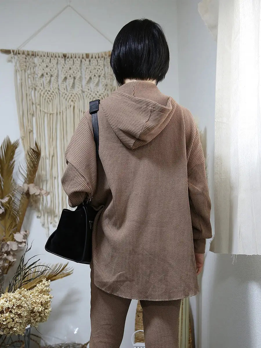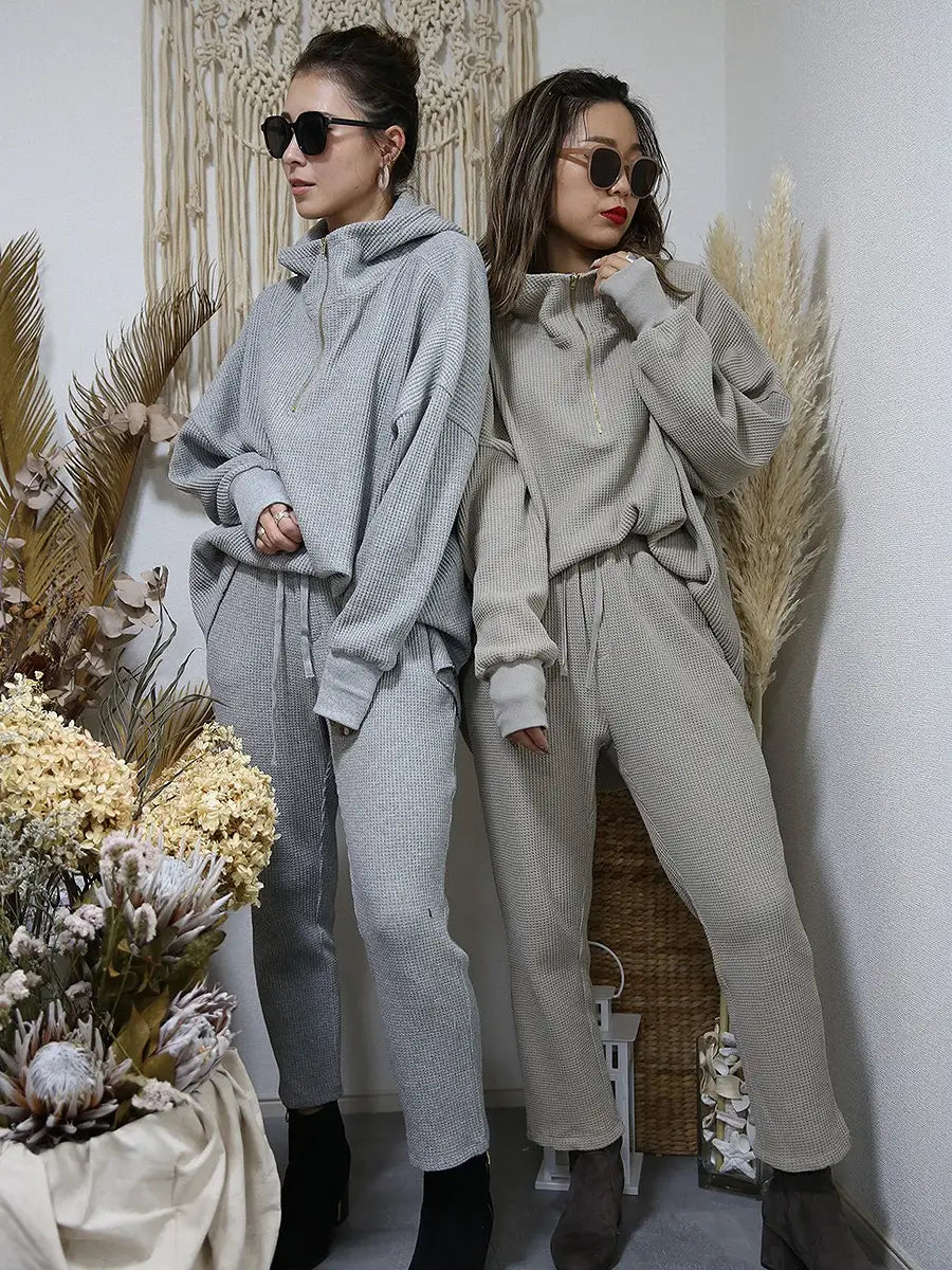 ワッフル生地のパンツやレギンス、マキシスカートと合わせて、ワンランク上の大人女子コーディネートをお楽しみください。