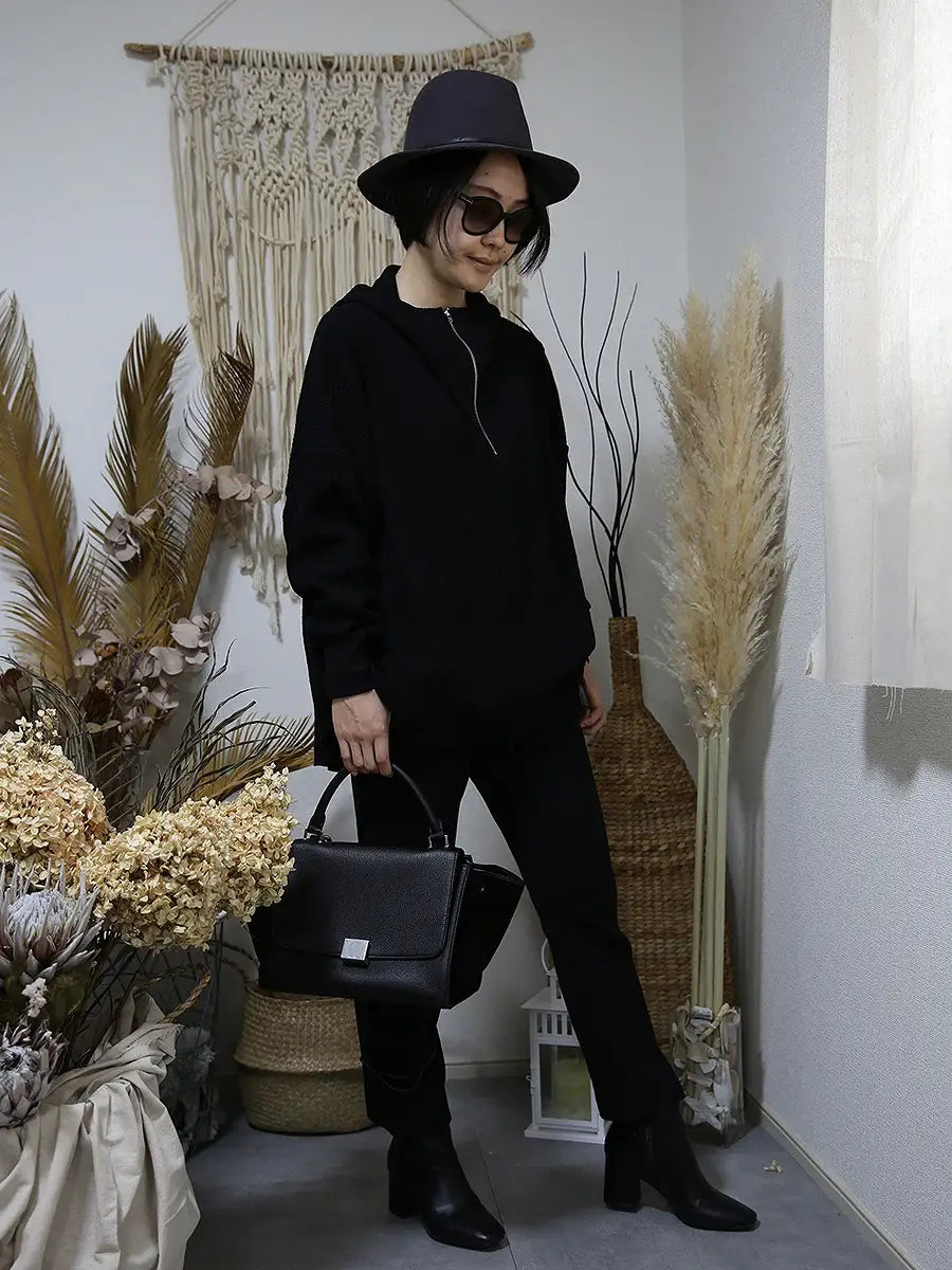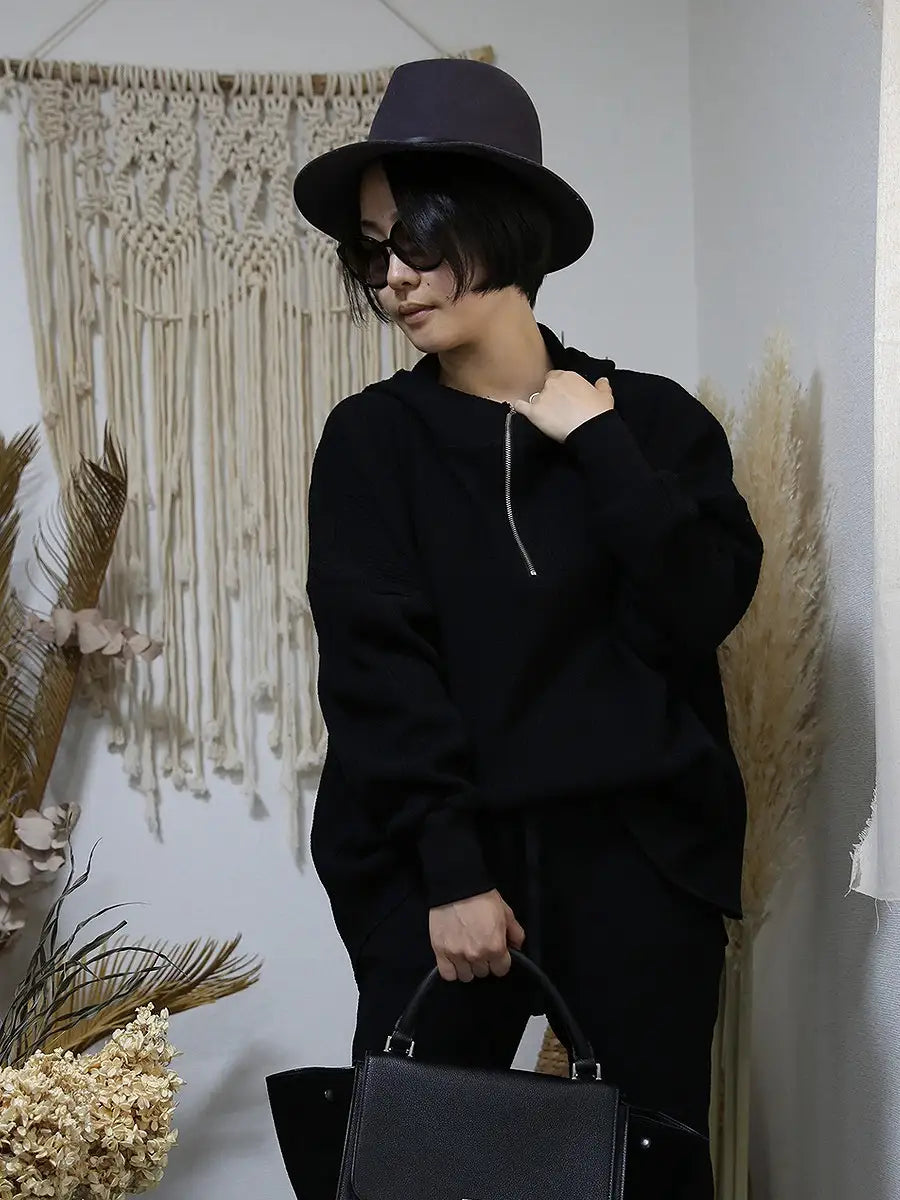 ハイネックデザインのオーバーサイズパーカーはお尻がすっぽり隠れる着丈感です。