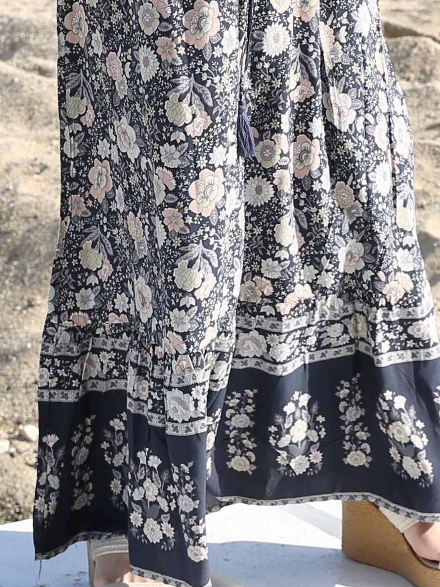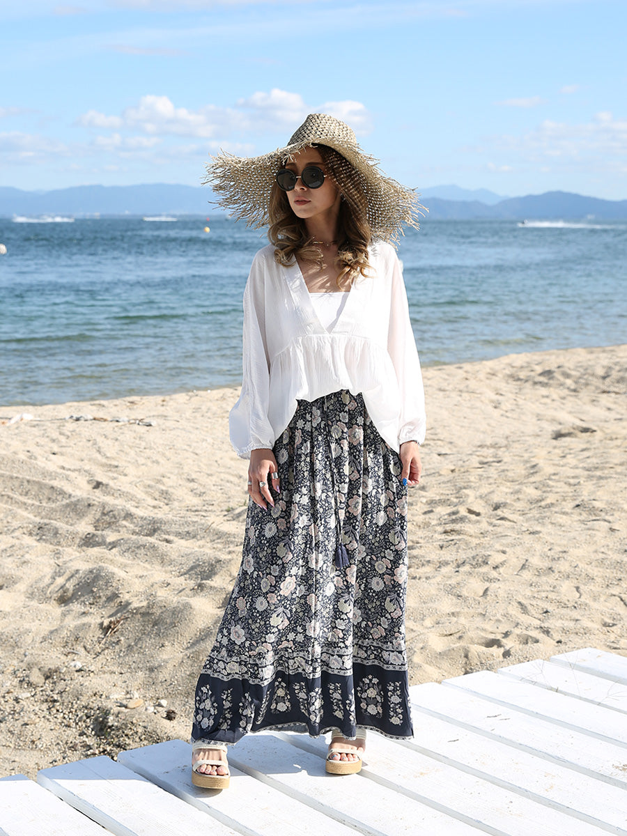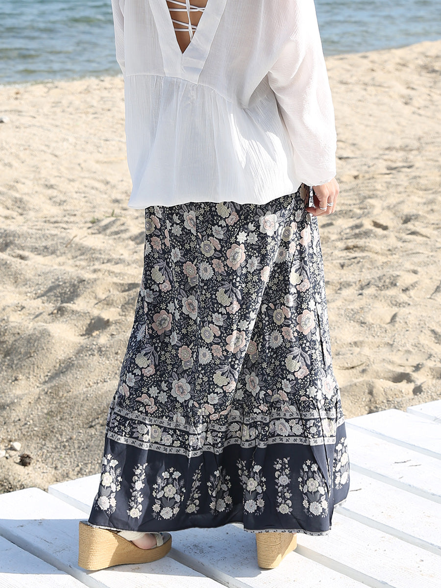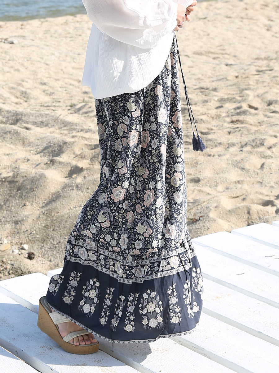 ボヘミアンな花柄が目を惹くマキシ丈ロングスカートです。 サラッと1枚で女性らしい雰囲気を醸し出してくれます。 フレアと落ち感が美しいシルエット。 大人気のAラインシルエットのスカートは華やかなコーデが楽しめます。 |