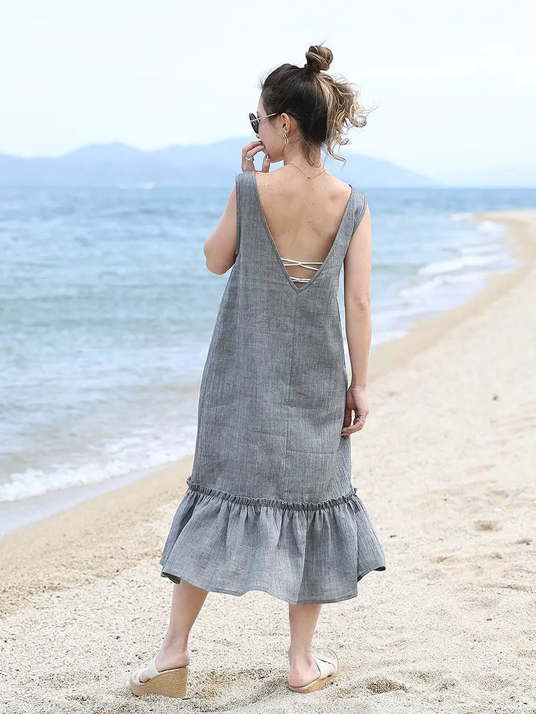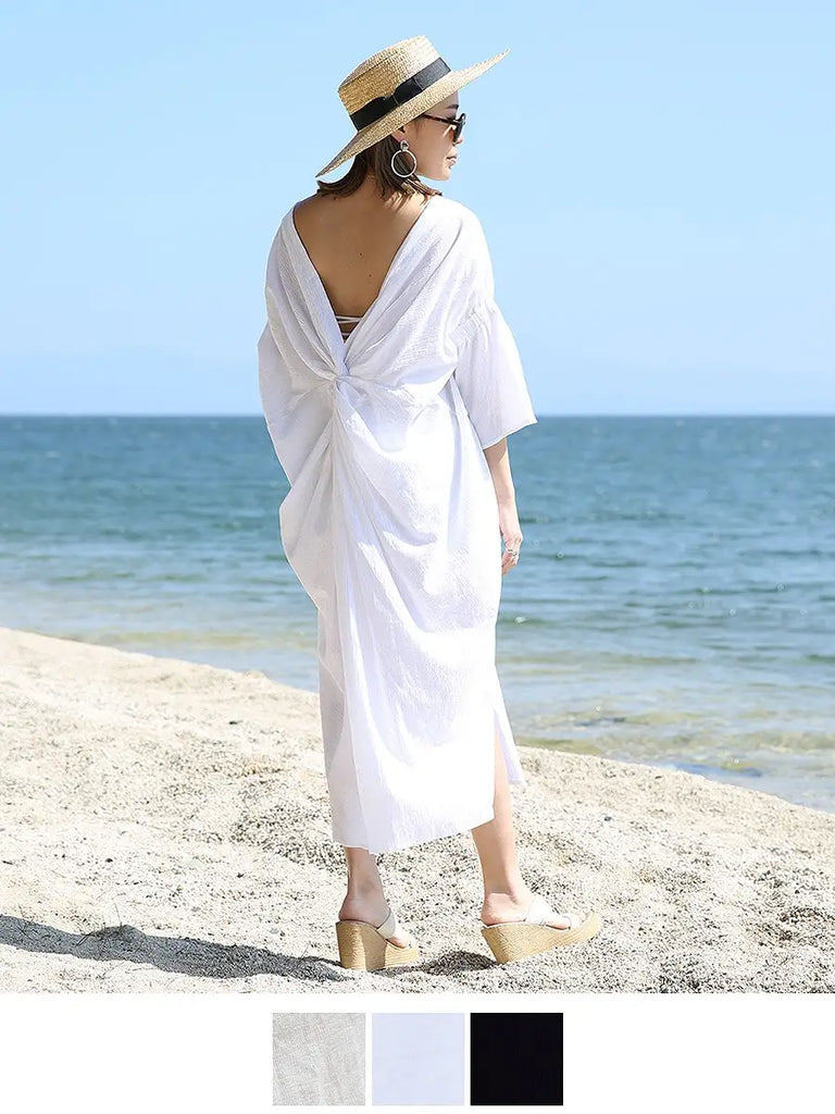 Sea Harbour(シーハーバー)コットンリネンバックシャンフレア袖マキシワンピース