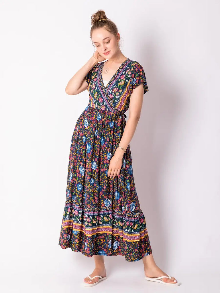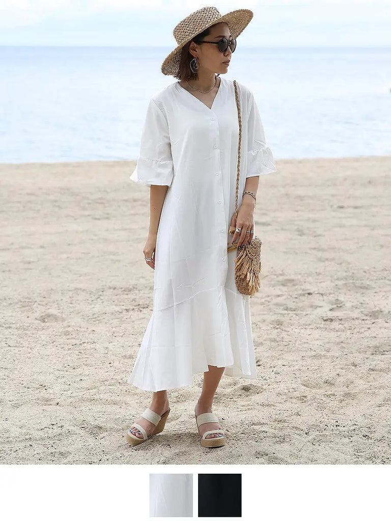 Sea Harbour(シーハーバー)フレンチスリーブ深Vネックコットンマキシワンピース