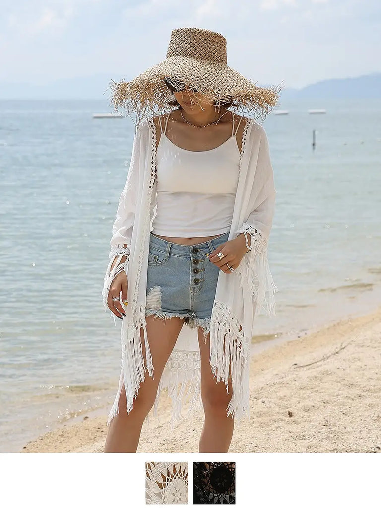 roomy by the sea(ルーミーバイザシー)背中ラウンドクロシェ編みフリンジカバーアップ羽織り
