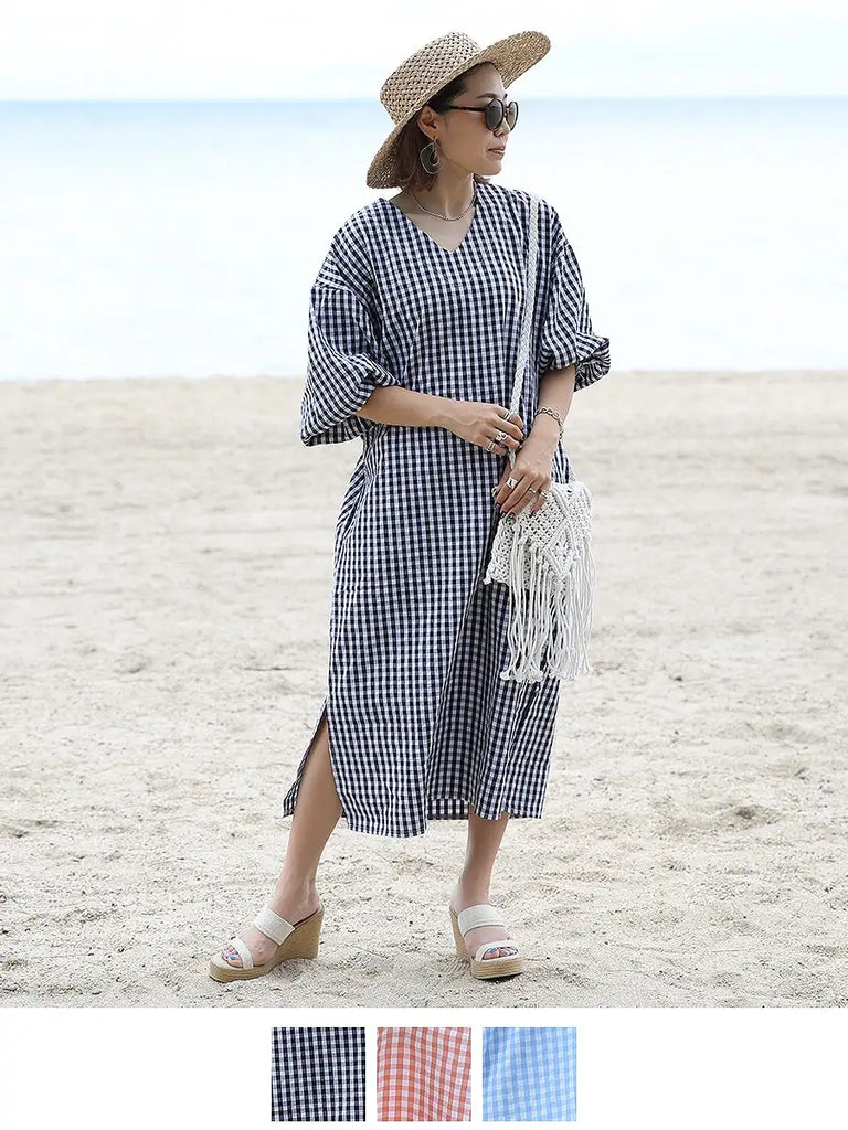 MOLABI(モラビ)近江ちぢみリネンカフタンマキシワンピース/ギンガムチェック柄