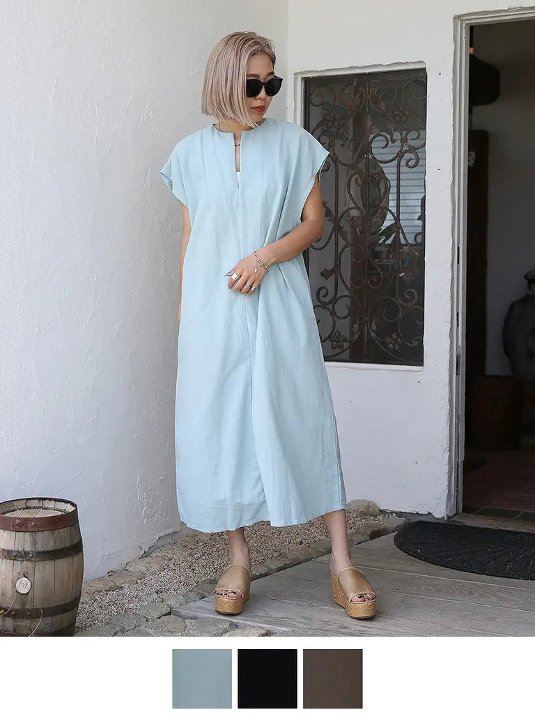 シンプル無地フレンチスリーブストレートマキシワンピース
