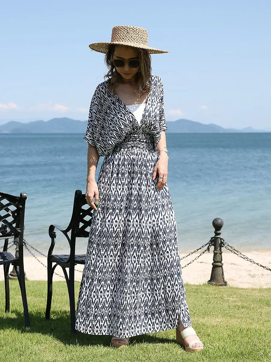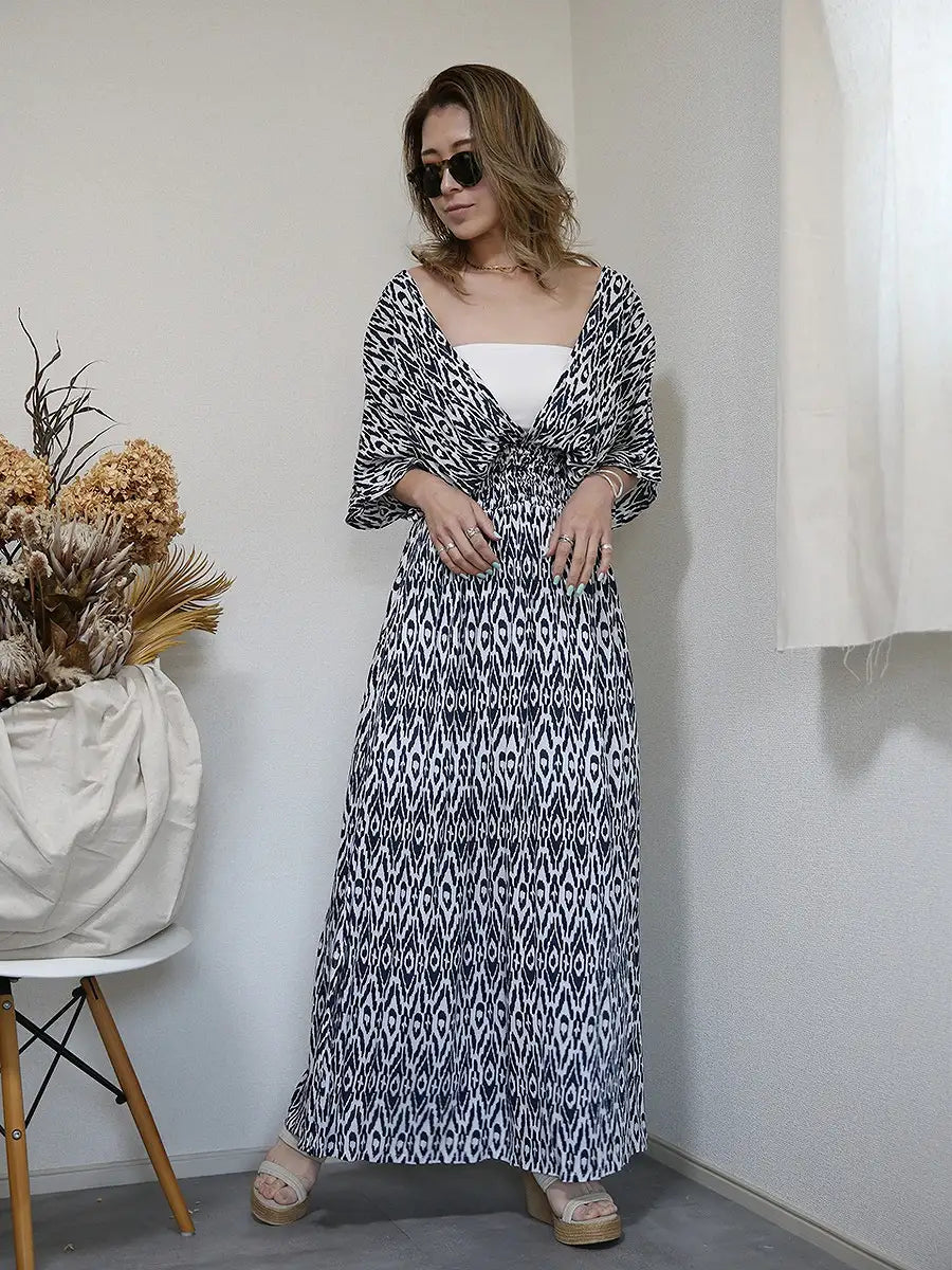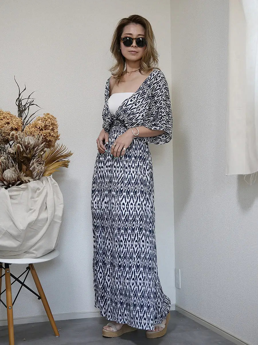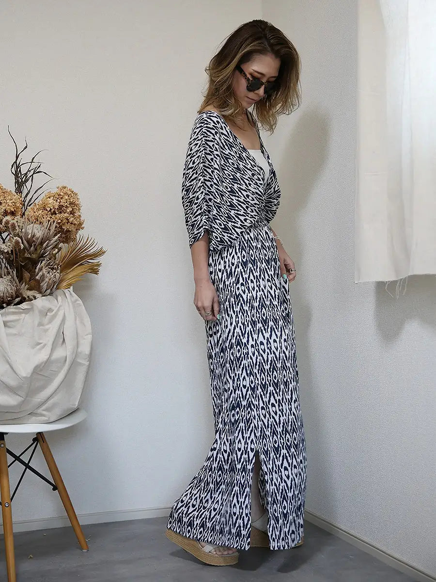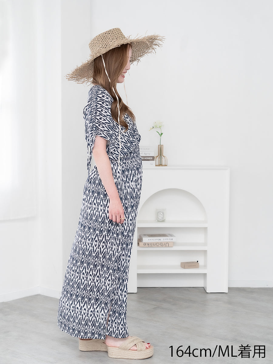 サラッとした質感のバティック柄Vネックマキシワンピースです。