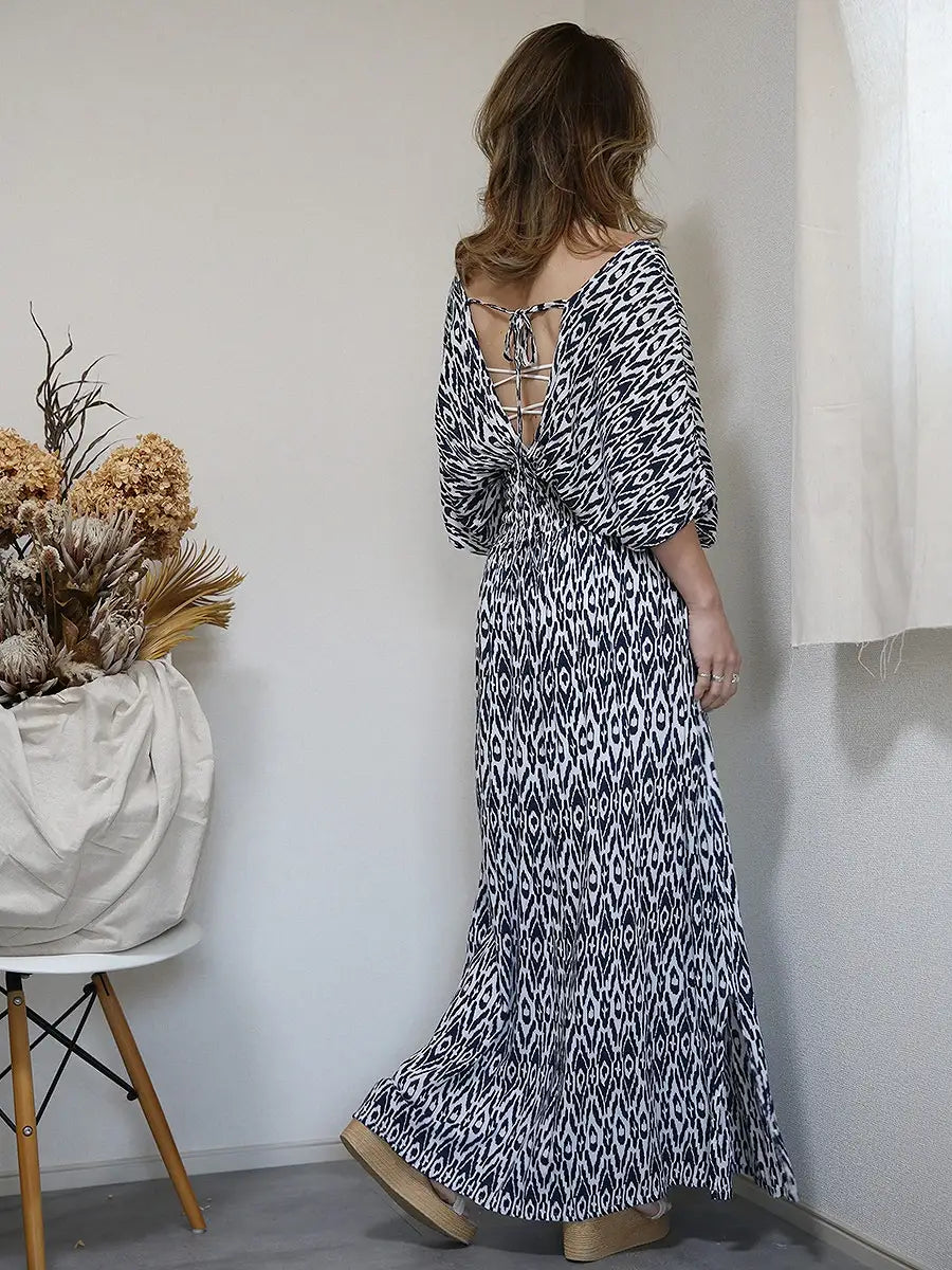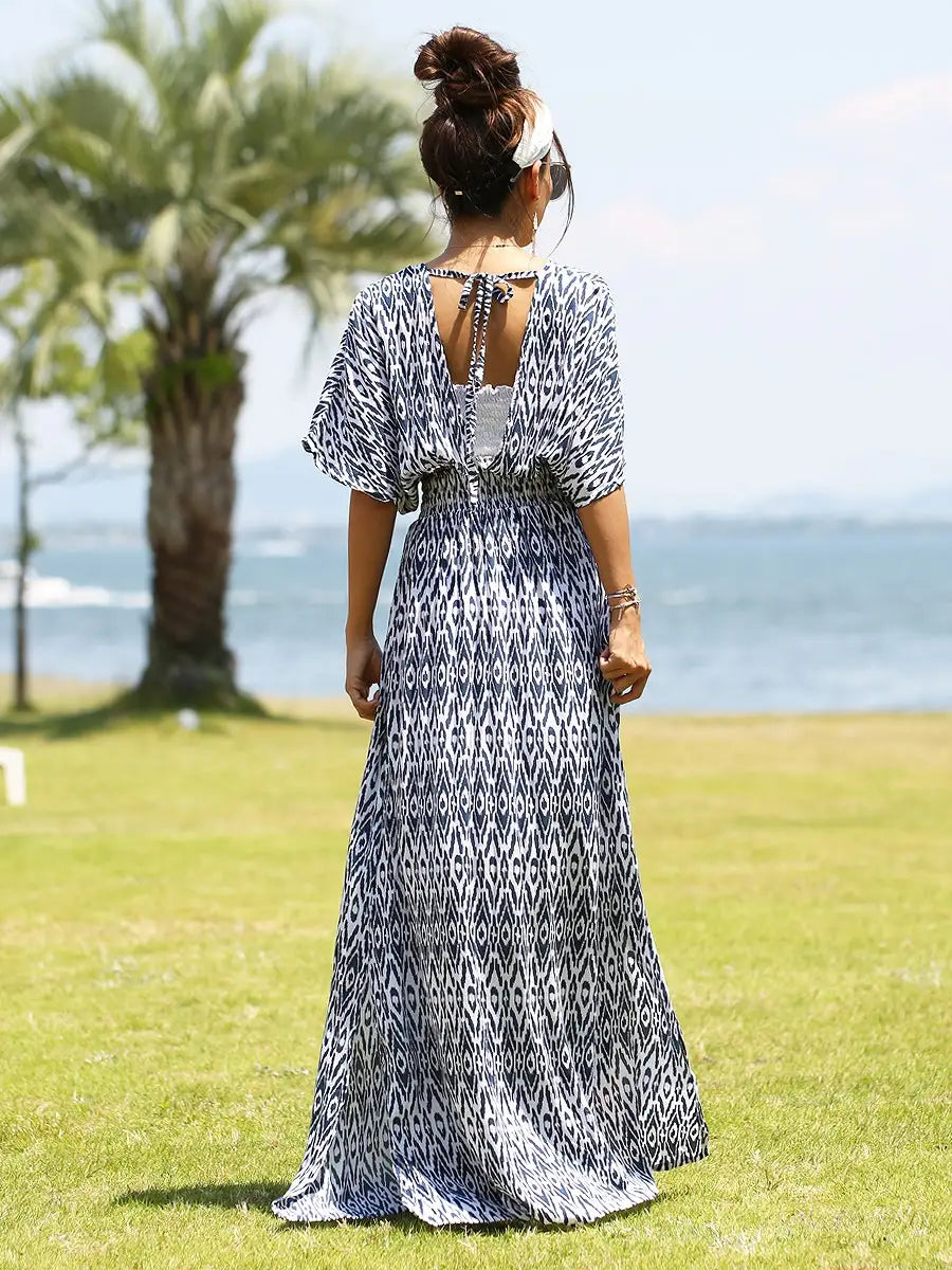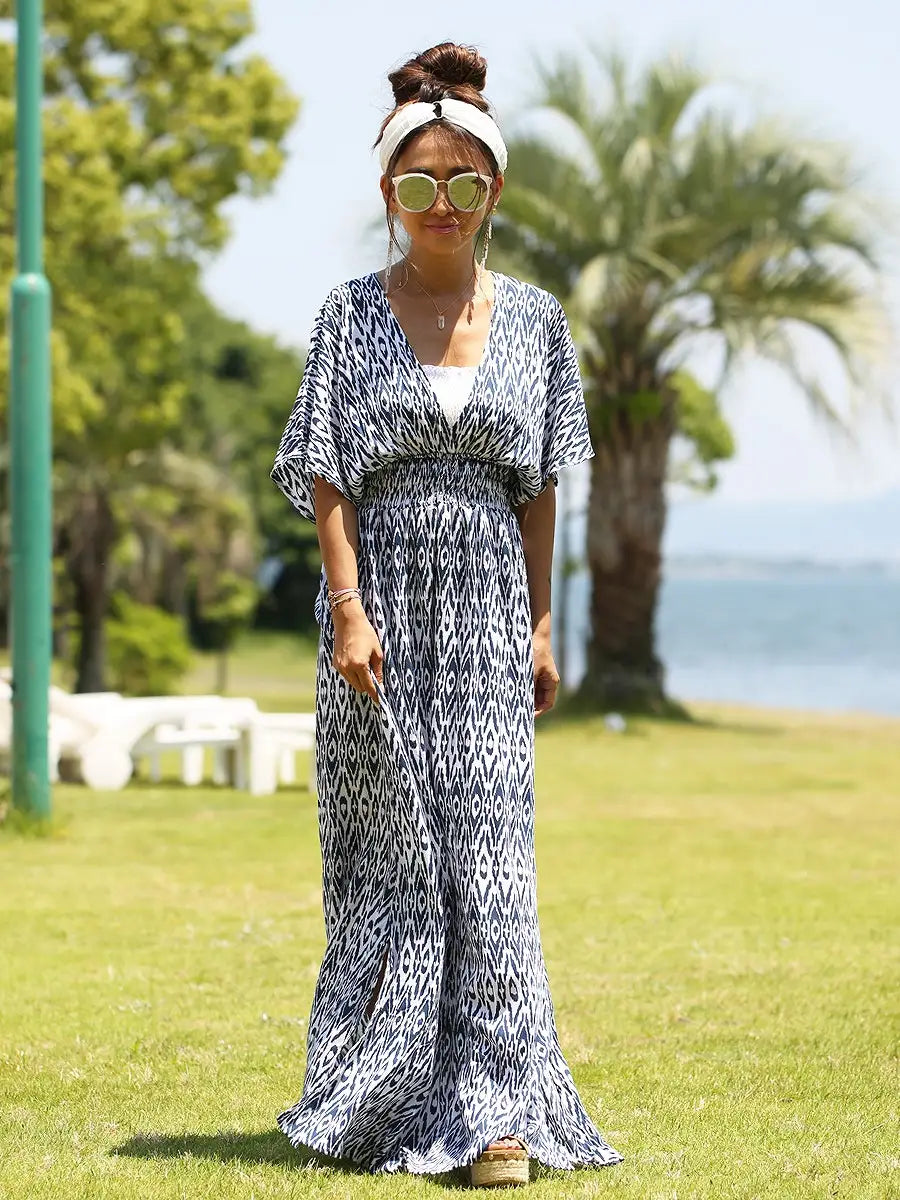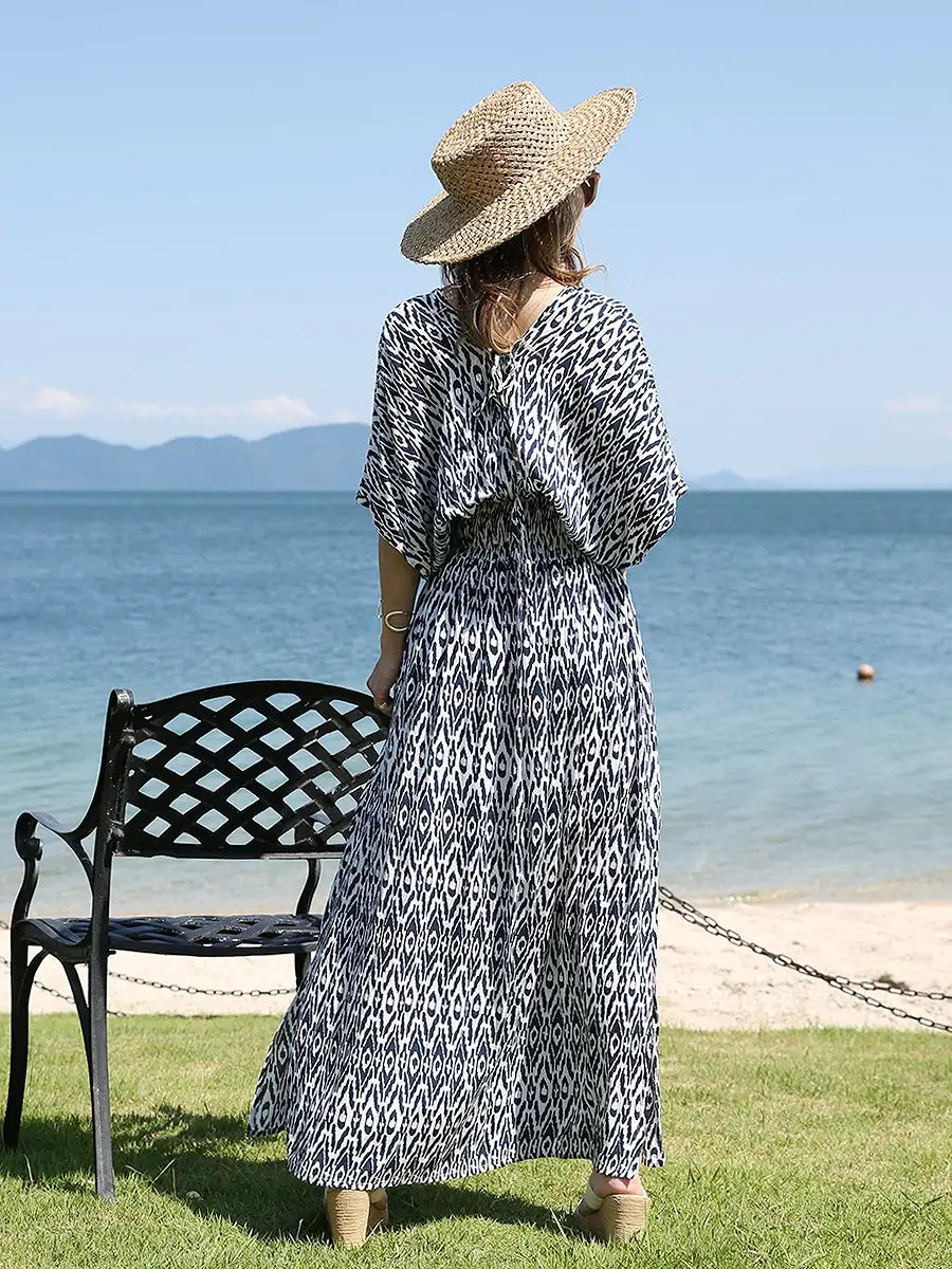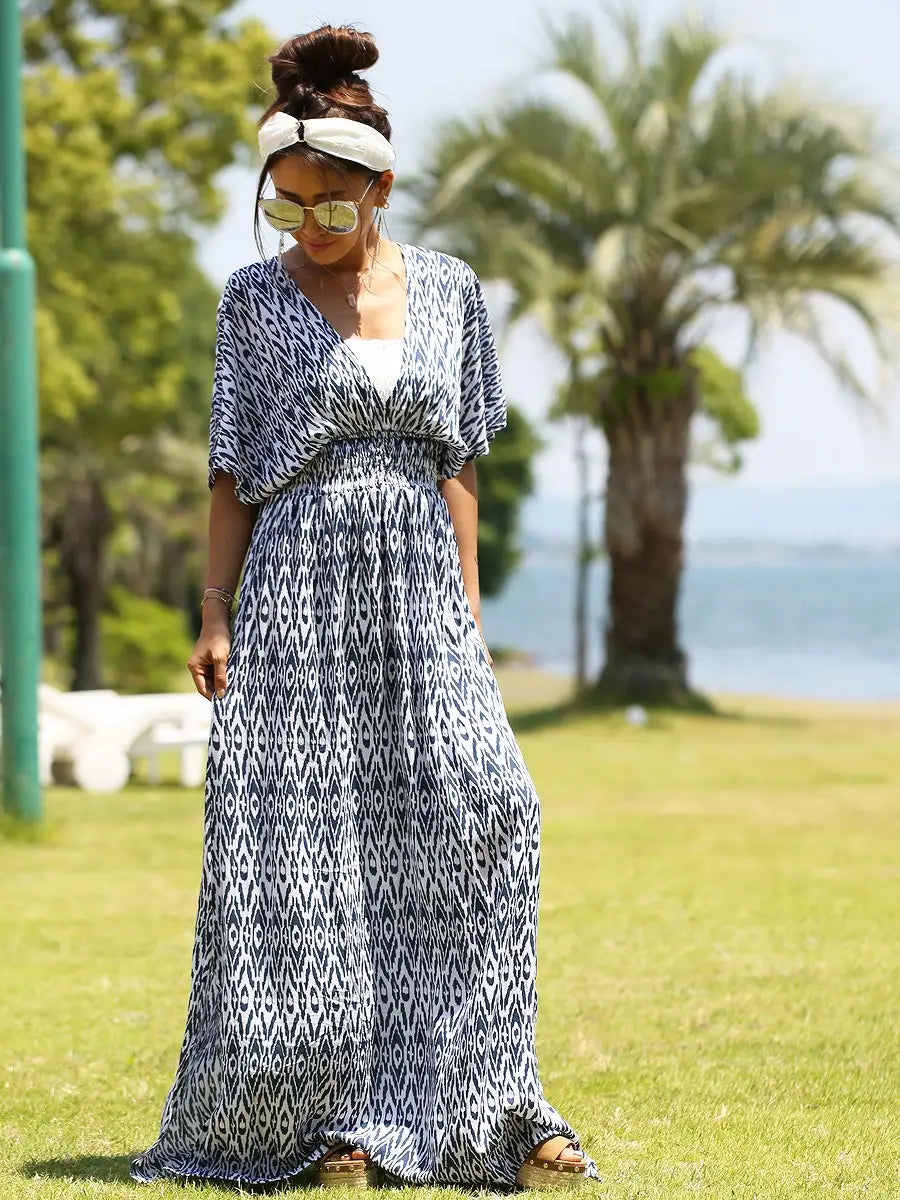 サラッとした質感のバティック柄Vネックマキシワンピースです。