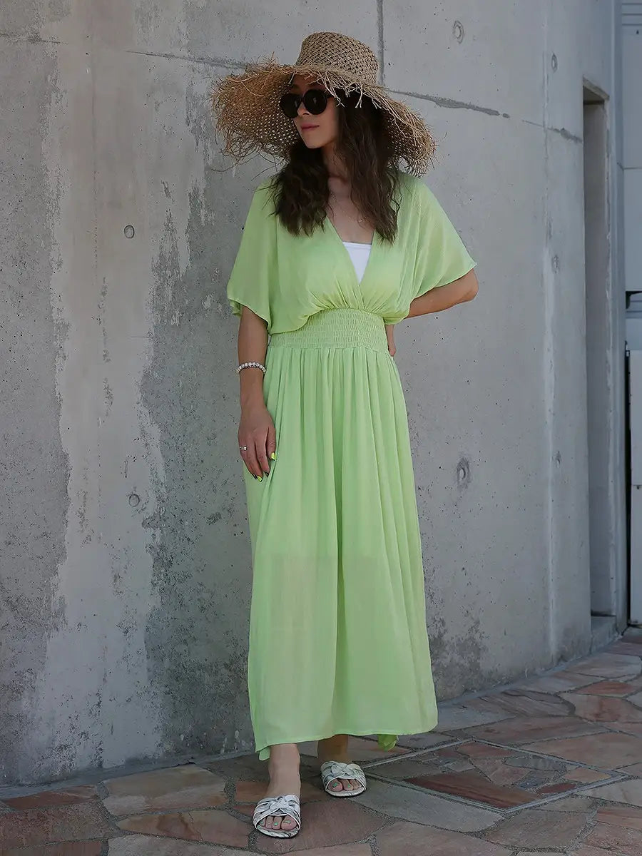 胸元が深いVネックになっていて、デコルテをきれいに演出してくれるマキシワンピです。