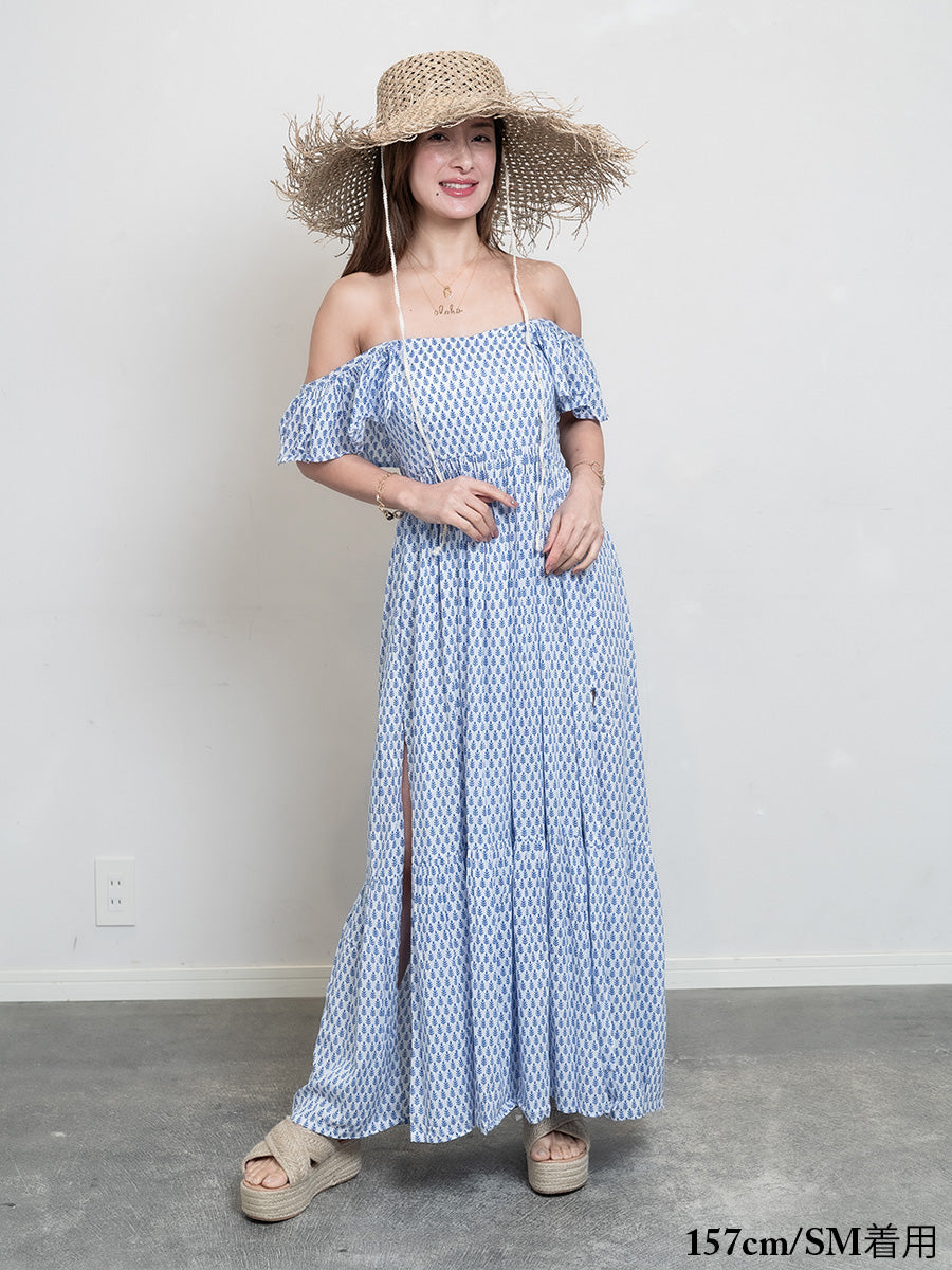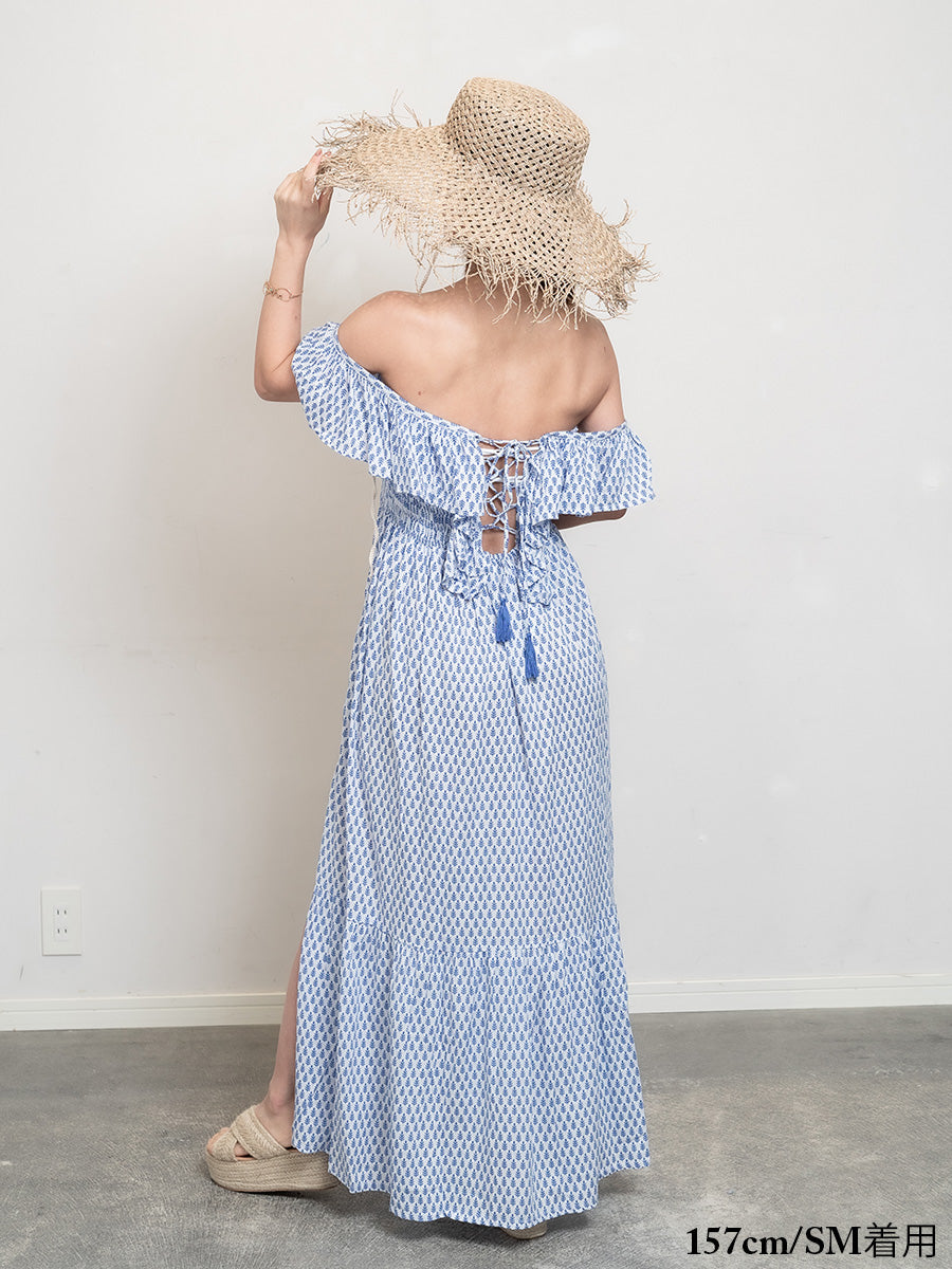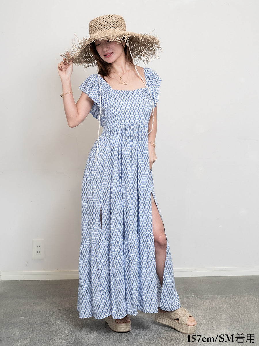 LAUT BLUE(ラウトブルー)フリル背中クロスマキシワンピース/リトルリーフ柄
