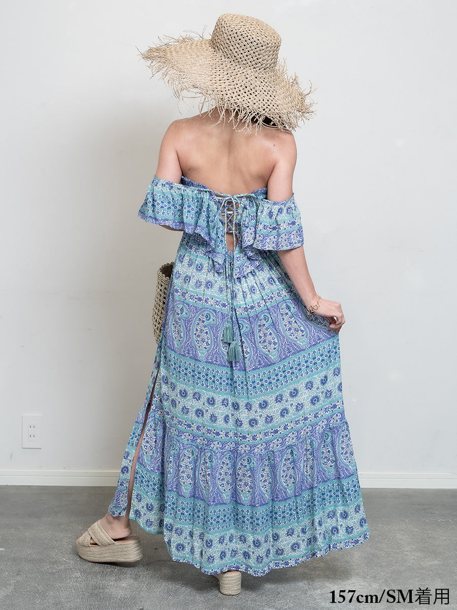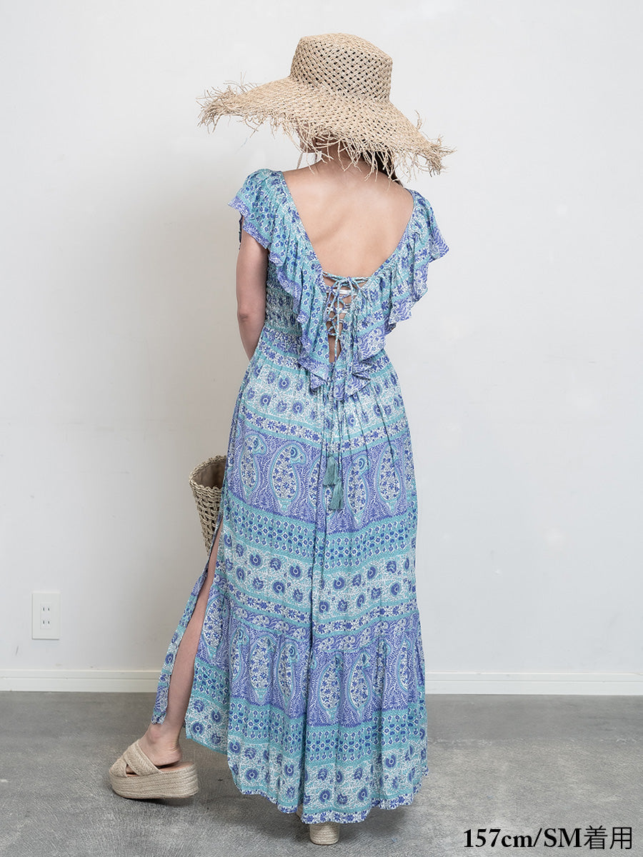 LAUT BLUE(ラウトブルー)フリル背中クロスマキシワンピース/ペイズリー柄