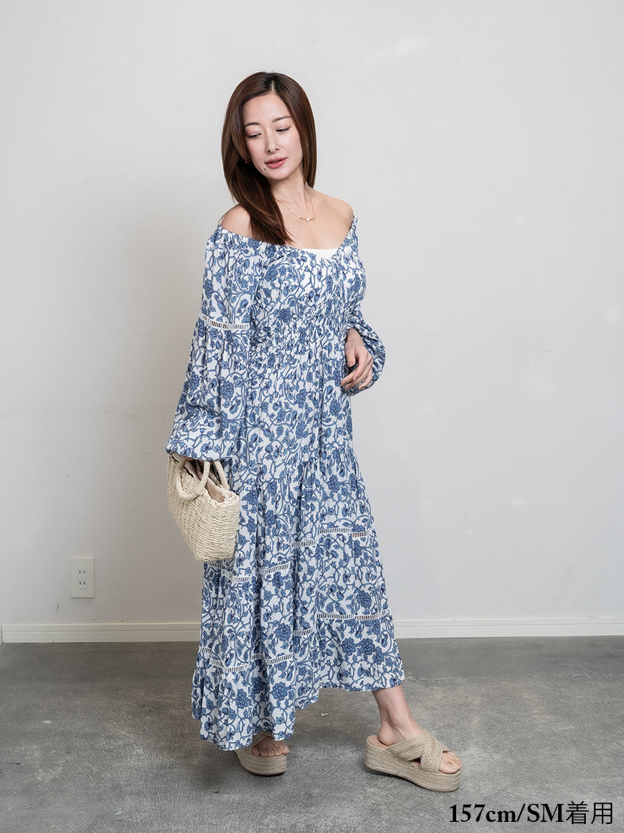 LAUT BLUE(ラウトブルー)ティアード長袖ロングワンピース/ブルー花柄