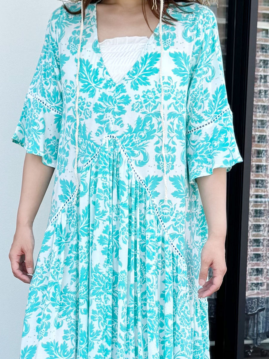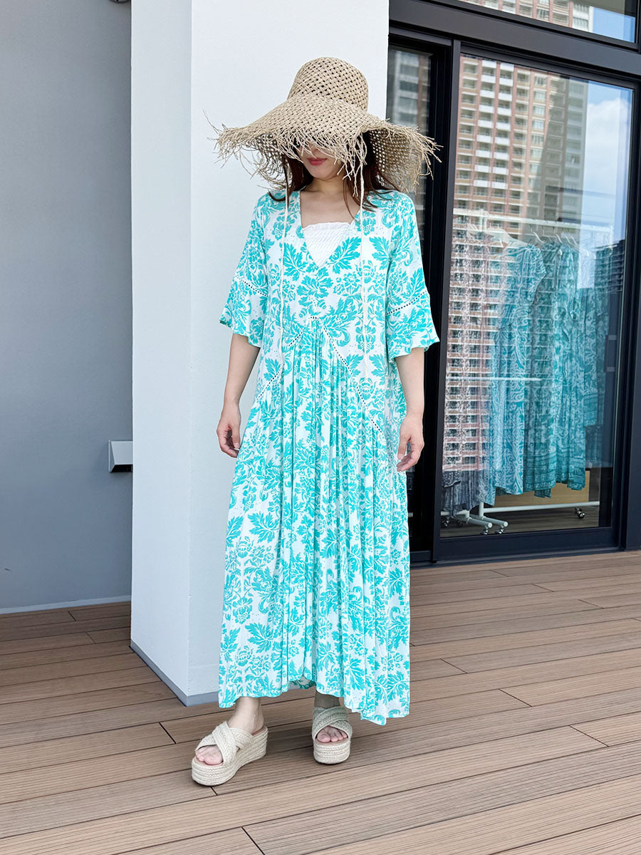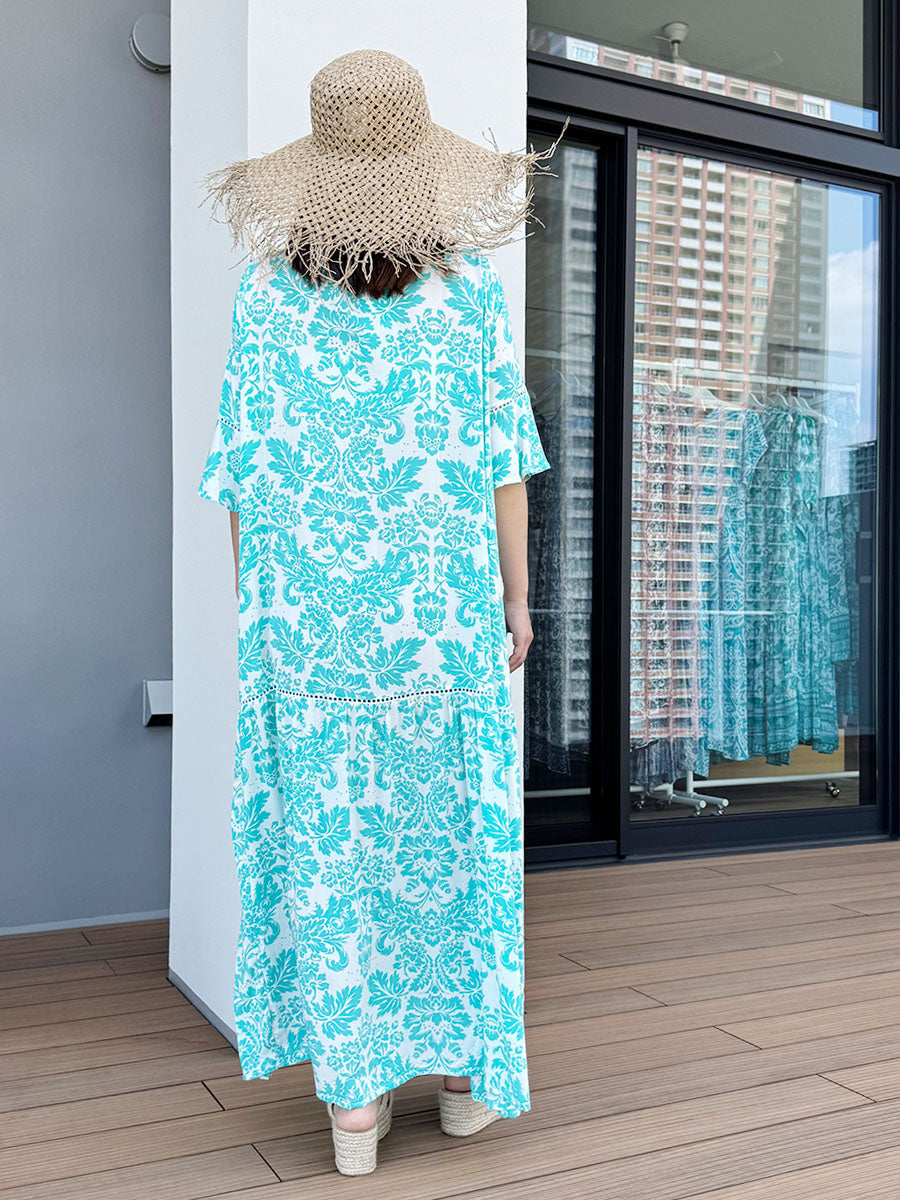 LAUT BLUE(ラウトブルー)レース切り替えハイローマキシワンピース/ターコイズダマスク柄