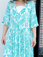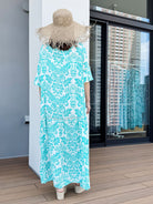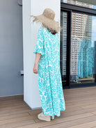 爽やかなターコイズダマスク柄の大人リゾートワンピースです。 五分袖になっていて、裾に向かって広がるAラインデザインで着痩せ効果◎ 前後で着丈が異なるおしゃれなハイローデザインです。 たっぷり生地を贅沢に使用したマキシワンピースは夏コーデに大活躍します。 落ち着いたカラー、デザインなので、ビーチ・リゾートシーンはもちろん普段着としても! |