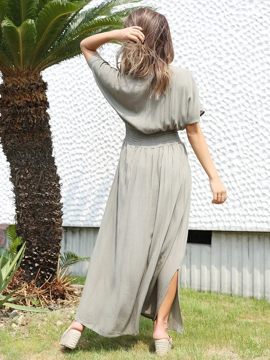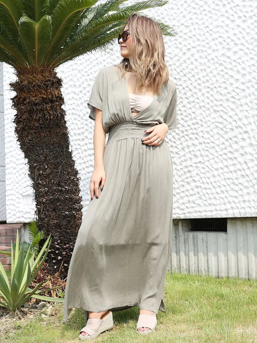 胸元が深いVネックになっていて、デコルテをきれいに演出してくれるマキシワンピです。