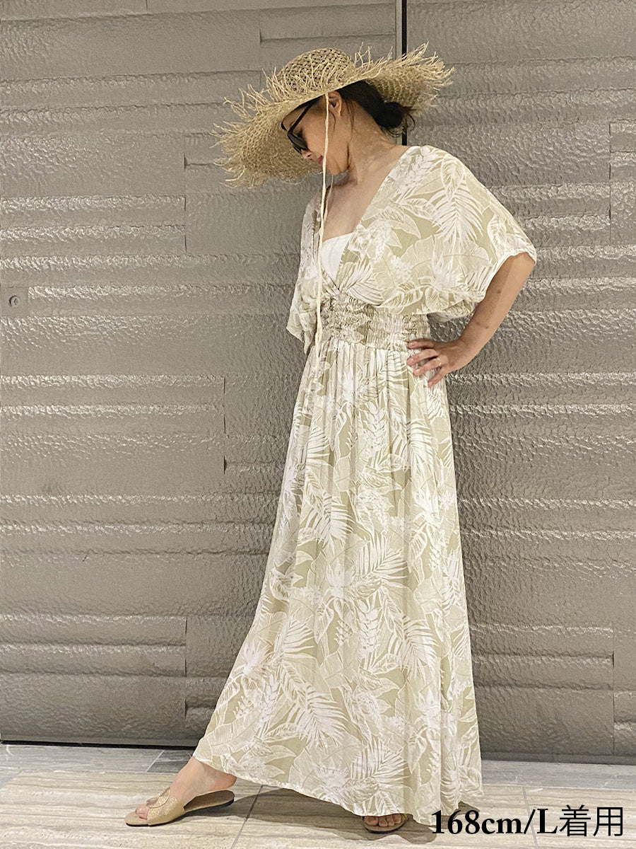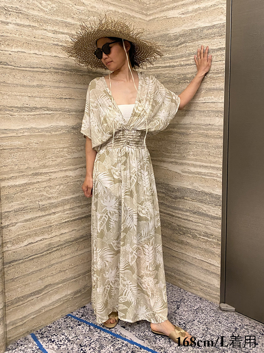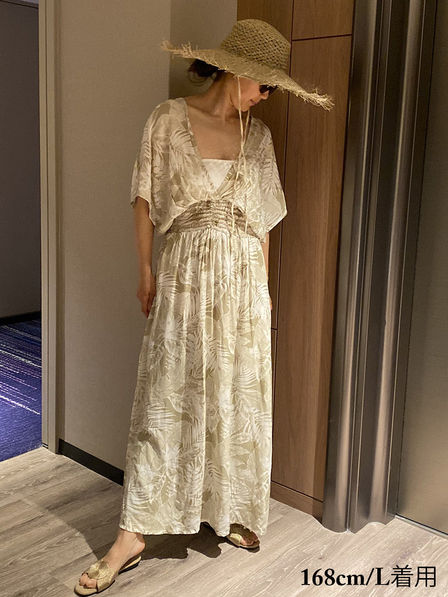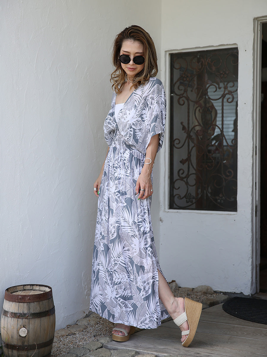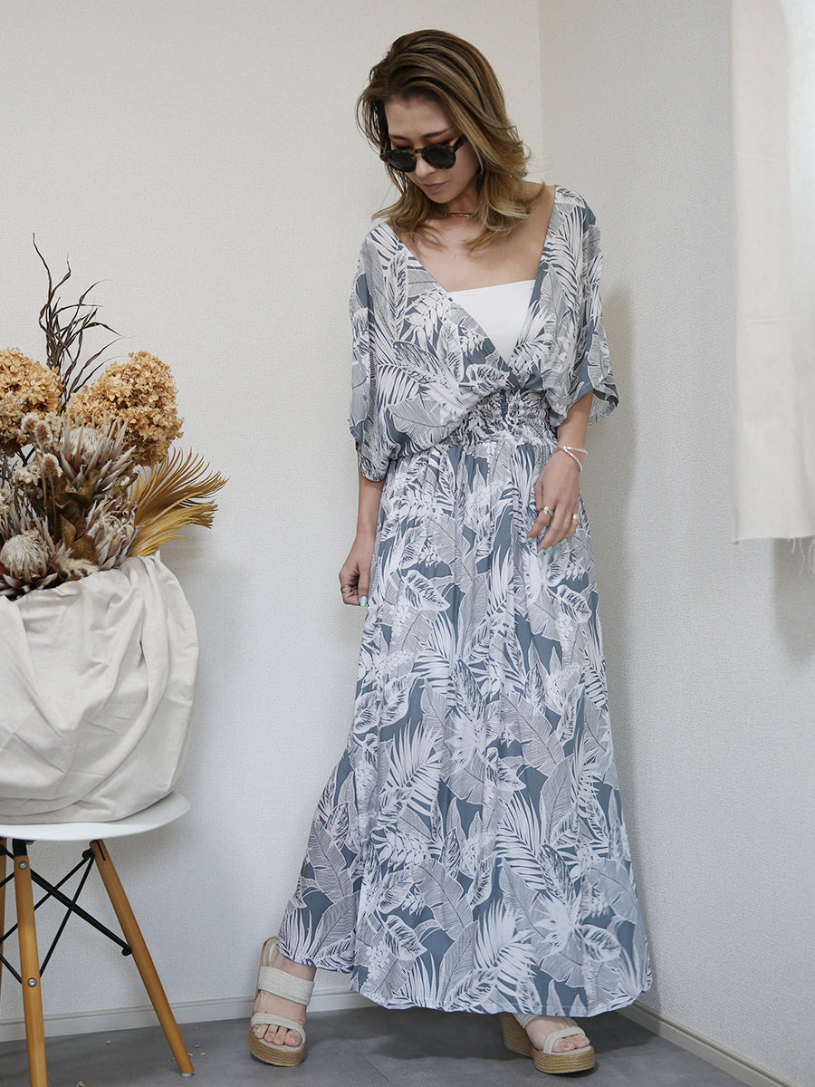 落ち着いたグレーのボタニカル柄リゾートワンピースはサラッと1枚でお洒落なリラックスコーデが完成します。