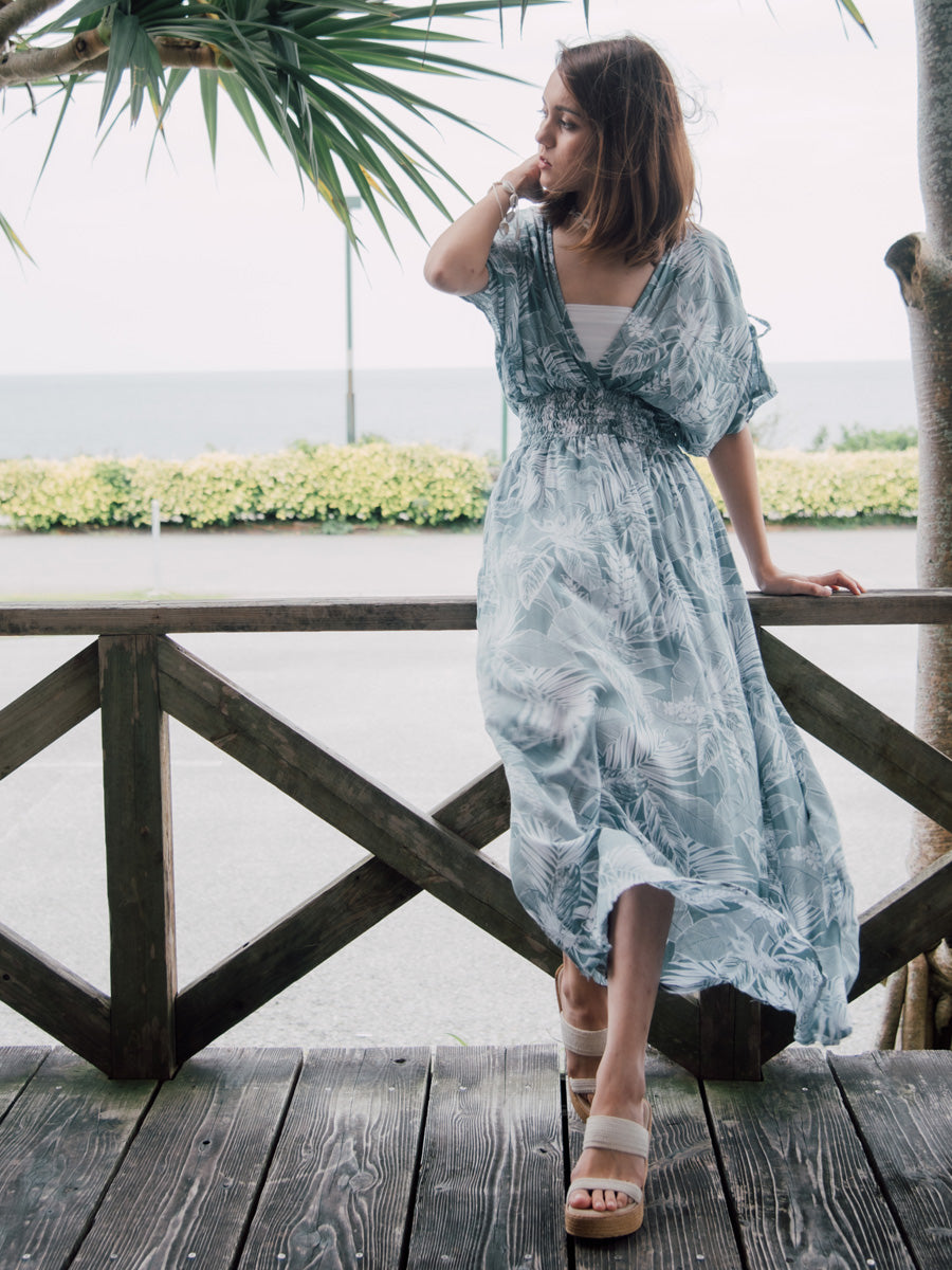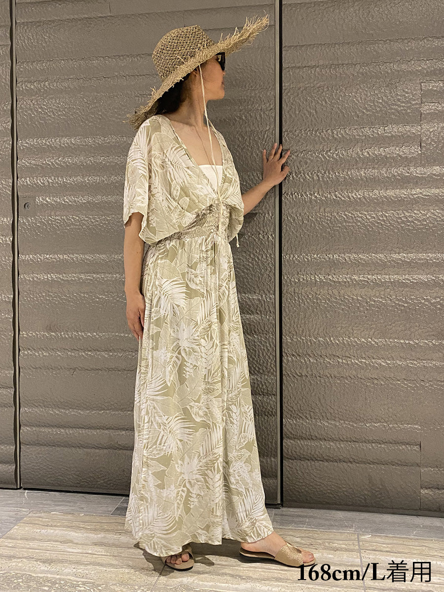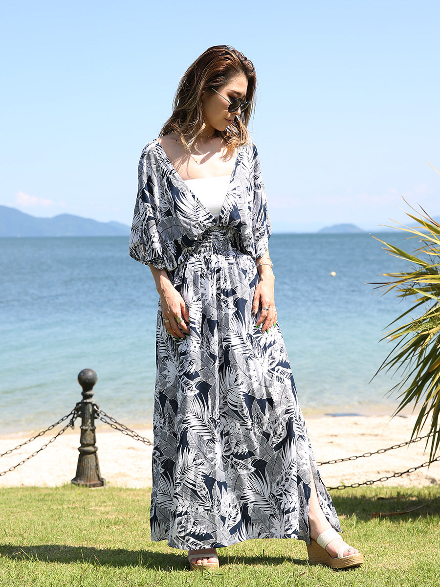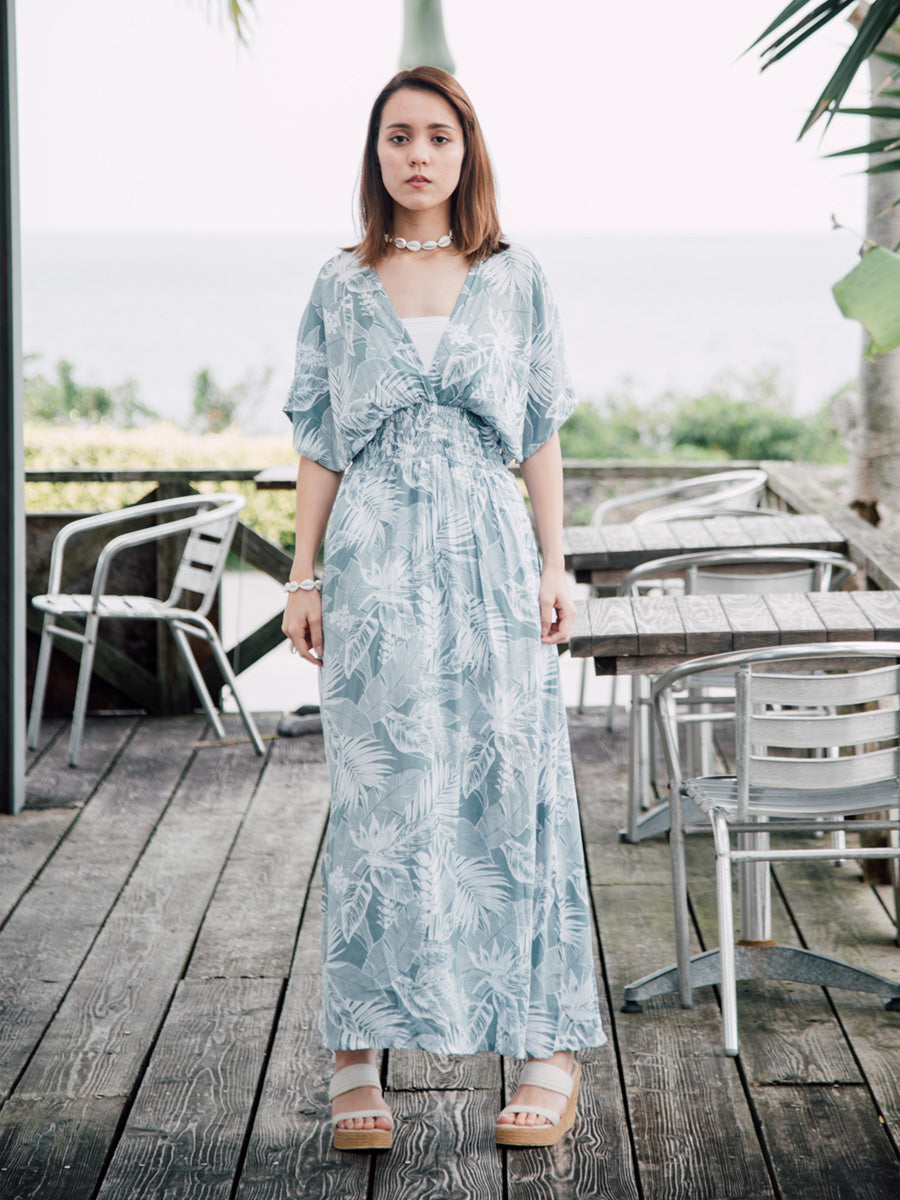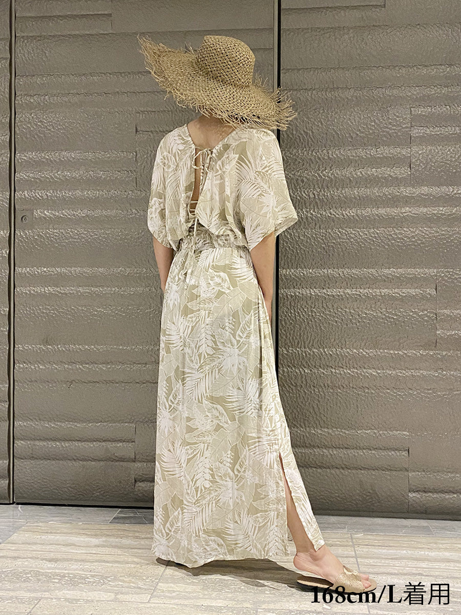落ち着いたグレーのボタニカル柄リゾートワンピースはサラッと1枚でお洒落なリラックスコーデが完成します。