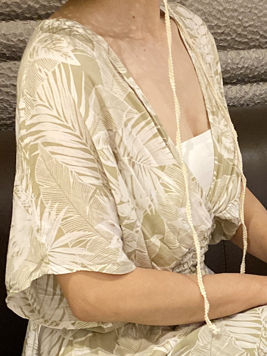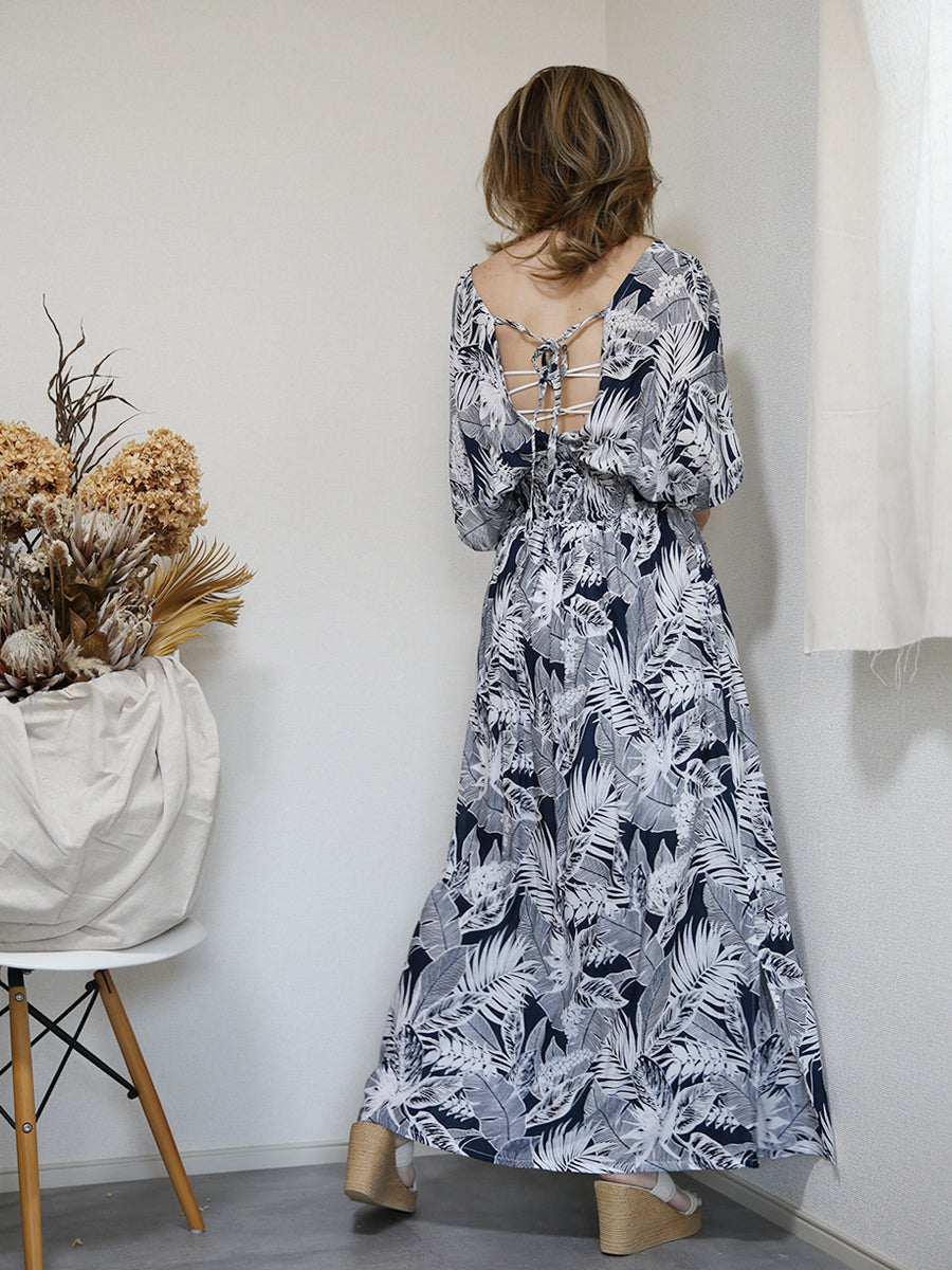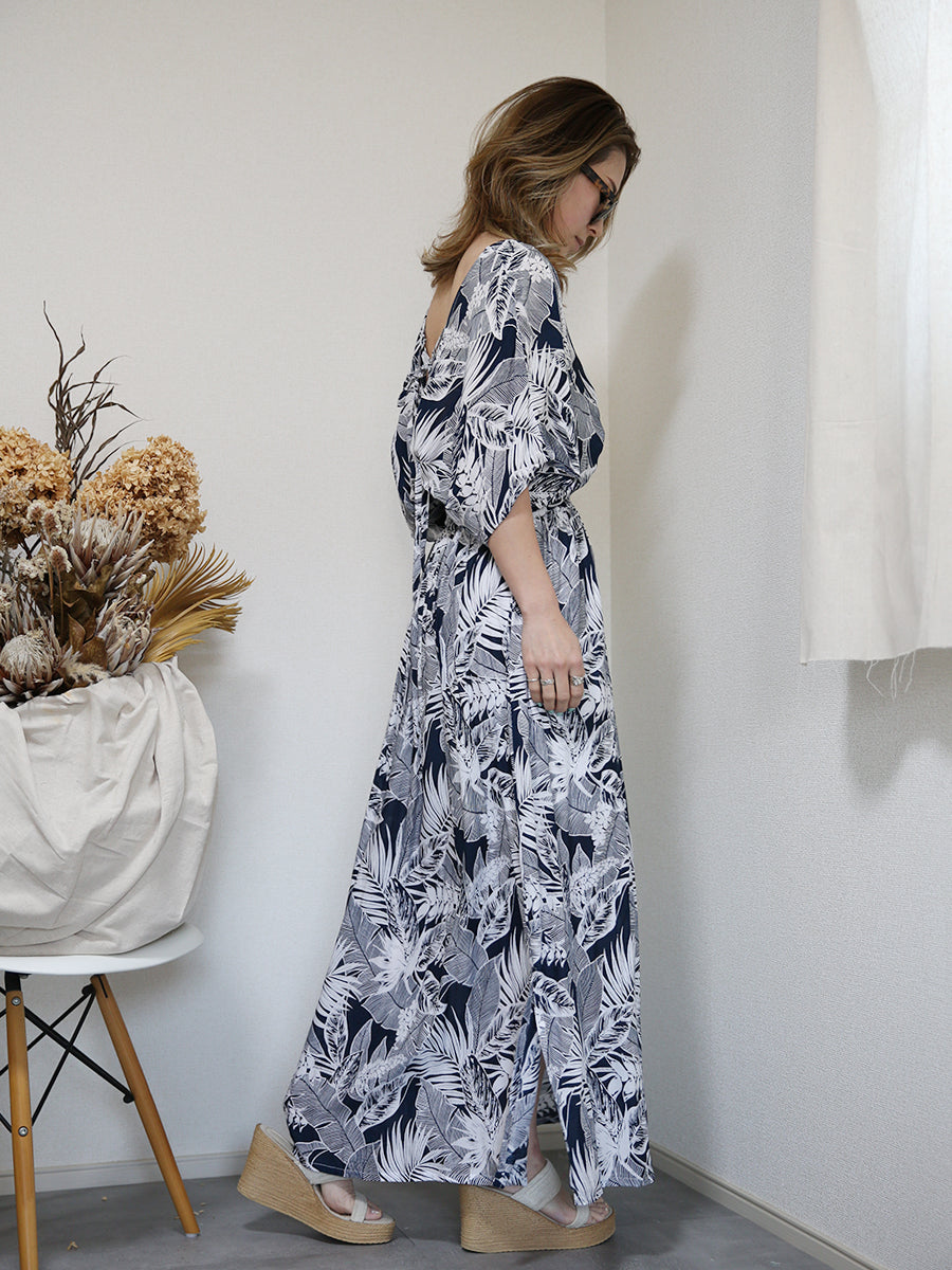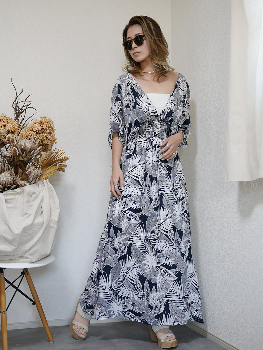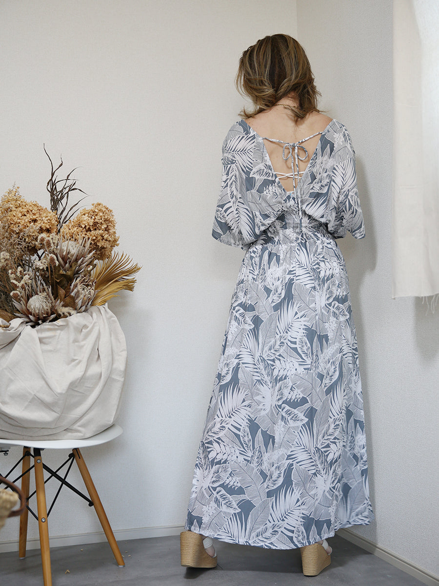 落ち着いたグレーのボタニカル柄リゾートワンピースはサラッと1枚でお洒落なリラックスコーデが完成します。