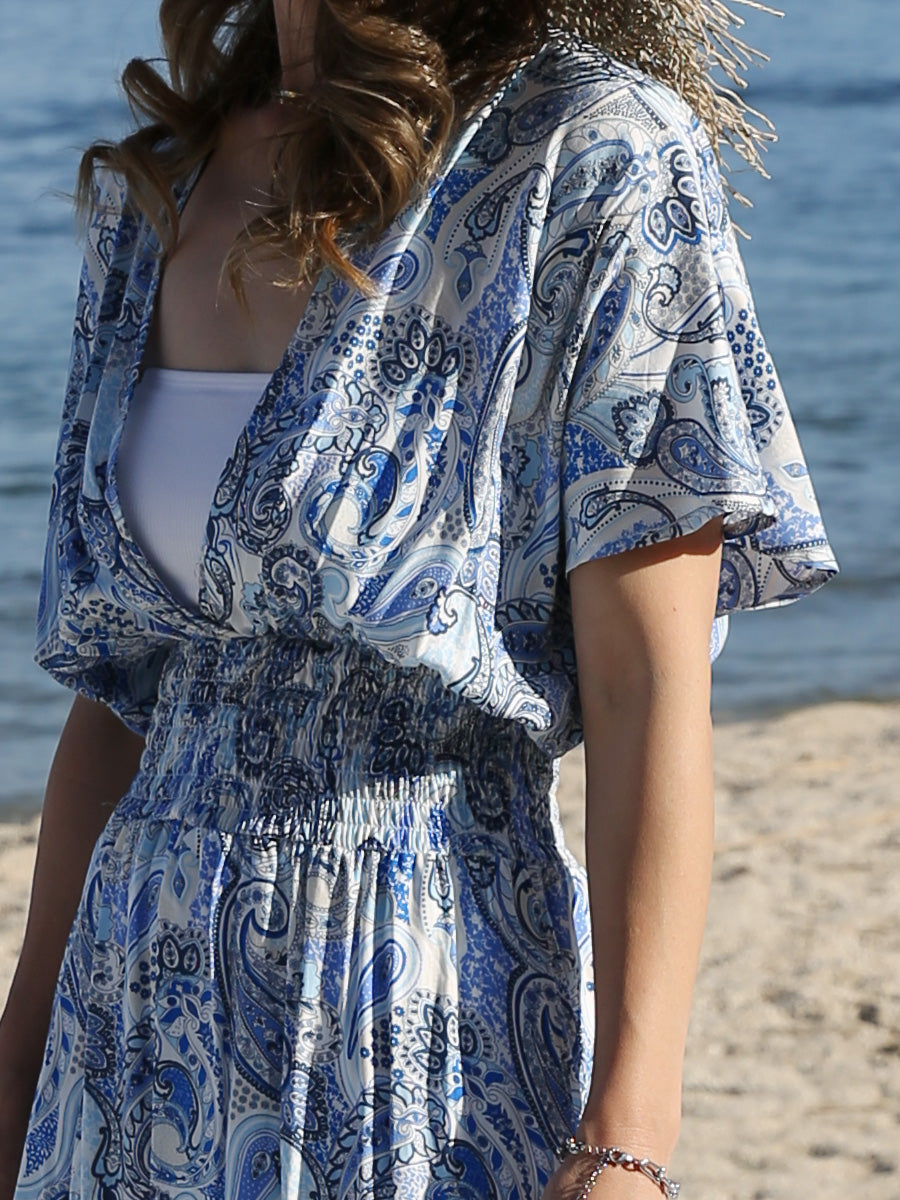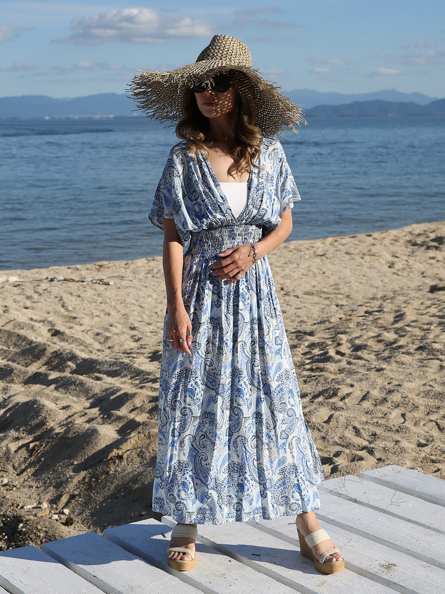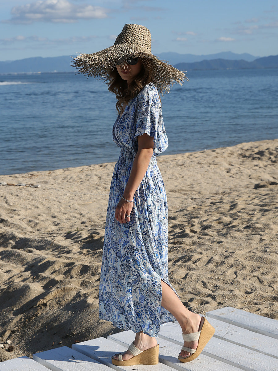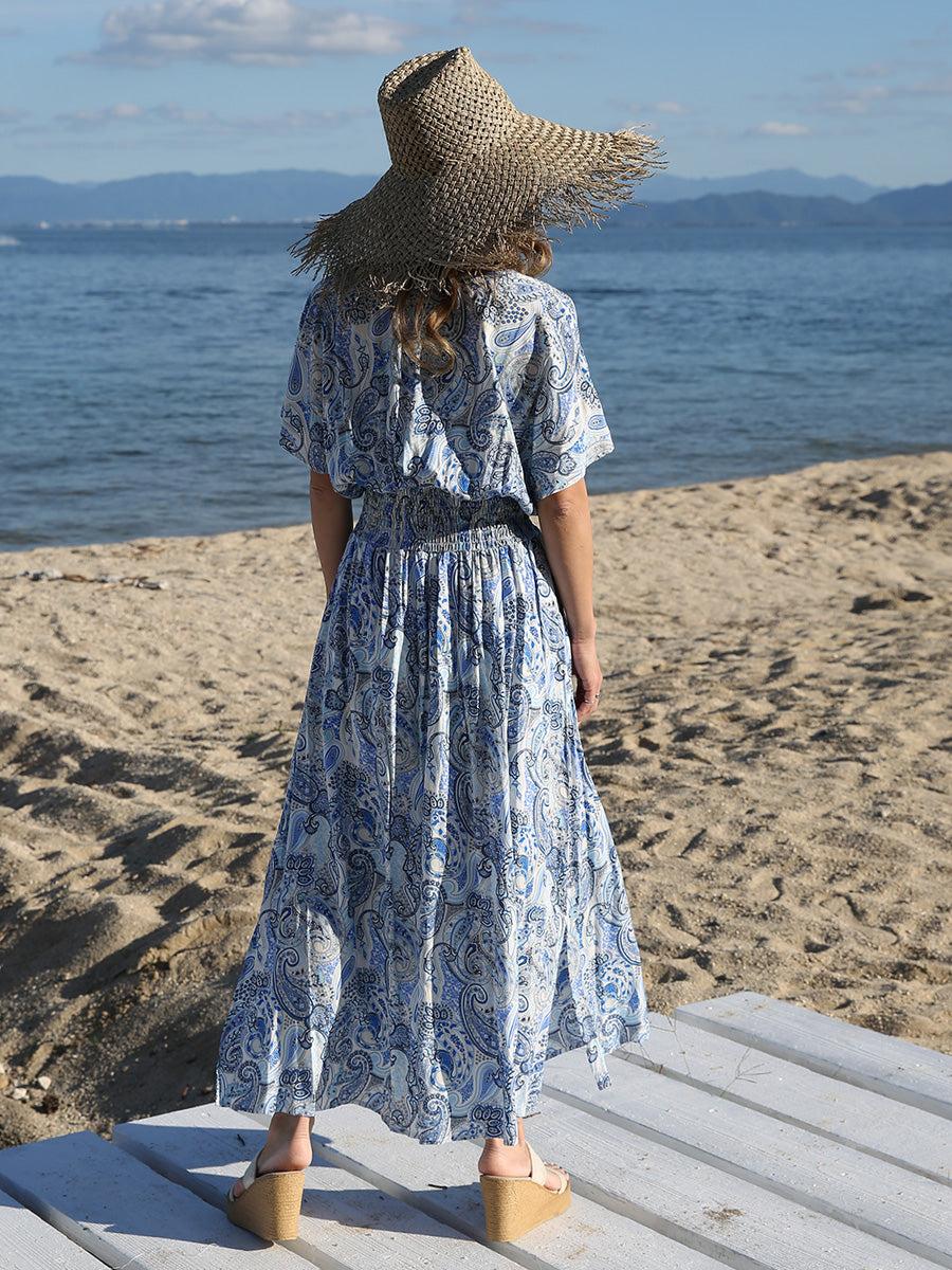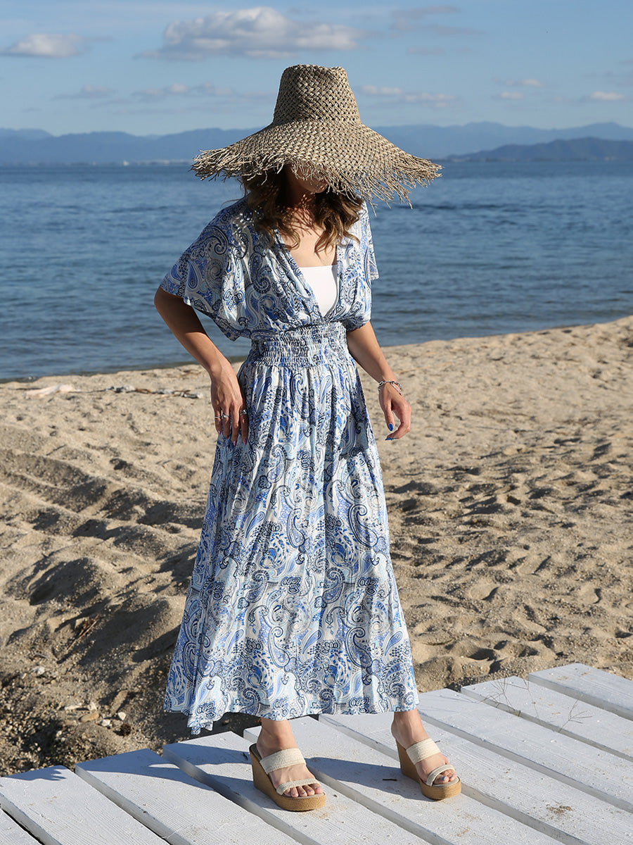 ハワイ旅行や沖縄旅行で大活躍してくれる大人のリゾートワンピース。 目を惹く綺麗なブルーカラーのペイズリー柄プリント! 裾に向かって広がるAラインシルエットでサラッと1枚でスタイルアップが叶います。 胸元のVネックは上品でシャープな印象を与えてくれるデザインです。首回りをスッキリ見せてくれ、小顔効果があります。 ハイウェストシャーリングデザインで脚長効果、着丈調整が可能です。 両サイドにはスリットが入っており、動きやすいデザインになっています。 大人のリゾートファッションをお探しの方にぴったりのマキシワンピースです。 胸元の開きが気になる方はインナーにブラトップやキャミソール、水着を合わせるのがおすすめです! |
