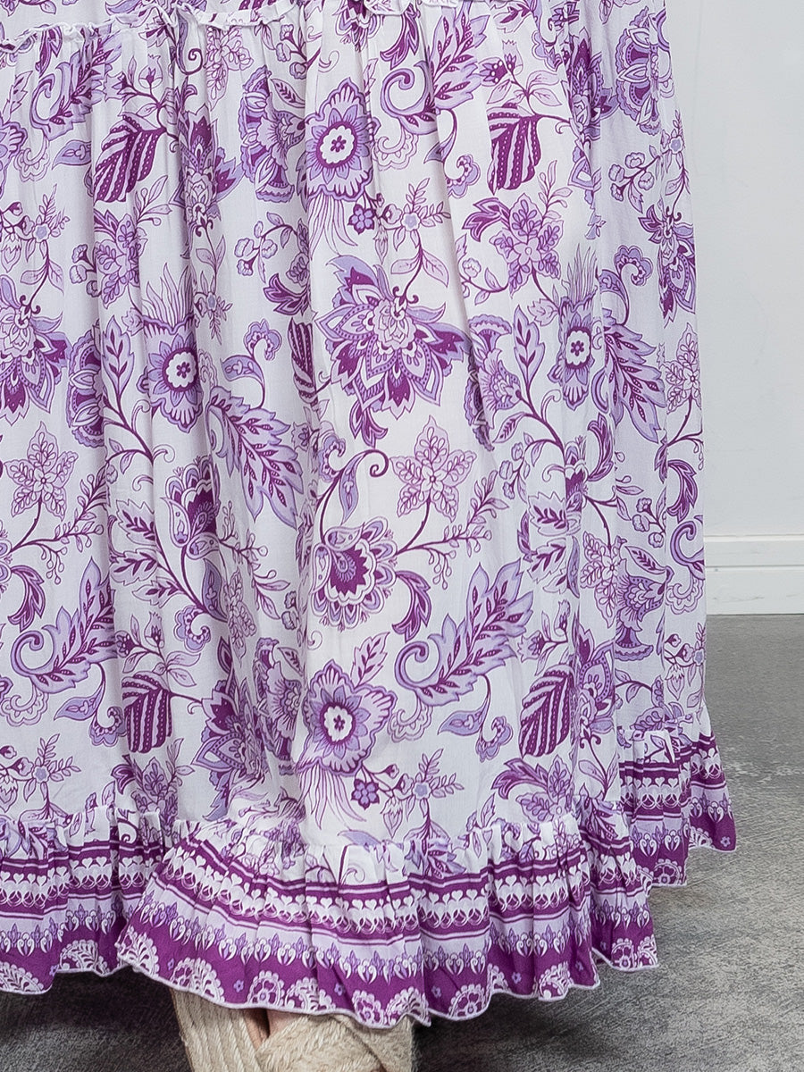 サラッと1枚で大人のリゾートスタイルが完成するパープル花柄ワンピース。