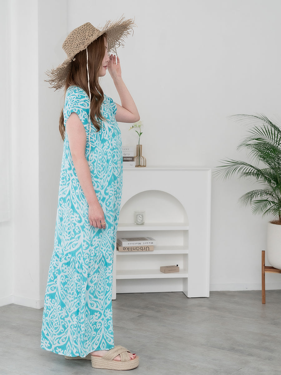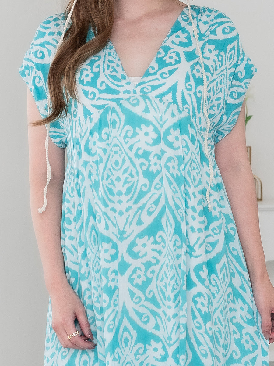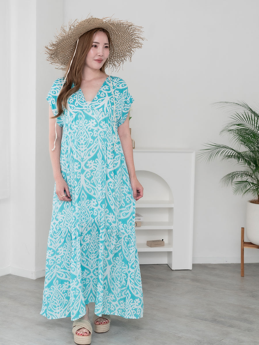 1枚で着映えするキレイなターコイズカラーのオリエンタル柄ワンピース。