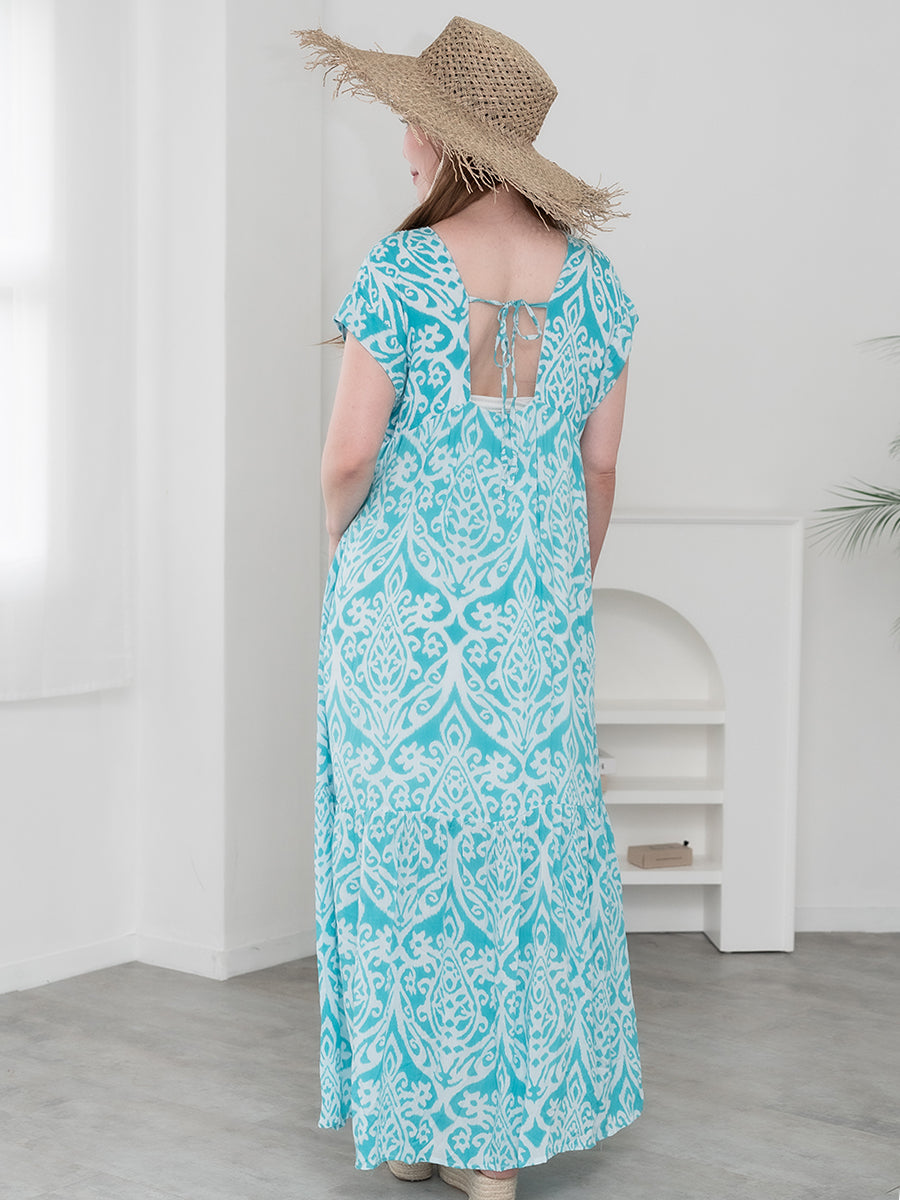 LAUT BLUE(ラウトブルー)フレンチスリーブティアードワンピース/ターコイズオリエンタル柄