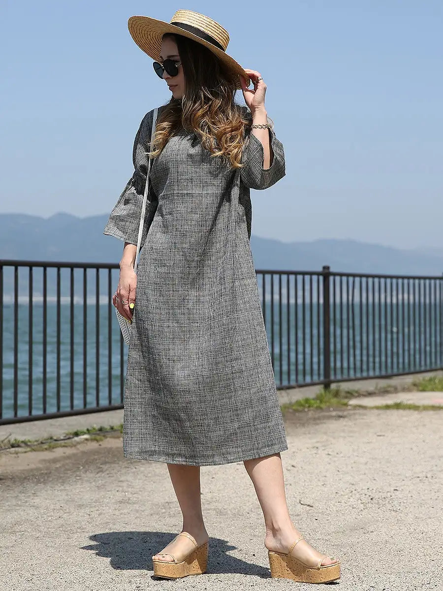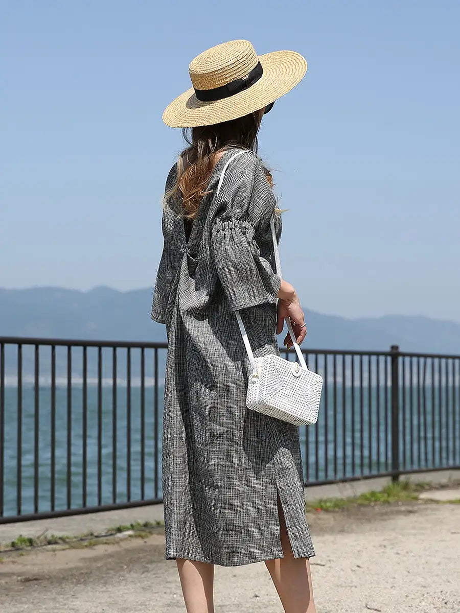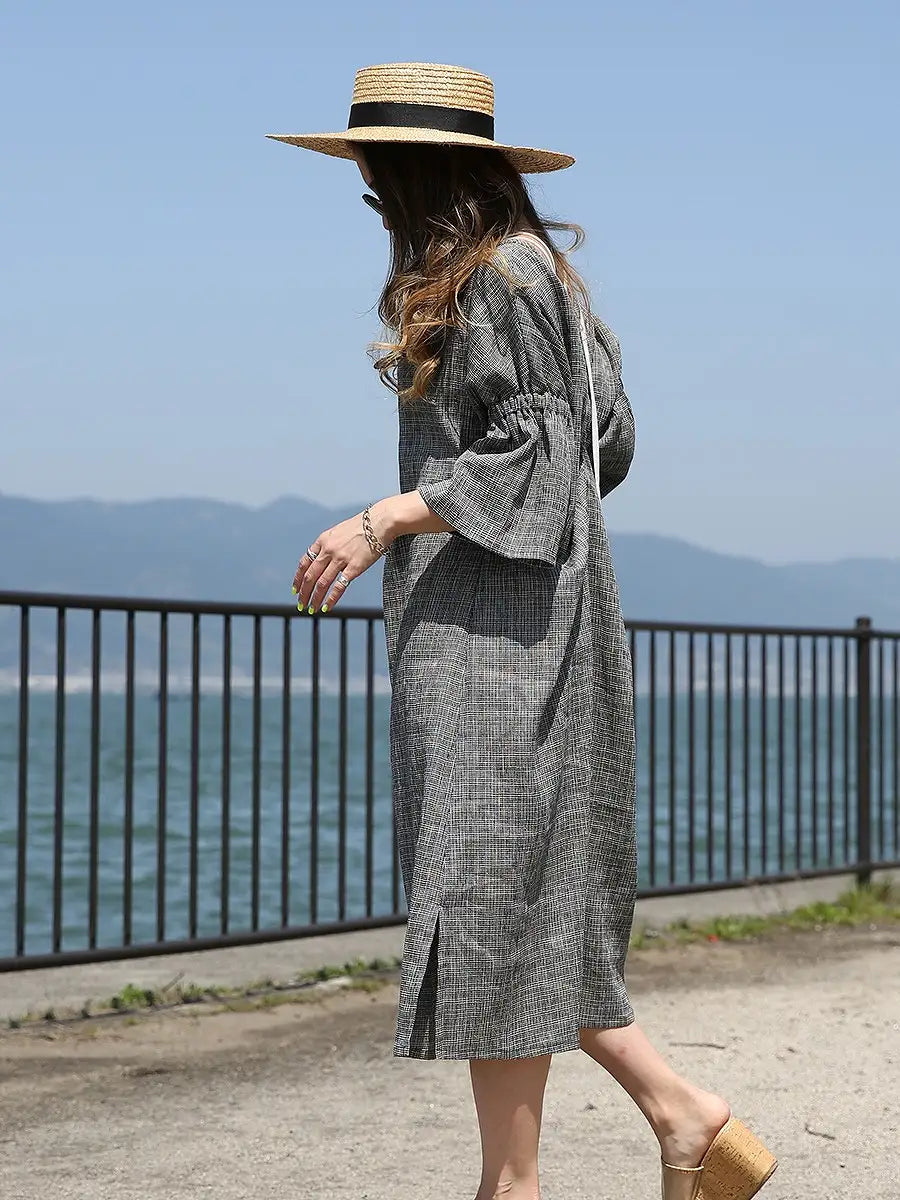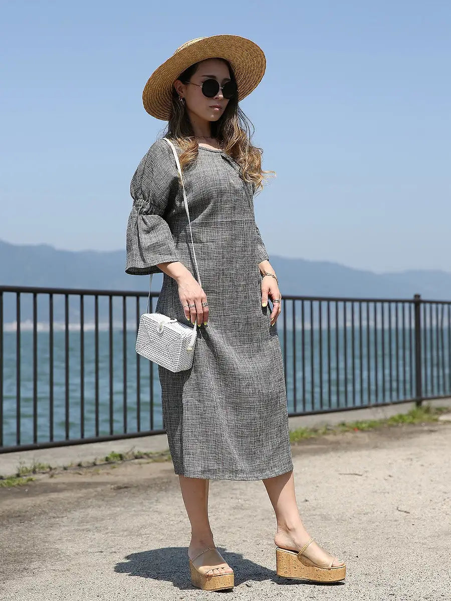 MOLABI(モラビ)近江ちぢみリネンフリル袖マキシワンピース/チェック柄