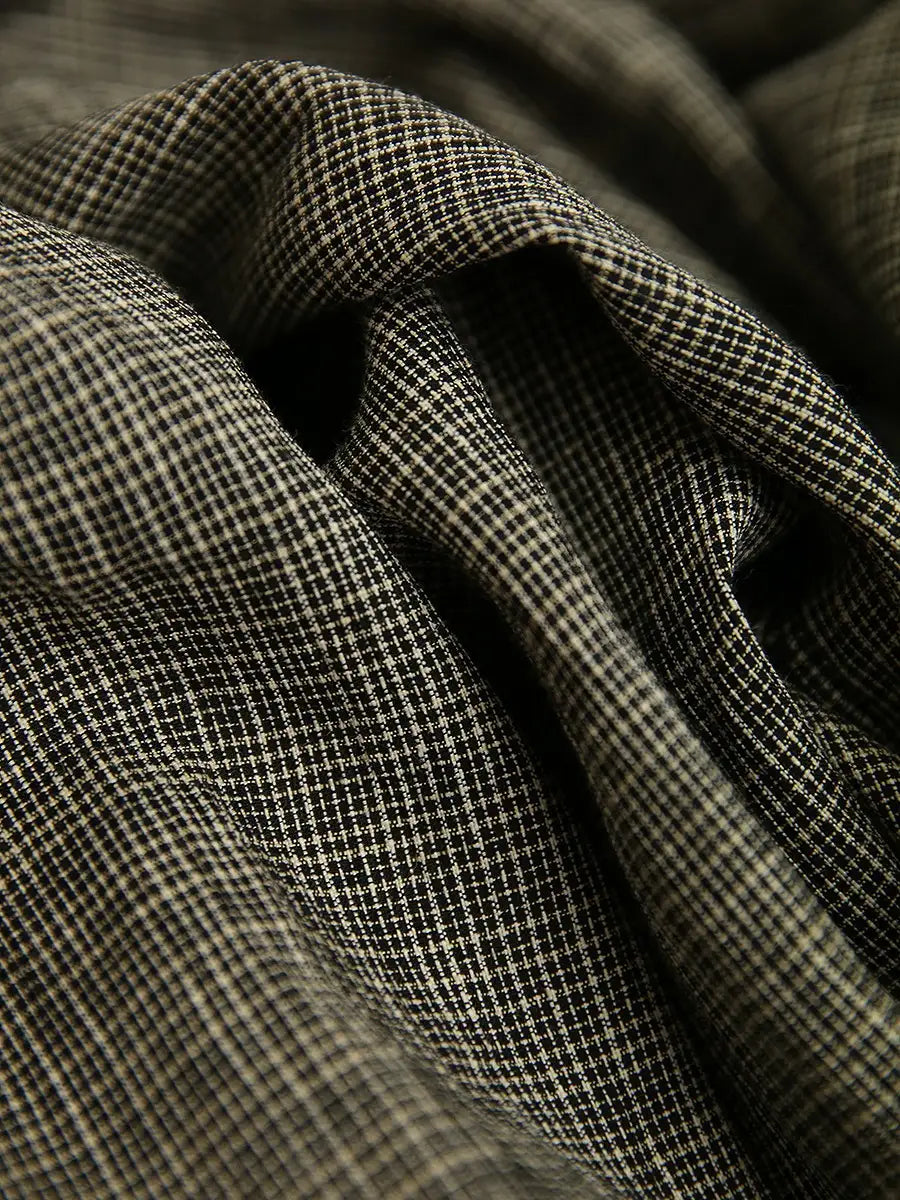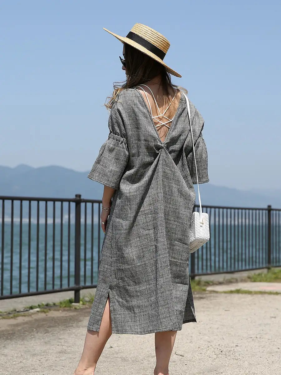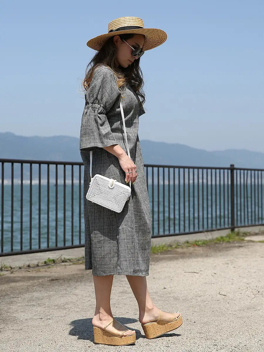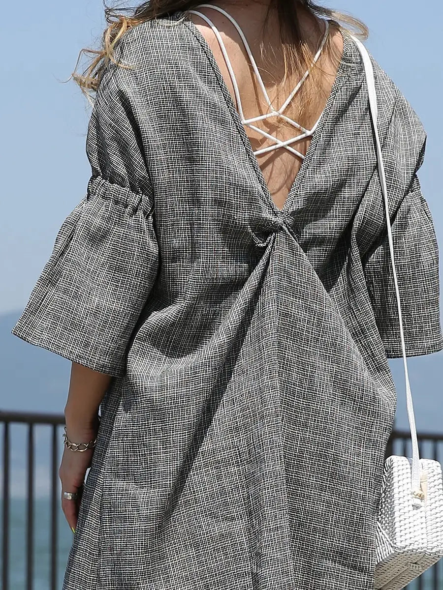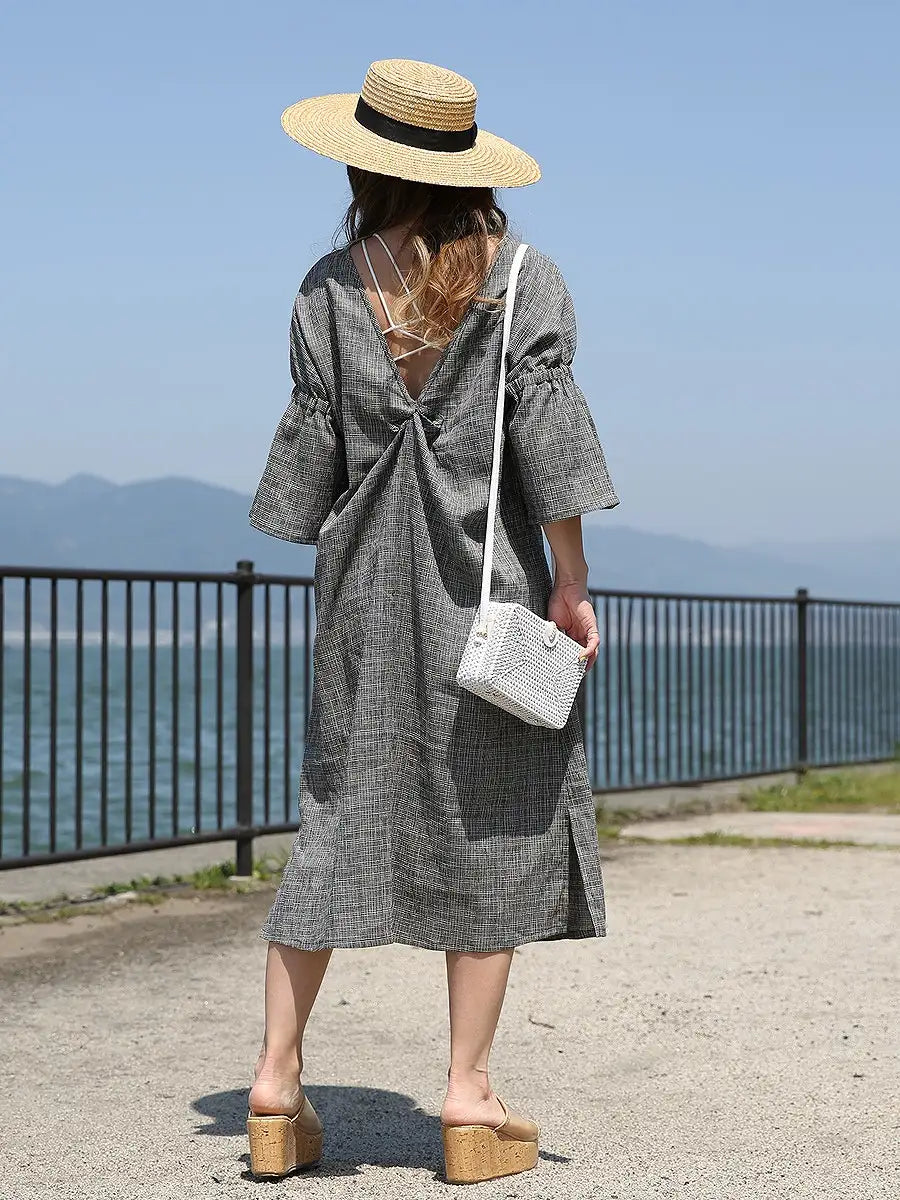 MOLABI(モラビ)近江ちぢみリネンフリル袖マキシワンピース/チェック柄