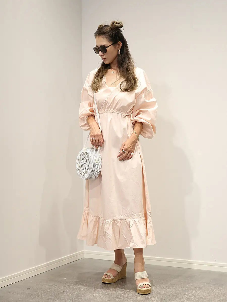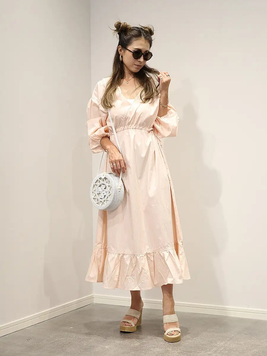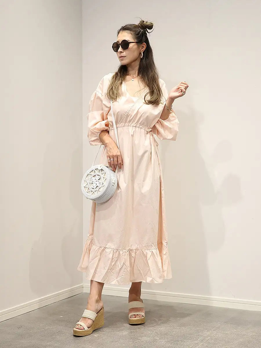 優しいピーチカラーのワンピースは女性らしさ溢れるコーデが完成します。