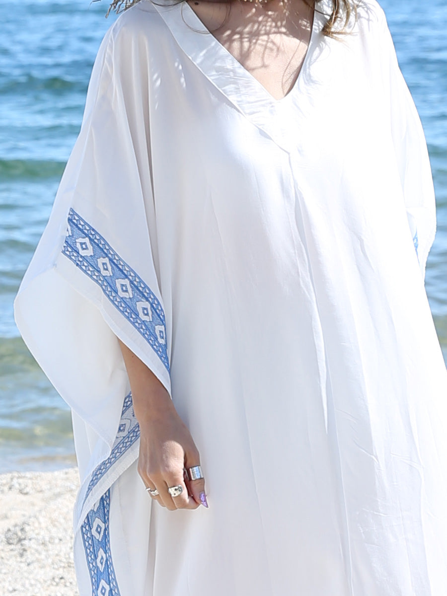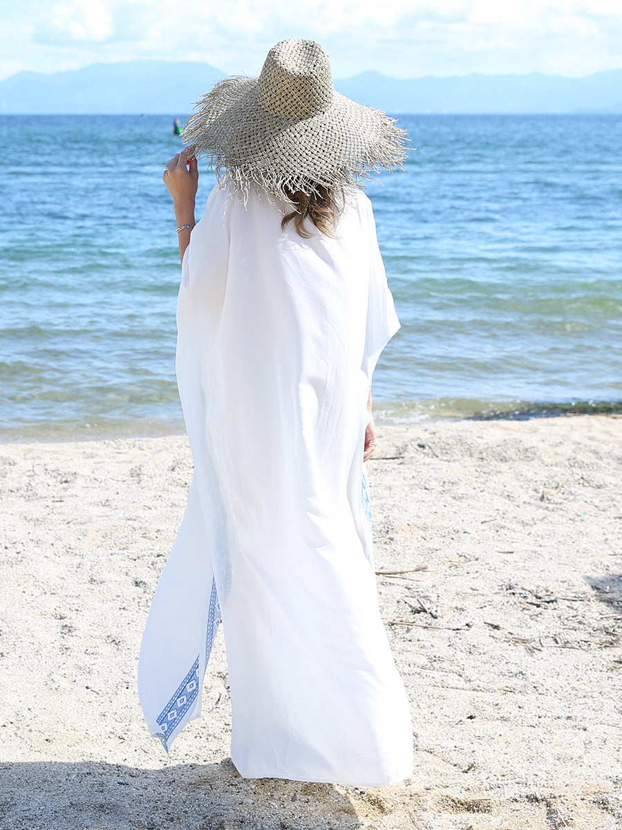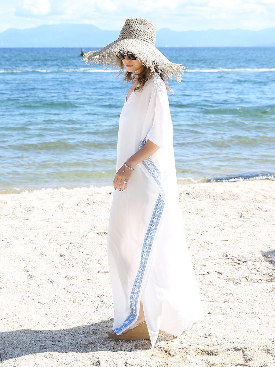 roomy by the sea(ルーミーバイザシー)ドルマンスリーブのカフタンロングワンピースです。 袖口から裾に向かってデザインされた刺繍がアクセントになっています。