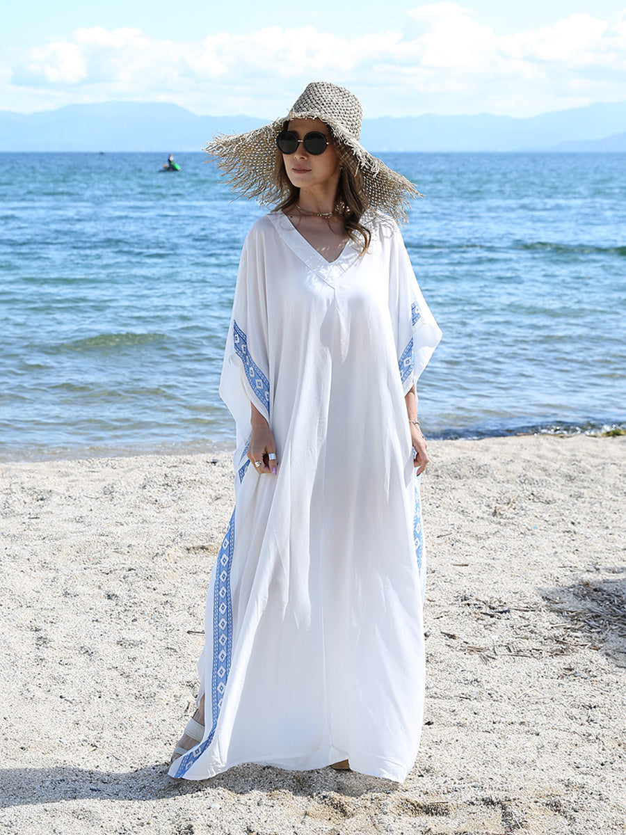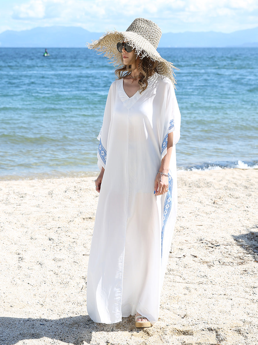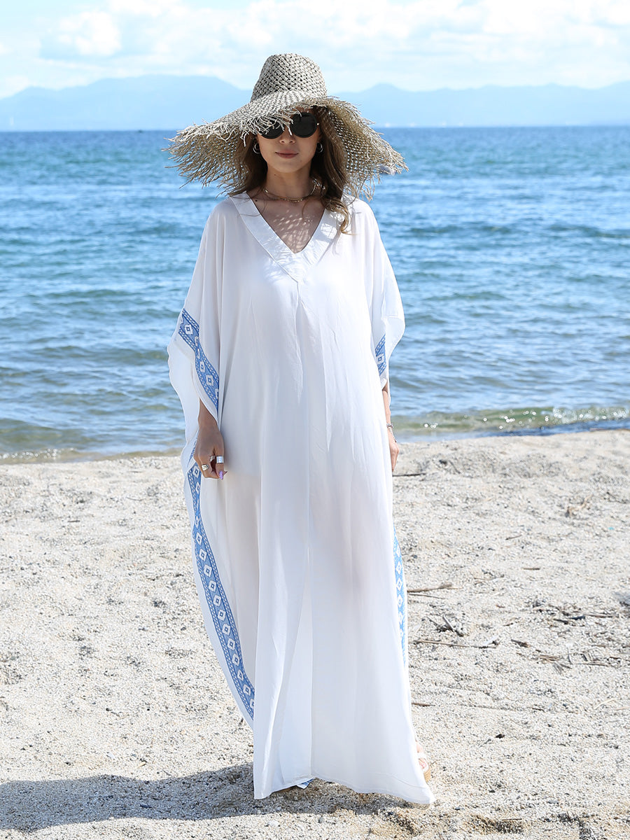 roomy by the sea(ルーミーバイザシー)ドルマンスリーブのカフタンロングワンピースです。 袖口から裾に向かってデザインされた刺繍がアクセントになっています。