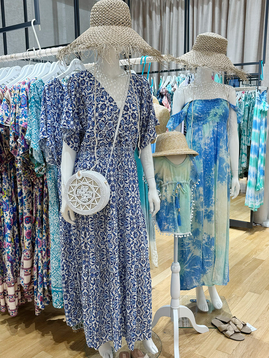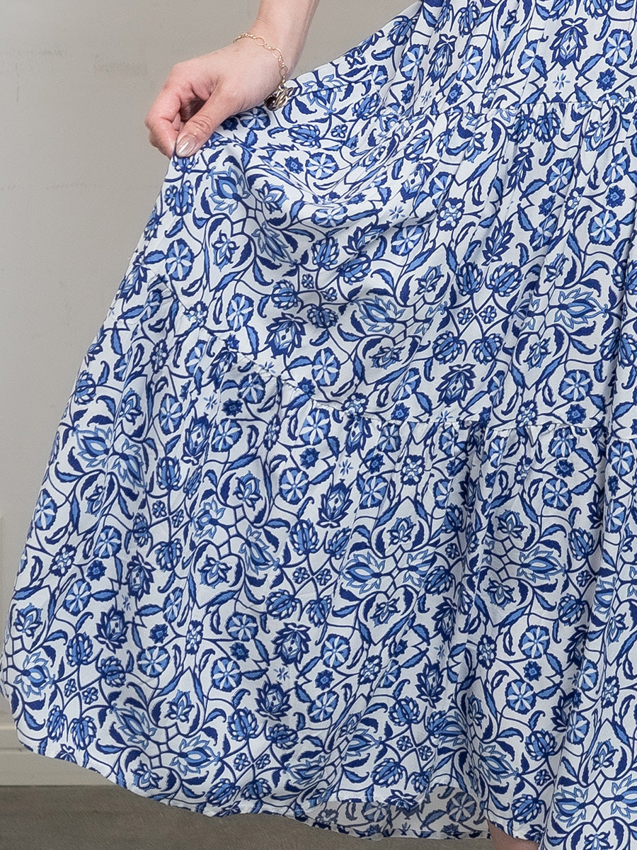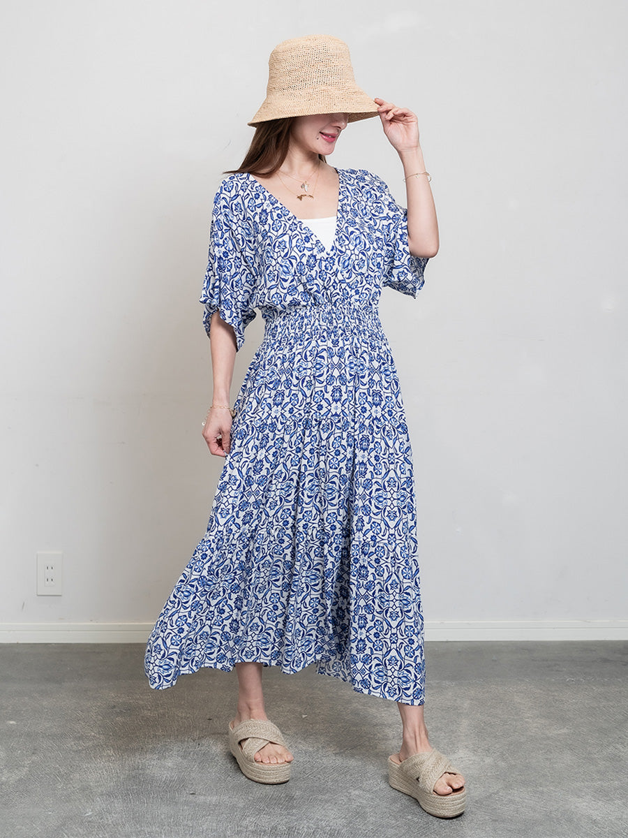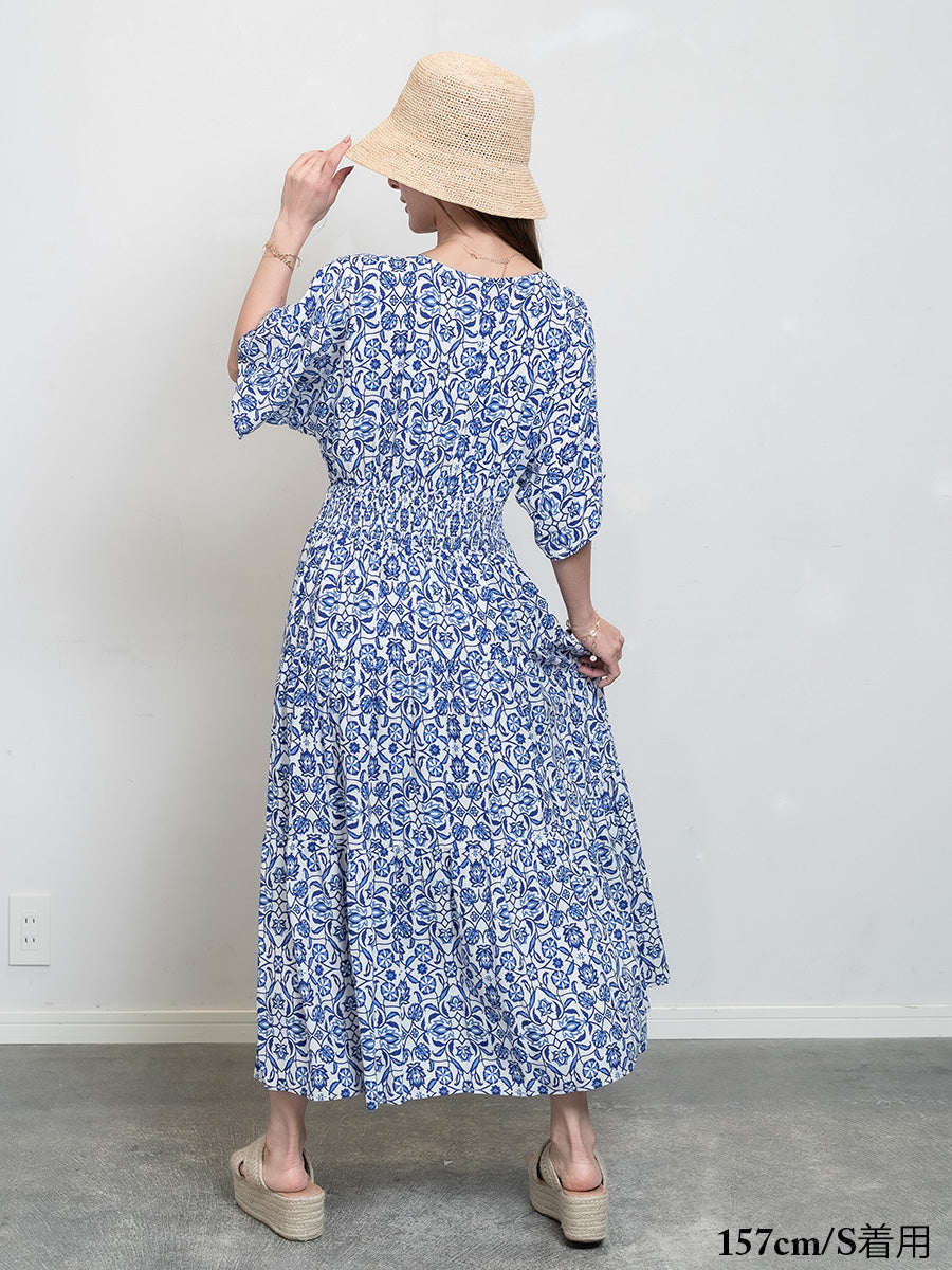 roomy by the sea(ルーミーバイザシー)花柄ブルー半袖フレアワンピース。