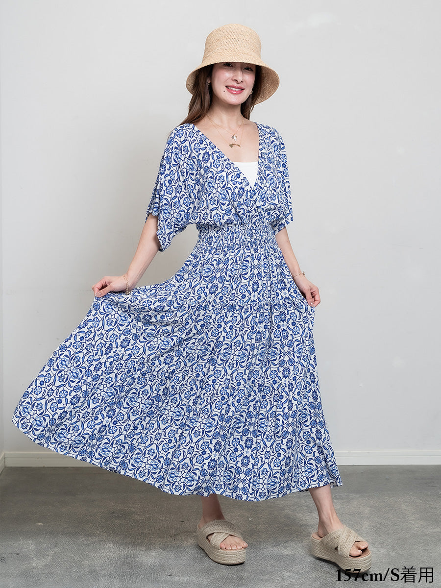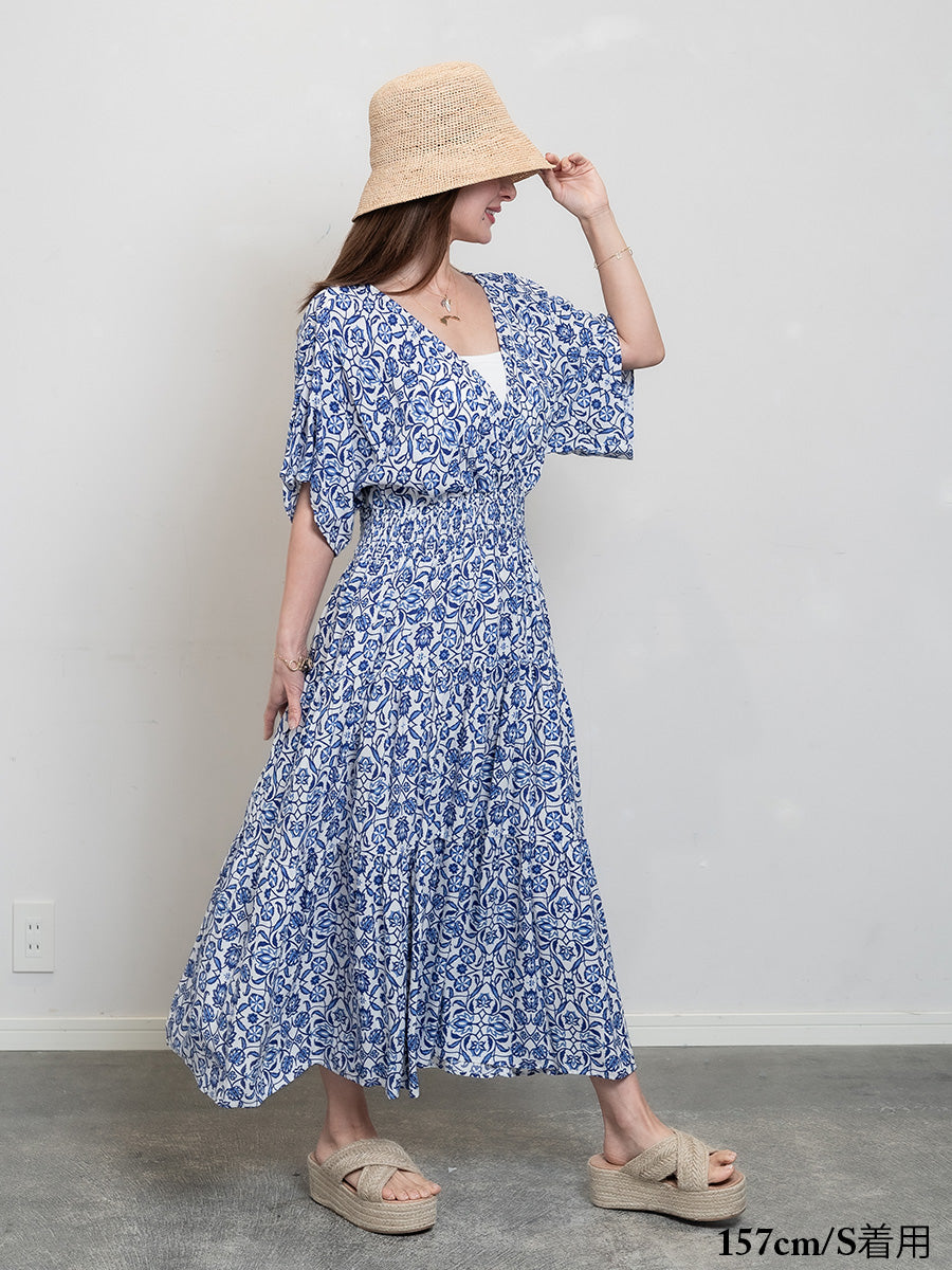 roomy by the sea(ルーミーバイザシー)花柄ブルー半袖フレアワンピース