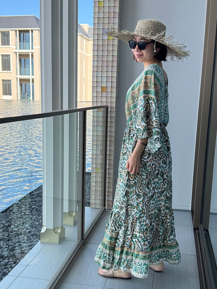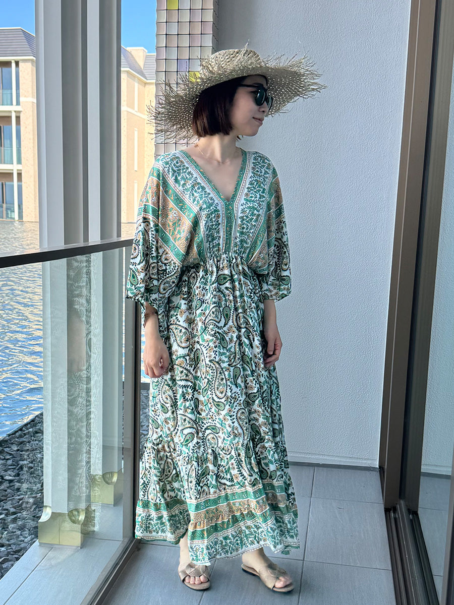 リゾートシーンで着用される場合はストローハットやかごバッグを合わせてリゾートファッションコーデをお楽しみください。