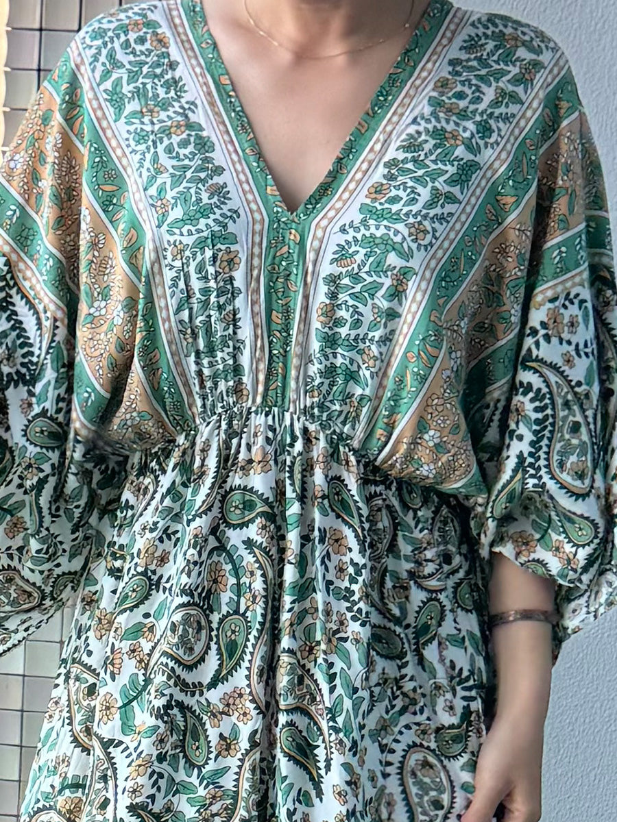 ドルマンスリーブのVネックワンピースはウエストはゴム仕様でストレスフリーな着心地◎